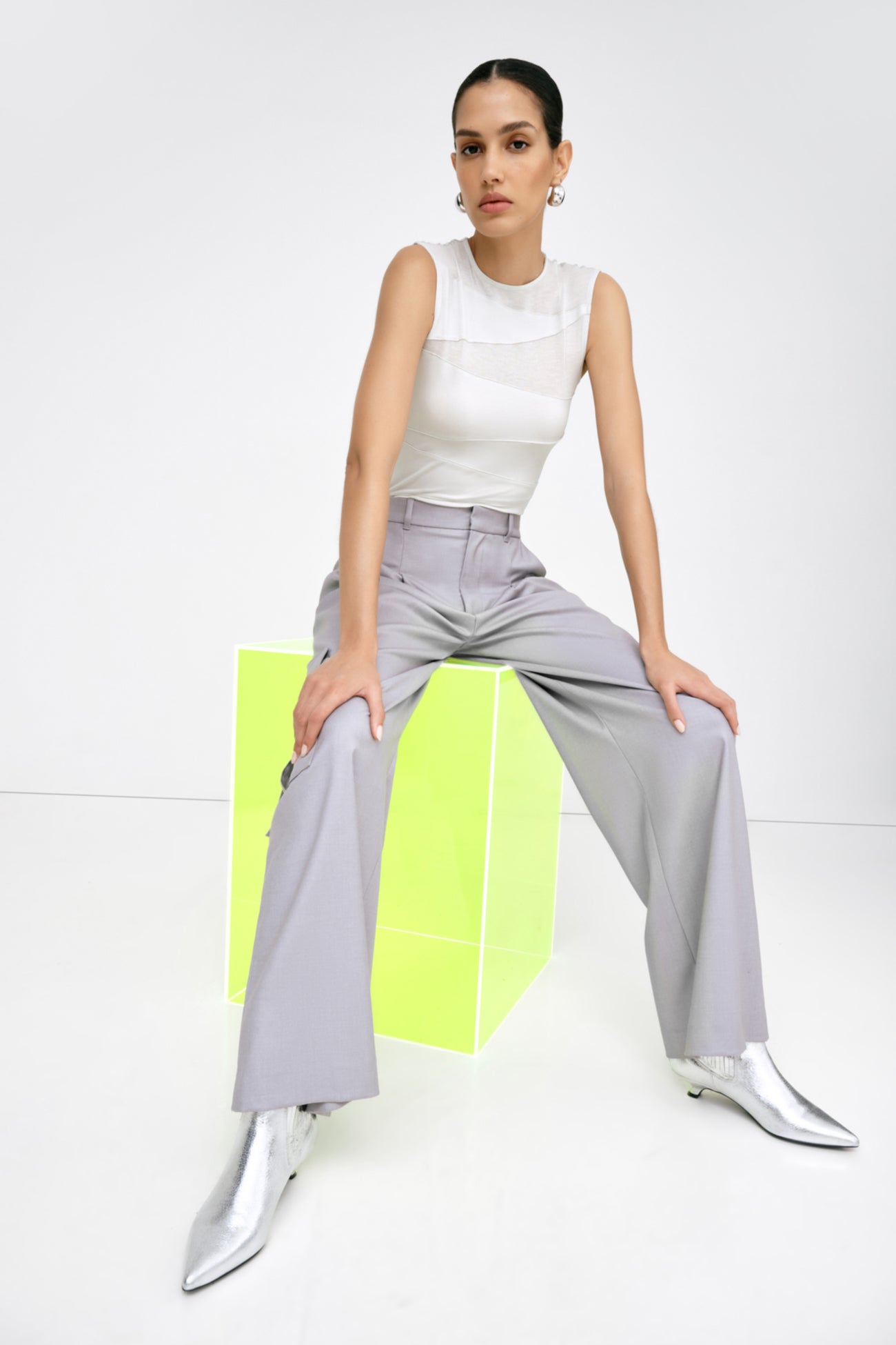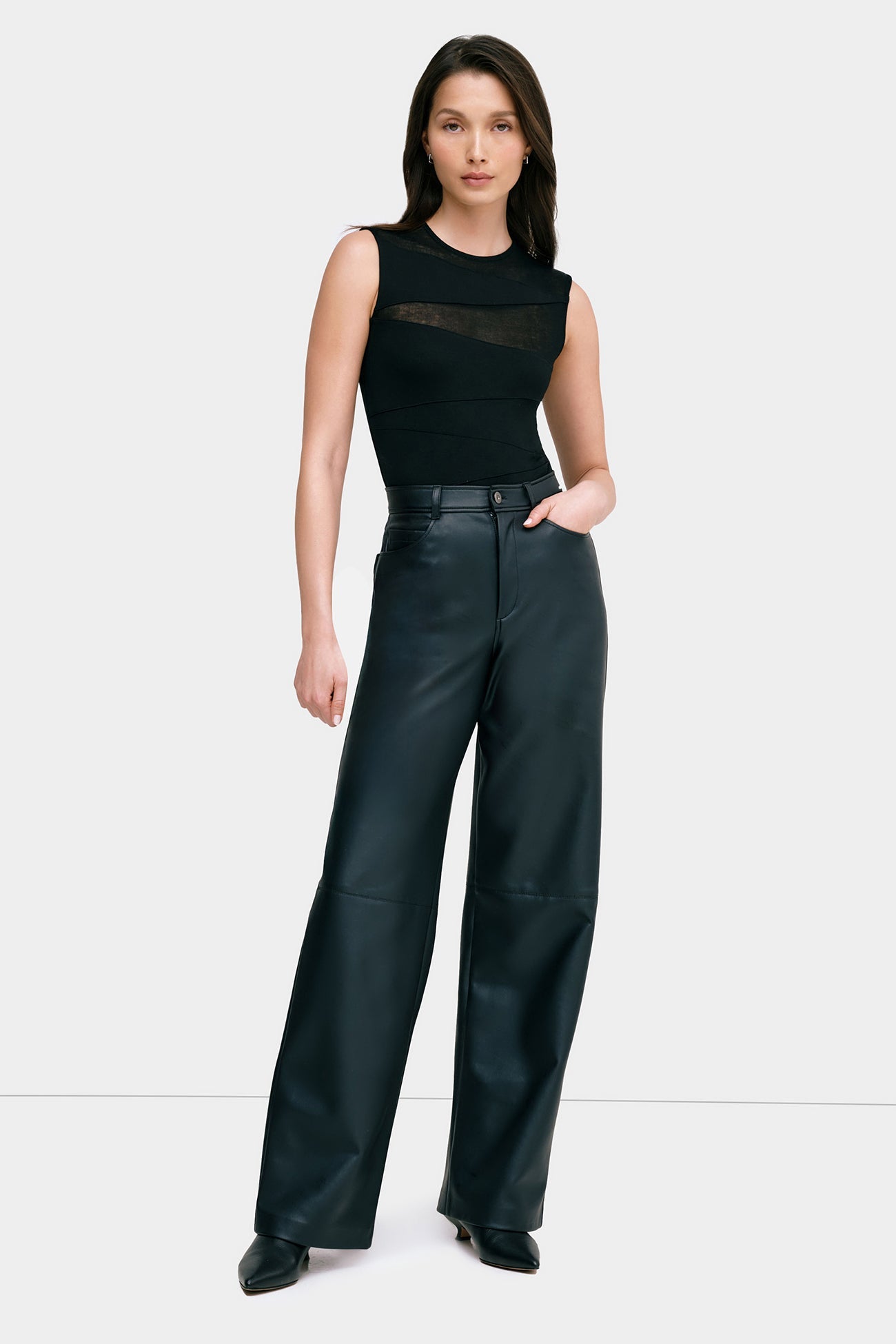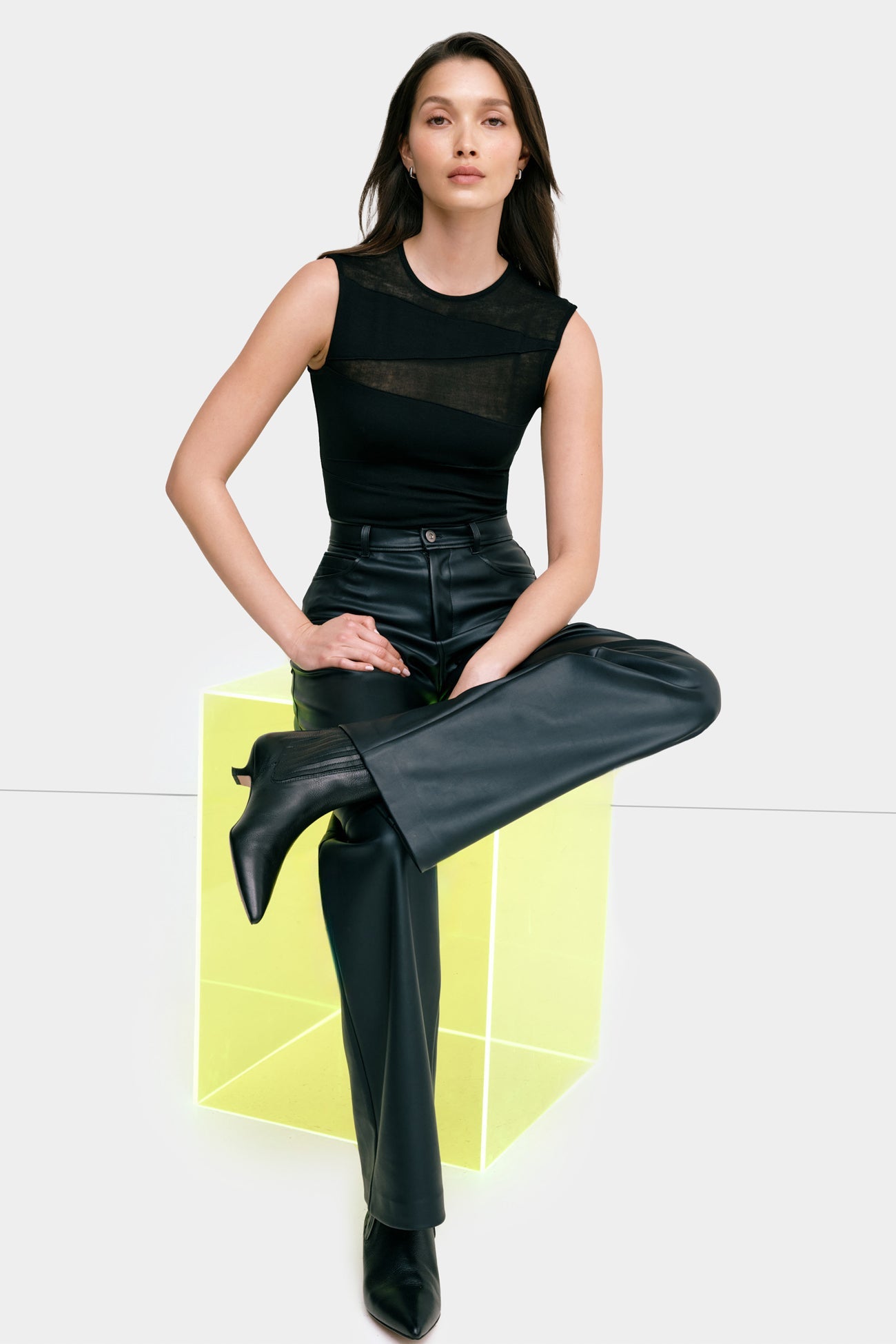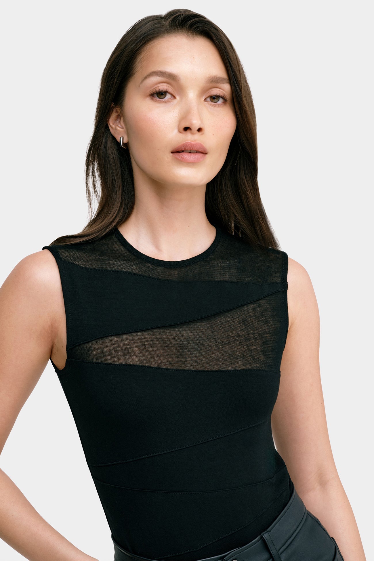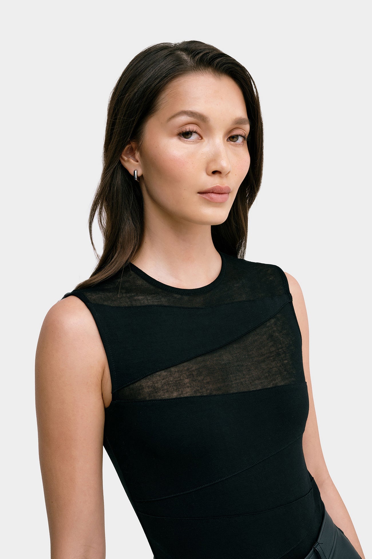 Meet the Aaliyah Bodysuit. our body-hugging essential with a stunning geometry-inspired silhouette. Beginning with her round neckline. Aaliyah features alternating swathes of opaque and sheer European jersey to create contrasting triangular shapes. Perfect for dressing up or down and offering a body-hugging fit. Aaliyah will add a unique touch to any of your looks.
