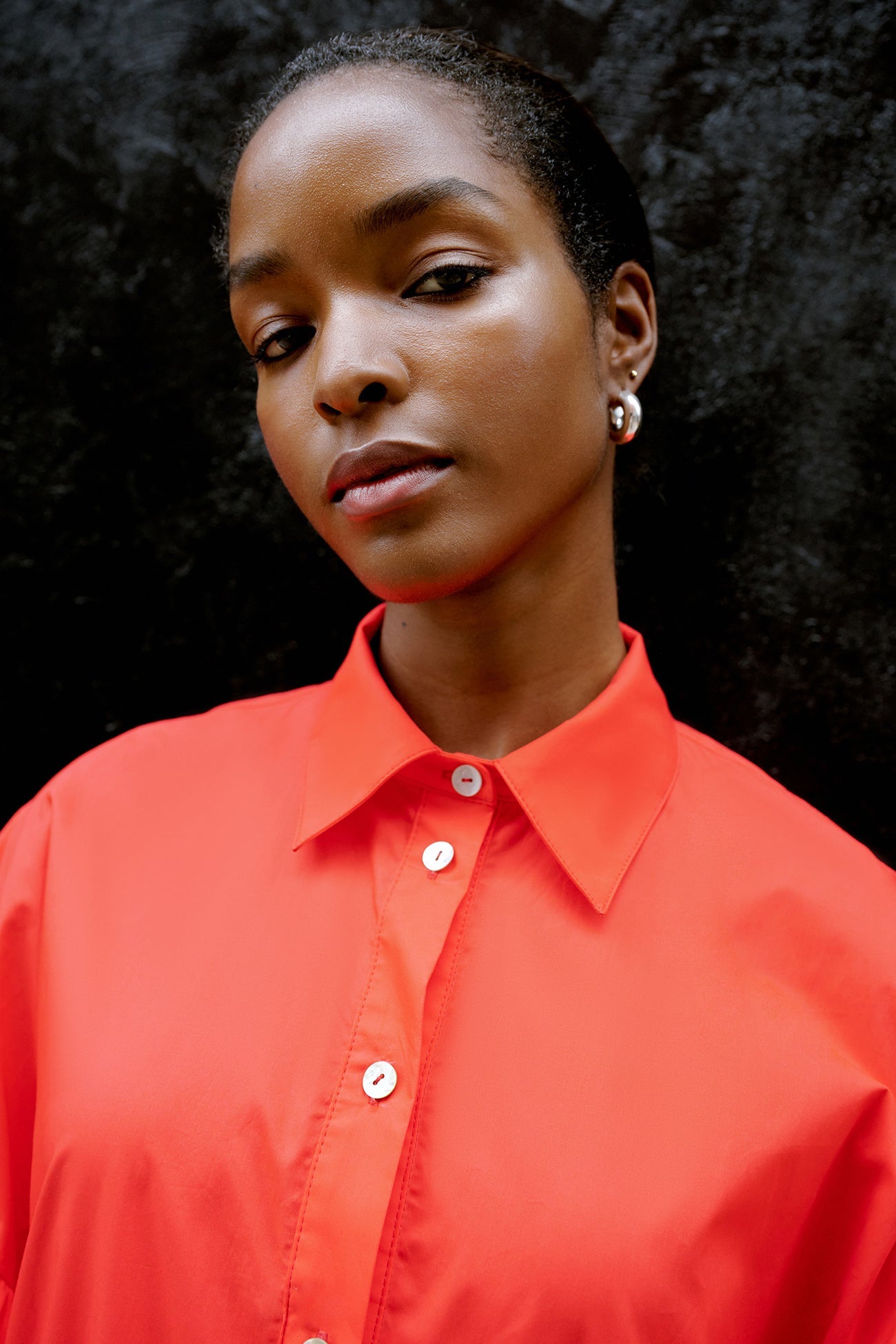 Meet our Ada Dress. the ultimate warm weather staple. She's a midi shirtdress handcrafted from 100% European poplin cotton. featuring pockets and a dropped gathered waistline that falls over your frame with ease. Her clean lines and sharp collar harmonize with dramatic dropped shoulders and full-bodied sleeves. elevating your style for any occasion.SPLIT