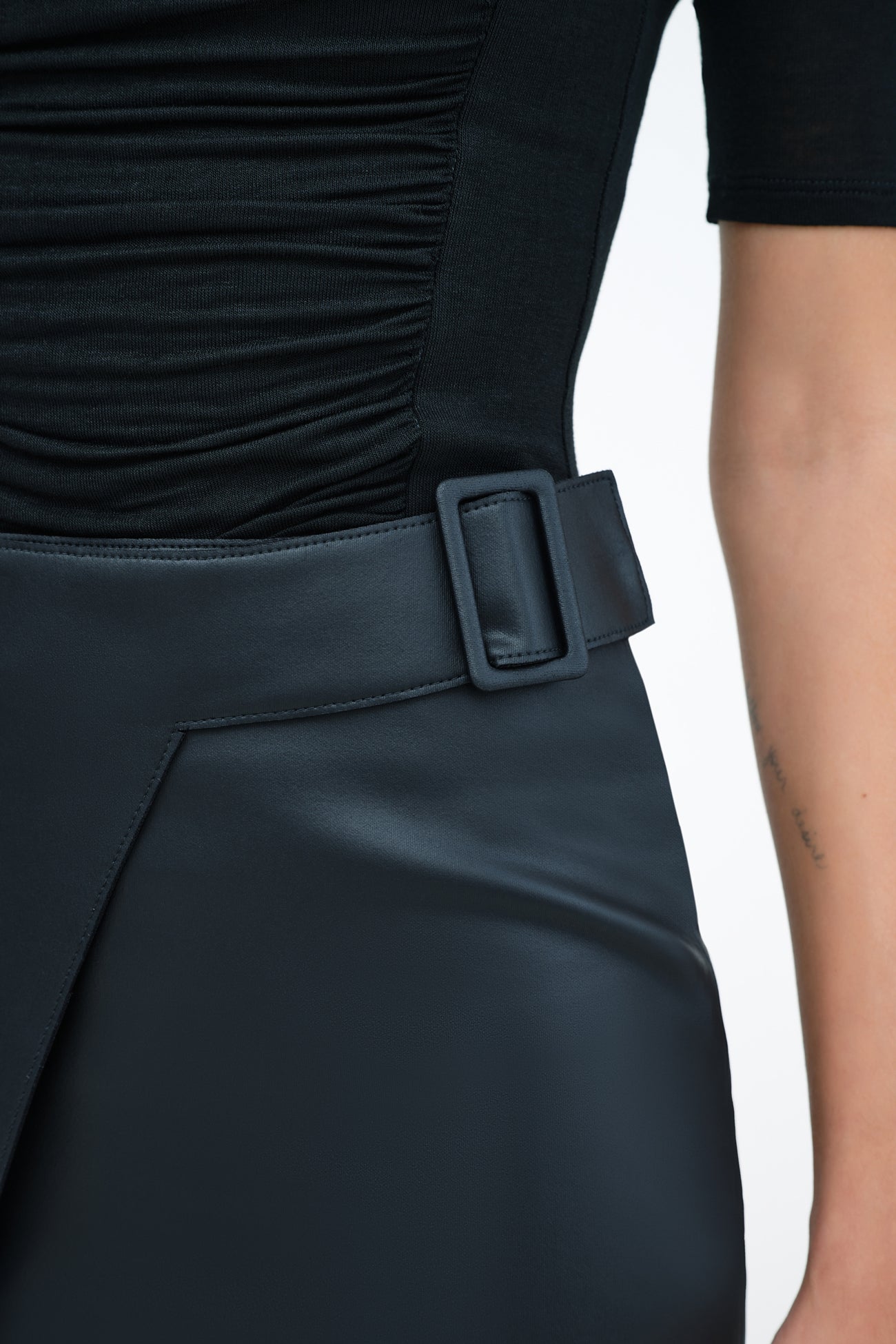 The skirt to wrap around your life. Fashioned from stretchy vegan leather. our Adrienne hugs your figure and features diagonal lines on front and back for unique visual interest. A hidden side slit offers additional movement and she fastens with a buckled belt. Day-to-night worthy.SPLIT