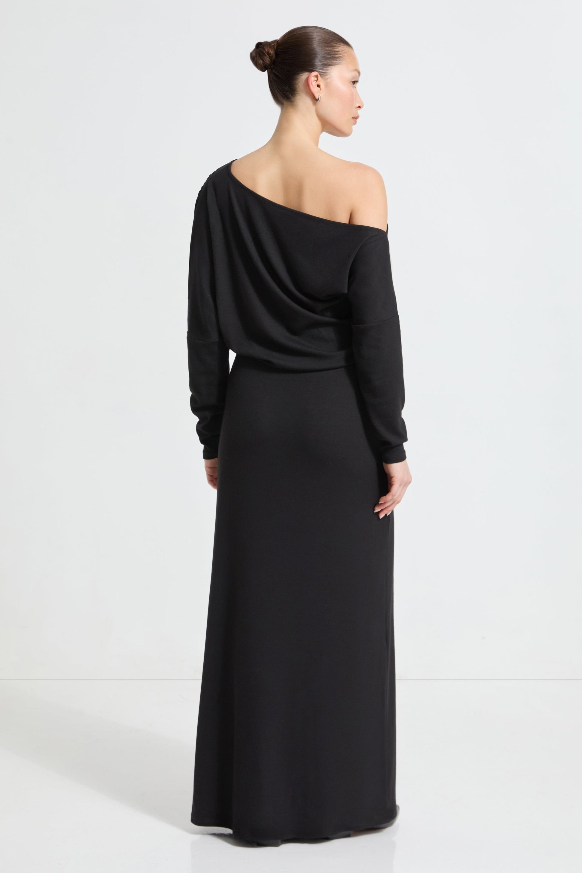 Our Amia Maxi Dress is a floor-sweeping maxi from soft European ribbed jersey that masterfully balances comfort and sophistication. Her relaxed. one-shoulder cut extends into long sleeves with a gathered waist for structure. making her a chic choice for either daytime moments or dinner parties. and everything in between.SPLIT