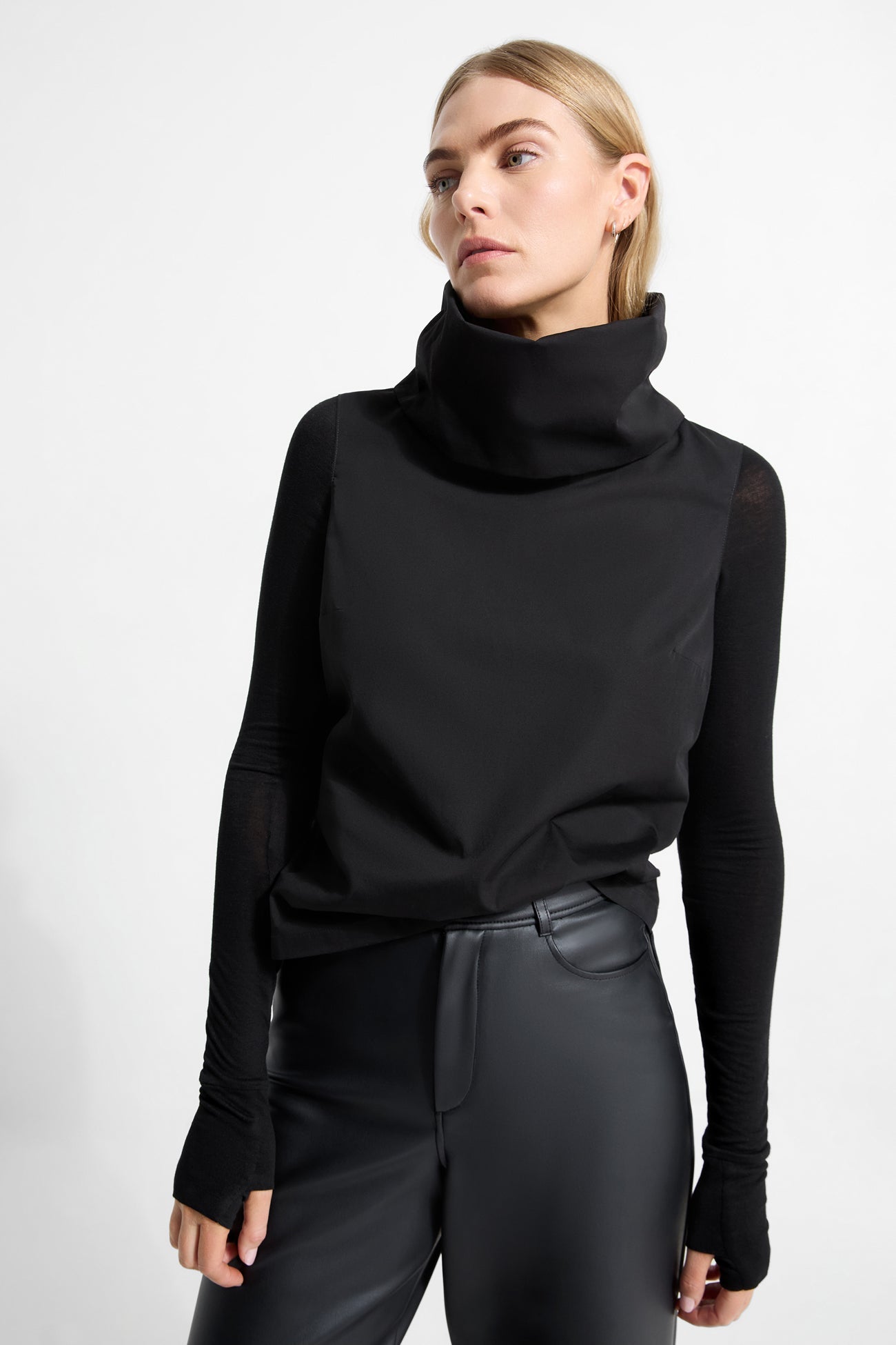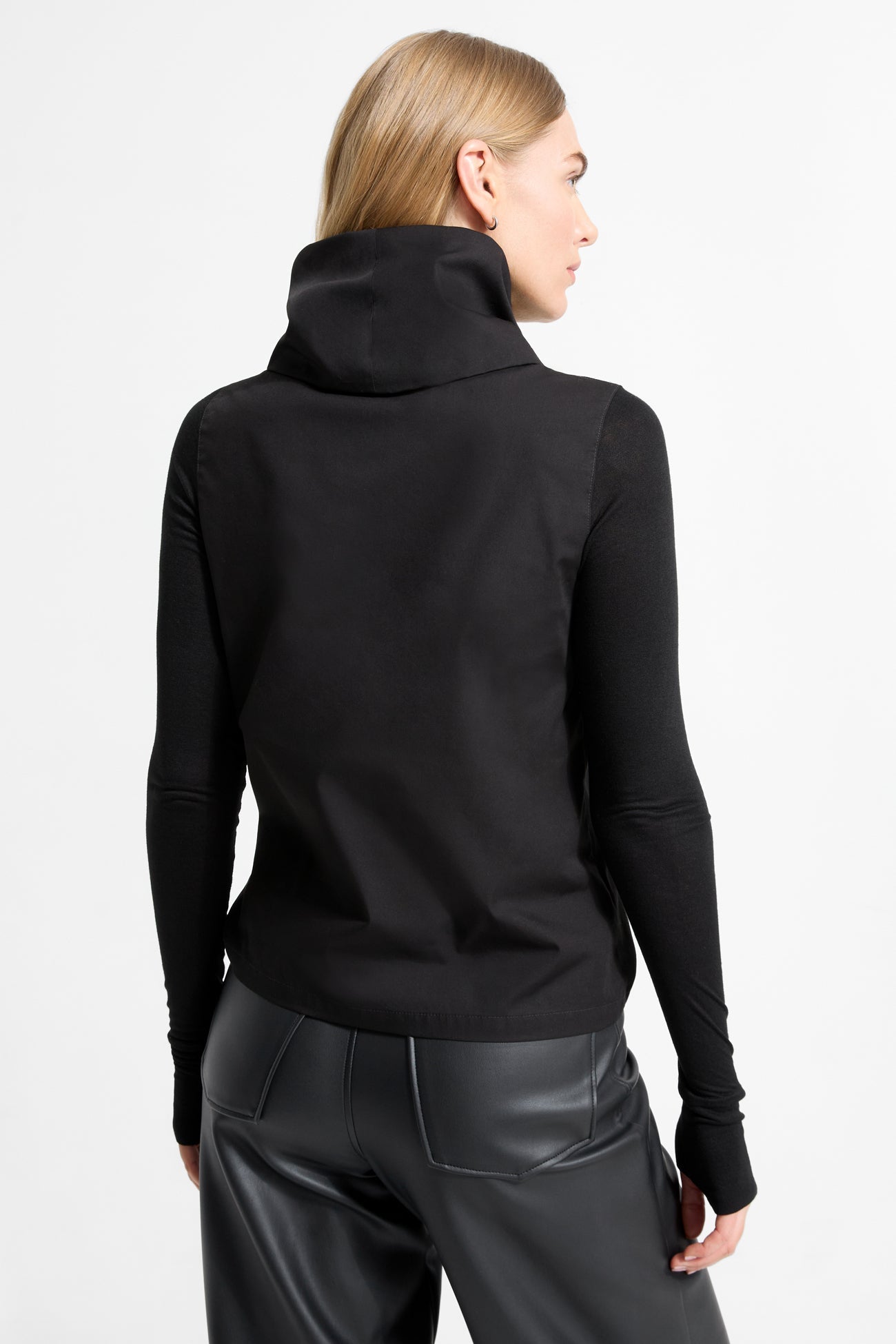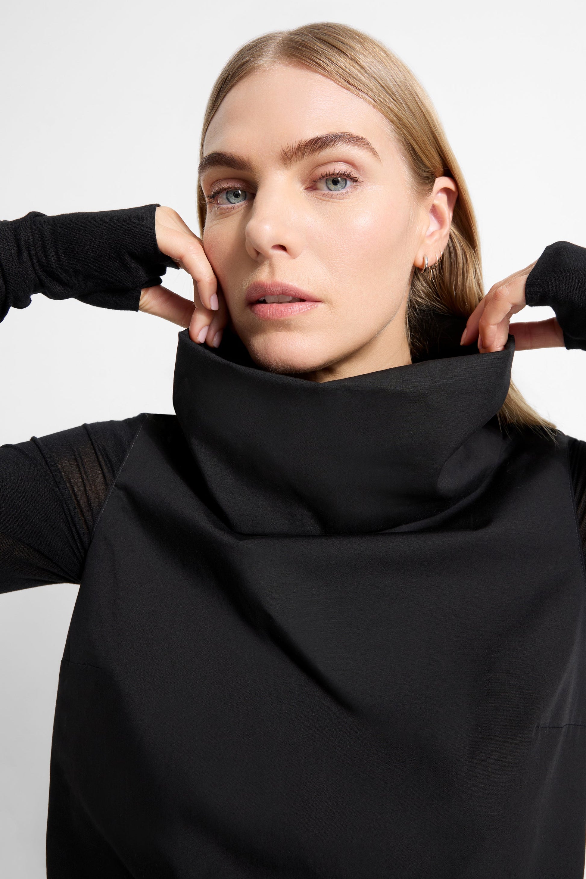 Meet our best-selling Atlantic. a reimagining of beloved Marcy that you can wear year-round. Starting with her sister's boldly oversized collar (which can be worn folded over or stood up for full volume). Atlantic adds sleeves in light. sheer European jersey (with thumbholes). Her main body is fashioned from crisp European poplin cotton in a relaxed fit. ensuring a structured yet airy feel that you can happily live in.SPLIT