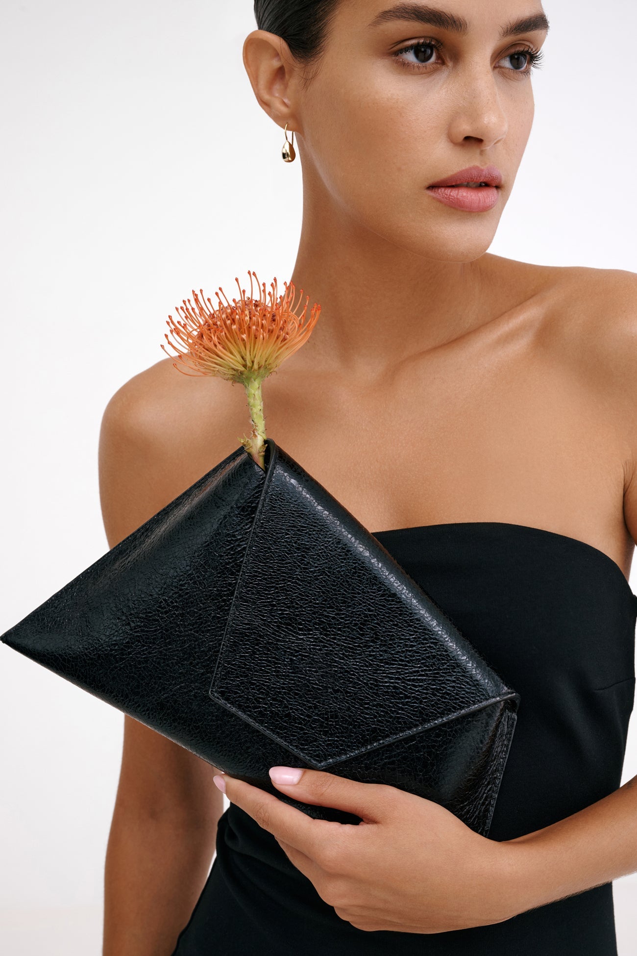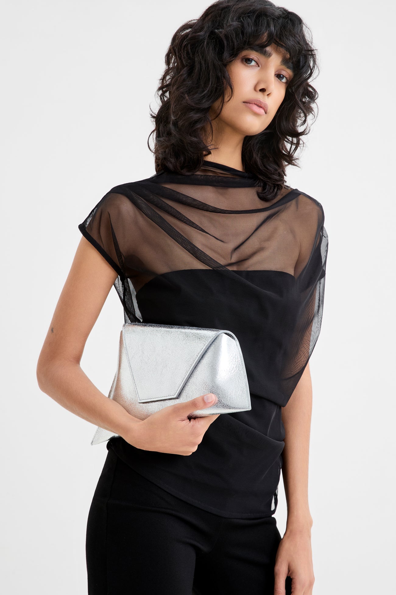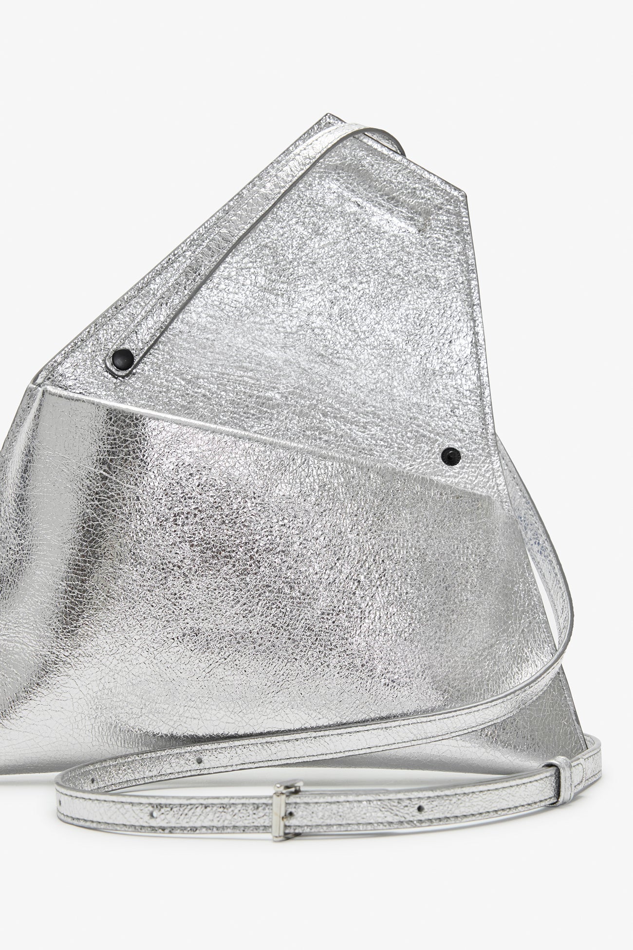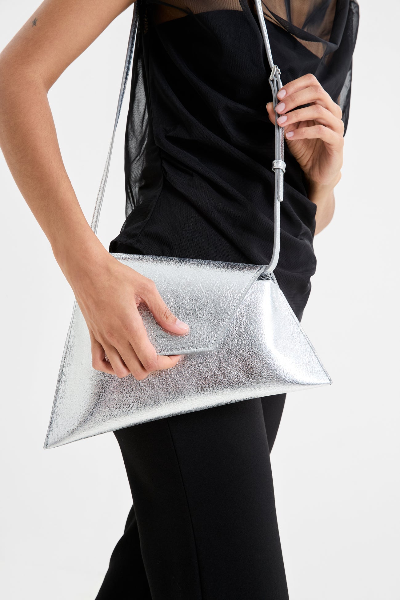 In a statement-making mood? Austin always comes through in the clutch. Her asymmetric trapezoid silhouette. crafted from distressed European leather with a metallic crinkled finish. opens to a main compartment with one pocket for your essentials. while snapping shut with a magnetic closure. Wear Austin crossbody or carry her as a clutch—her removable strap leaves it up to you.SPLIT