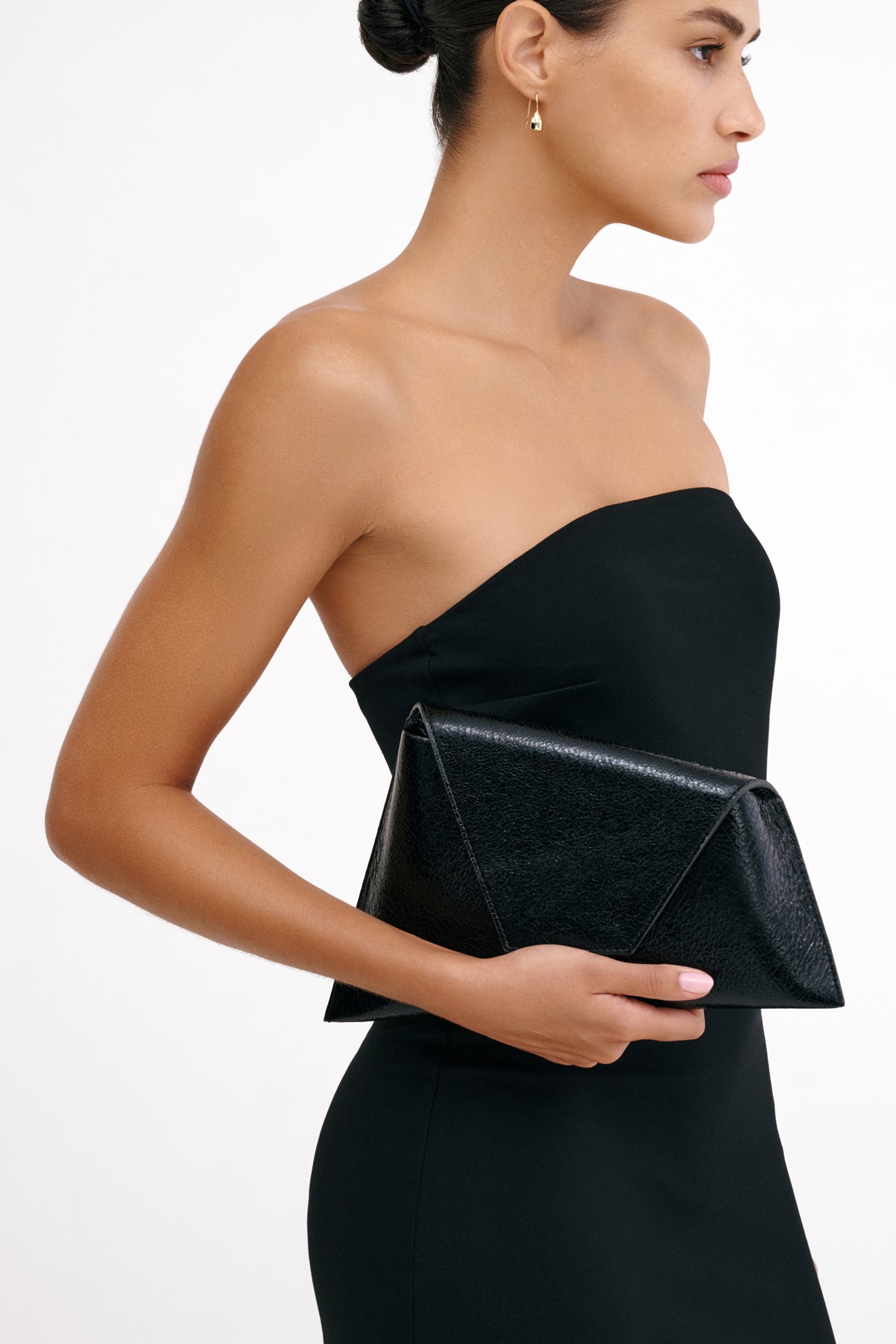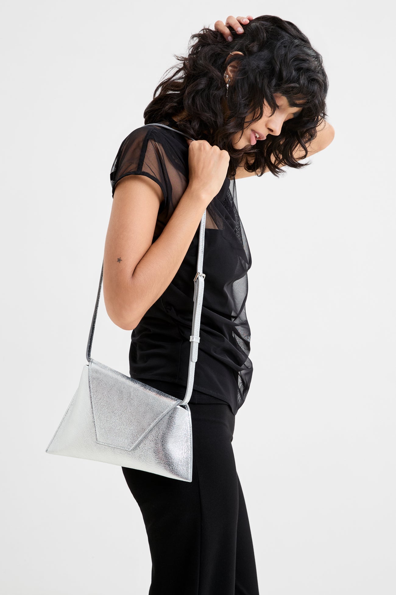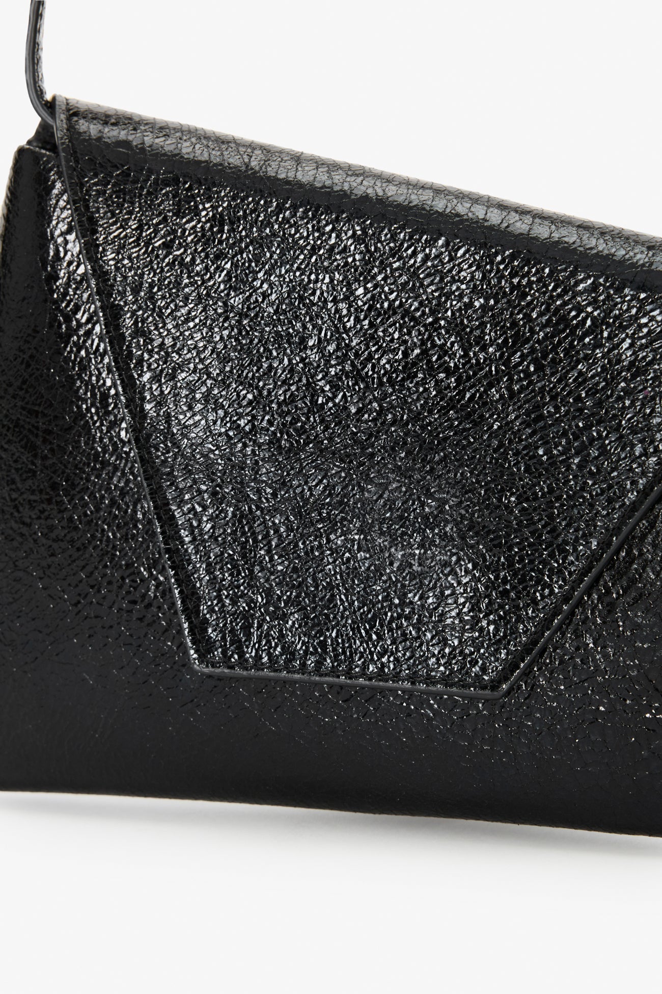 In a statement-making mood? Austin always comes through in the clutch. Her asymmetric trapezoid silhouette. crafted from distressed European leather with a metallic crinkled finish. opens to a main compartment with one pocket for your essentials. while snapping shut with a magnetic closure. Wear Austin crossbody or carry her as a clutch—her removable strap leaves it up to you.SPLIT