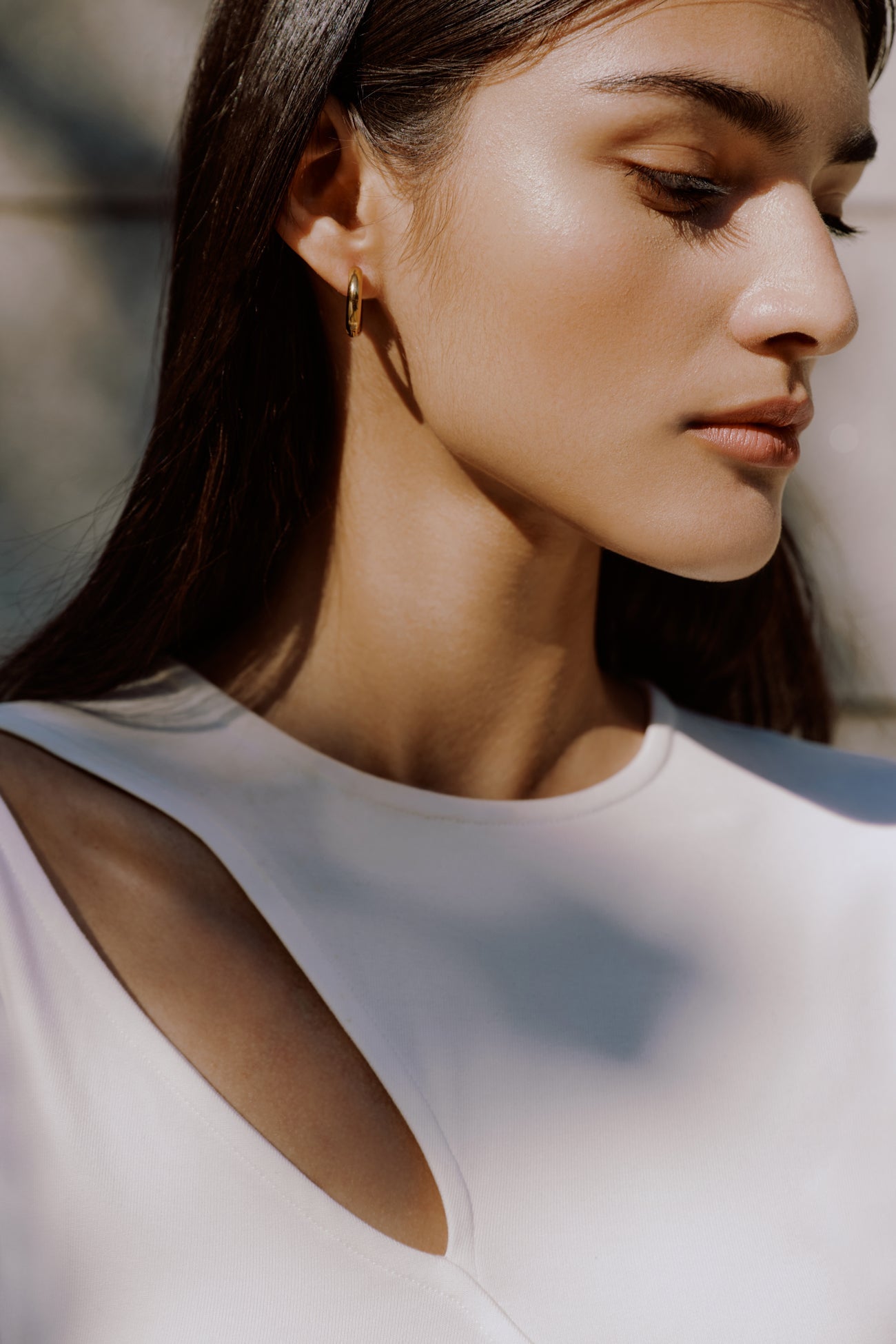 Classic closet staple with a dash of daring. Our Ayla elevates the t-shirt dress with an asymmetric shoulder cutout. ending in a diagonal seam that runs down to the waist for a wrap-inspired effect before relaxing into an A-line midi skirt. From soft. sustainable European jersey (slightly thicker for the off white colorway to offer more coverage). she features elbow-length sleeves and waist-contouring gatherings.SPLIT