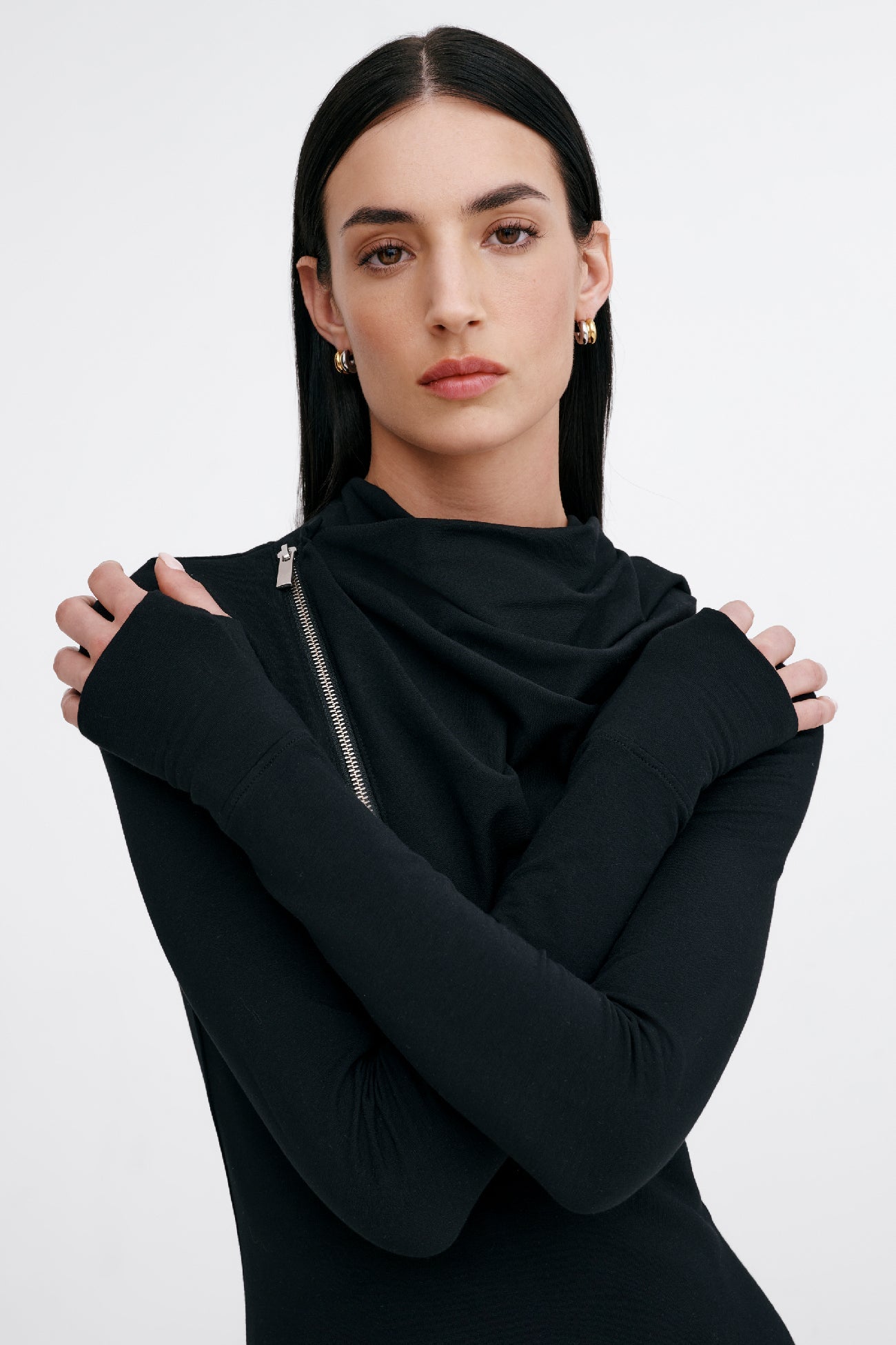 Embrace your sleek side in our Broome Dress. a modern silhouette from soft. lightweight & breathable European French Terry. Diagonal seams at her hips and shoulder add geometric flair to her design. while a diagonal zip punctuates her high. draped cowl neckline. Finished with thumbholes at the sleeves and a center-back slit for comfort. Broome is a must-have for cooler temps.SPLIT