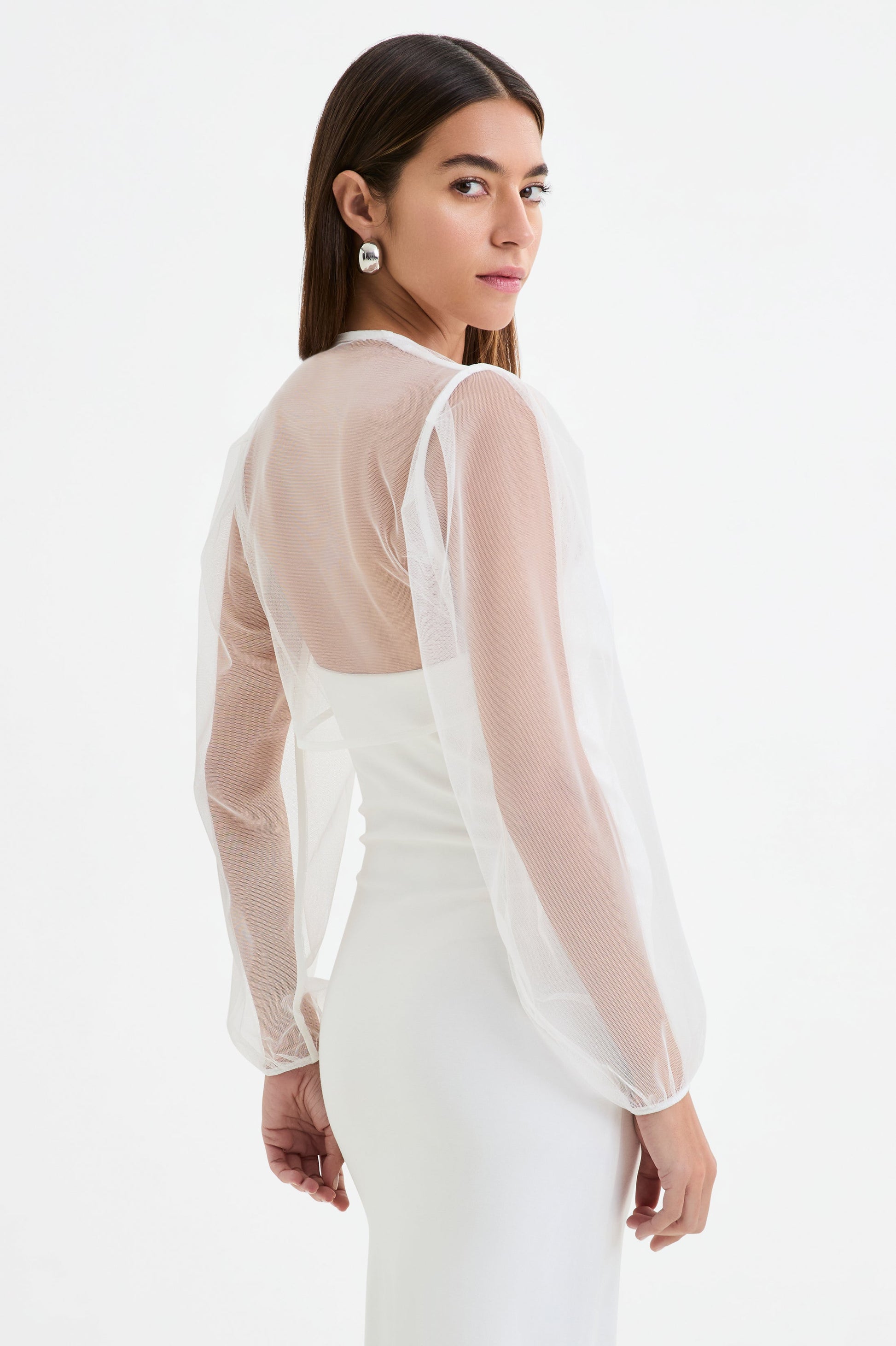 A transparent flourish with high style. our Calliope Bolero is an ideal accessory for changeable temps. Fashioned from soft mesh. Calliope combines lightness and volume for a dash of drama with her flowing bouffant sleeves. Her seams have otherwise been kept to a minimum to highlight the clean lines. Calliope will add elegance to any evening wear. SPLIT