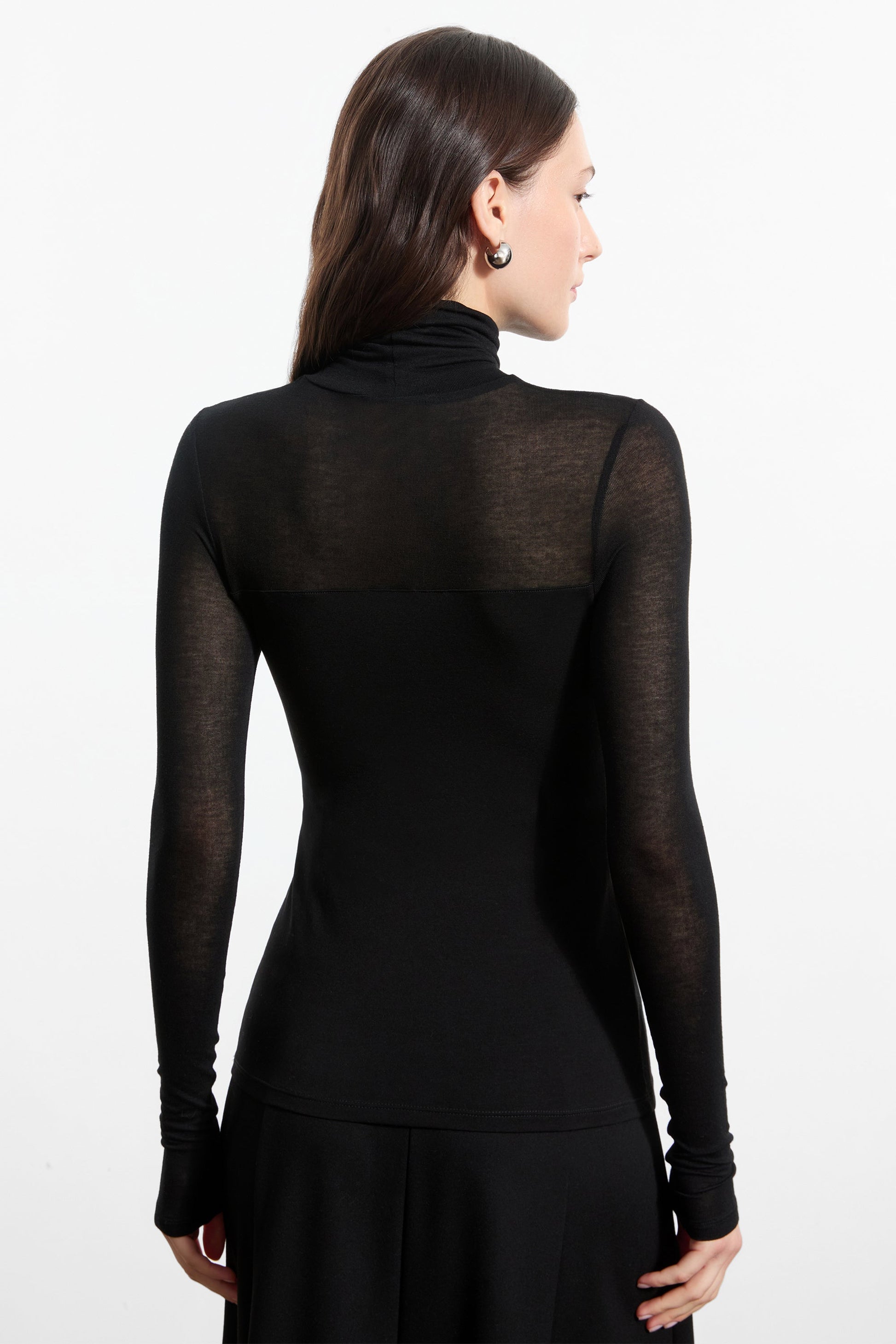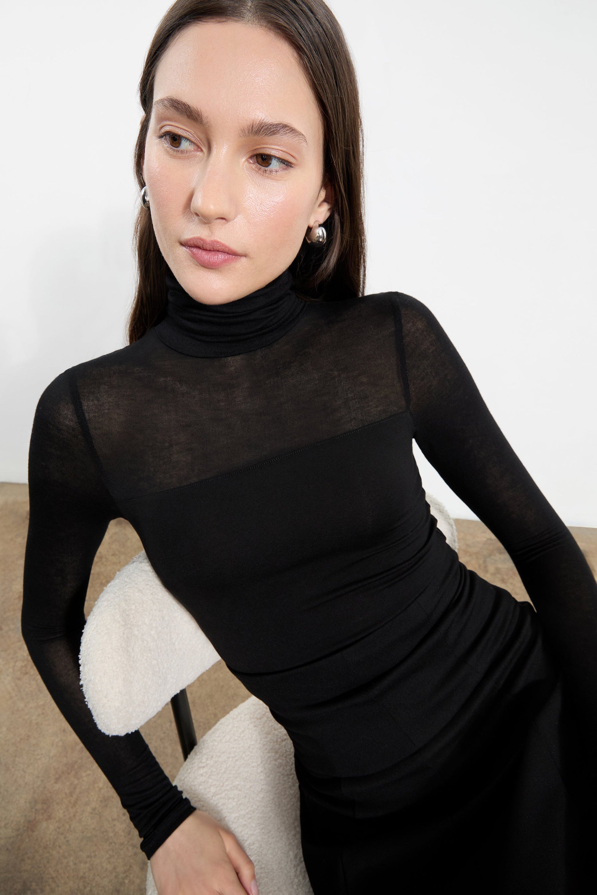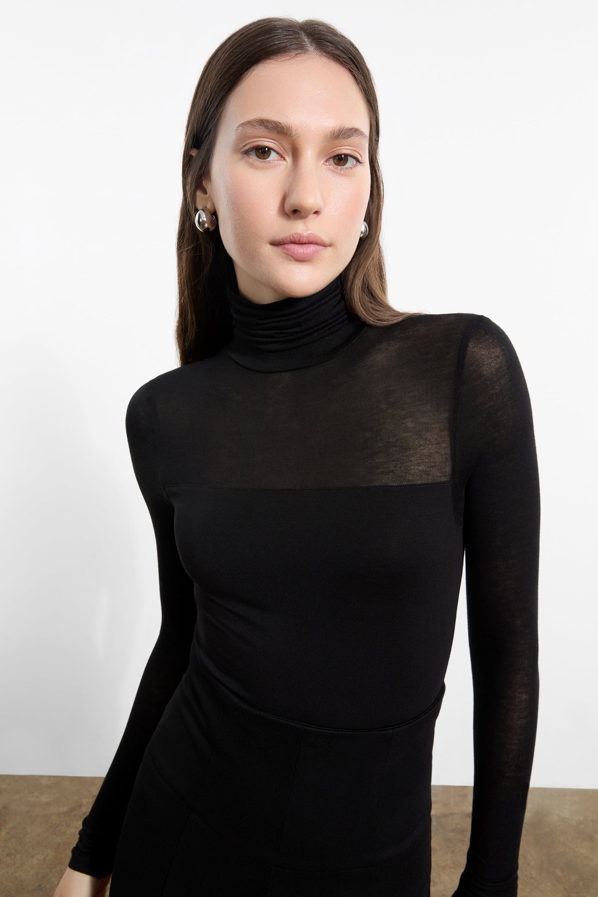 Timeless and head-turning at once. our Cara Top is a reimagined take on the classic turtleneck top. Fully covered feels lighter than air with our dual European jersey construction. combining an opaque base with sheer at the neckline and sleeves for an unexpected hint of skin. Cara's high-stretch fabric fits just so in all the right places and she's breathable enough to layer across seasons.SPLIT