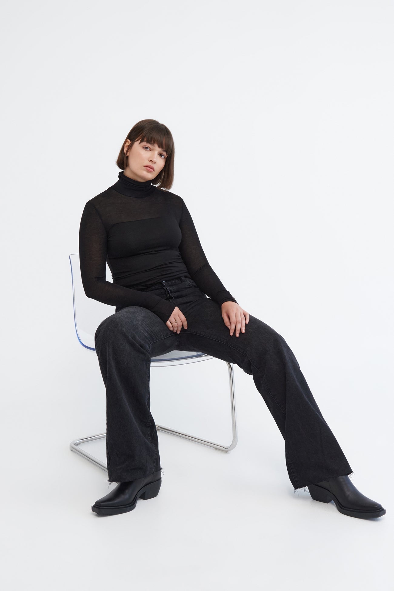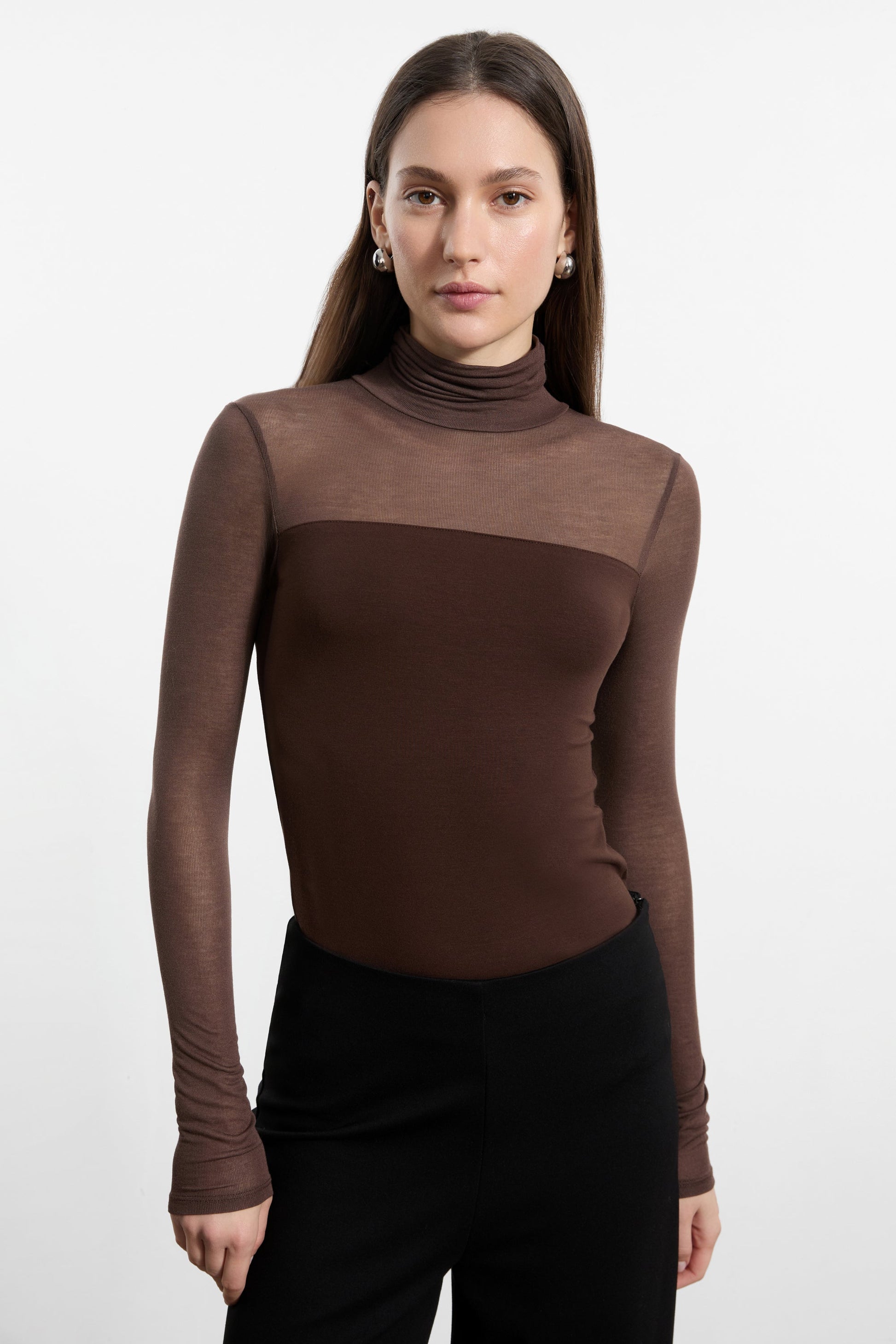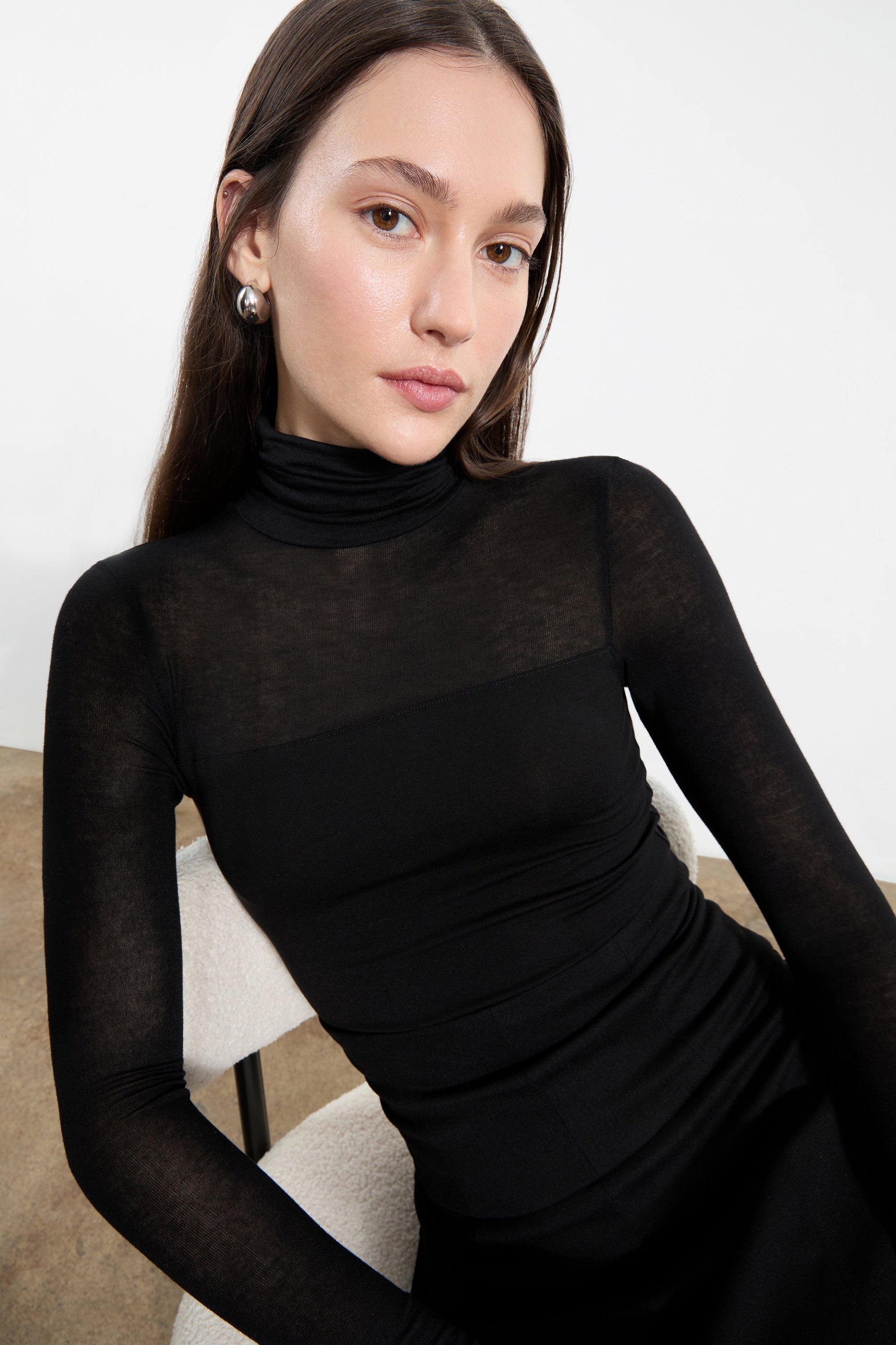 Timeless and head-turning at once. our Cara Top is a reimagined take on the classic turtleneck top. Fully covered feels lighter than air with our dual European jersey construction. combining an opaque base with sheer at the neckline and sleeves for an unexpected hint of skin. Cara's high-stretch fabric fits just so in all the right places and she's breathable enough to layer across seasons.SPLIT