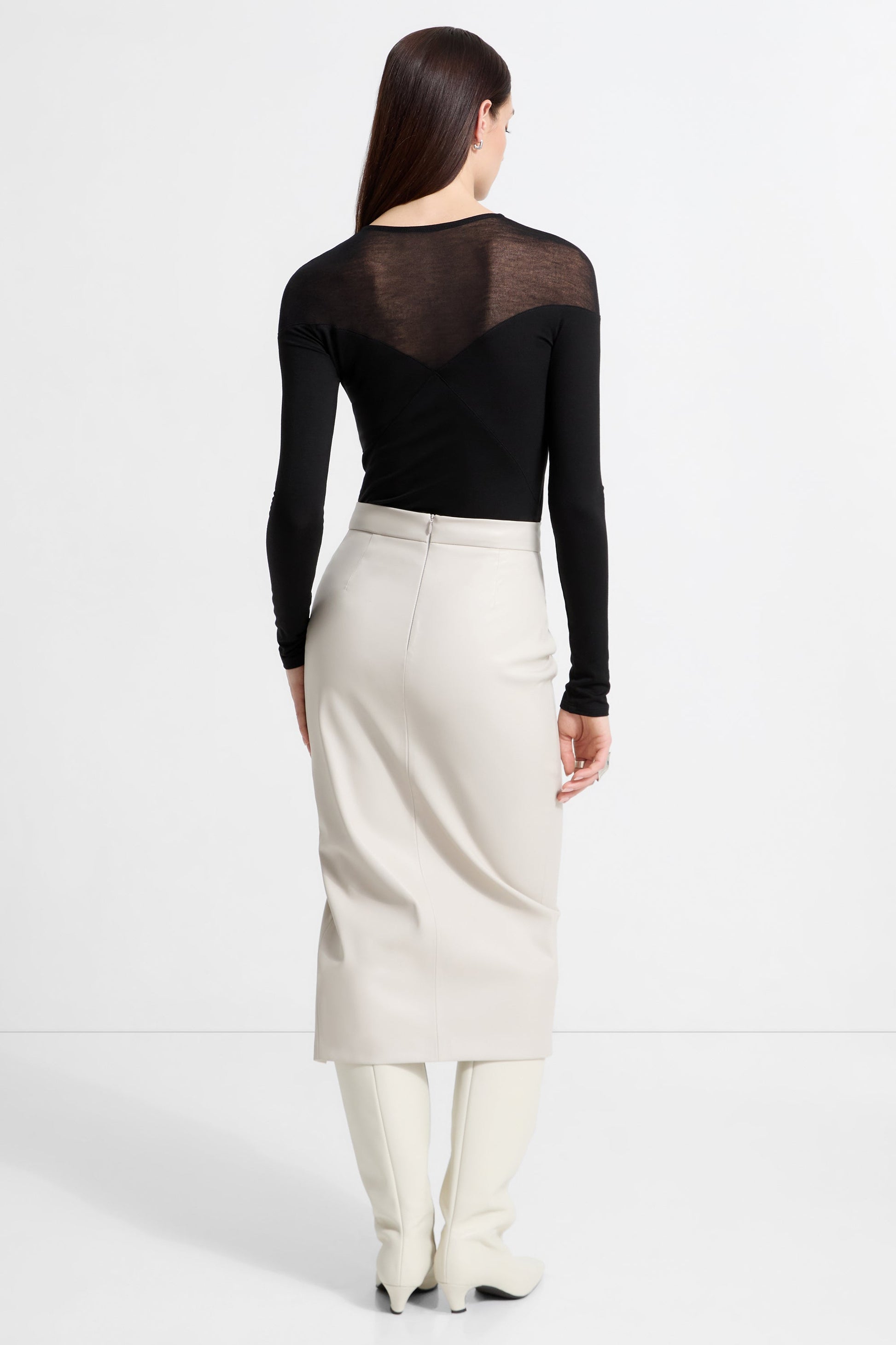 A fiercely sophisticated staple. this vegan leather pencil skirt is your go-to for classic edge. Hitting just below the knee with a side slit. Carly lets you show off a hint of leg or your boldest boots. Tailored with a narrow waistband for added comfort and shape. Carly's ready to move from office hours to after hours.SPLIT
