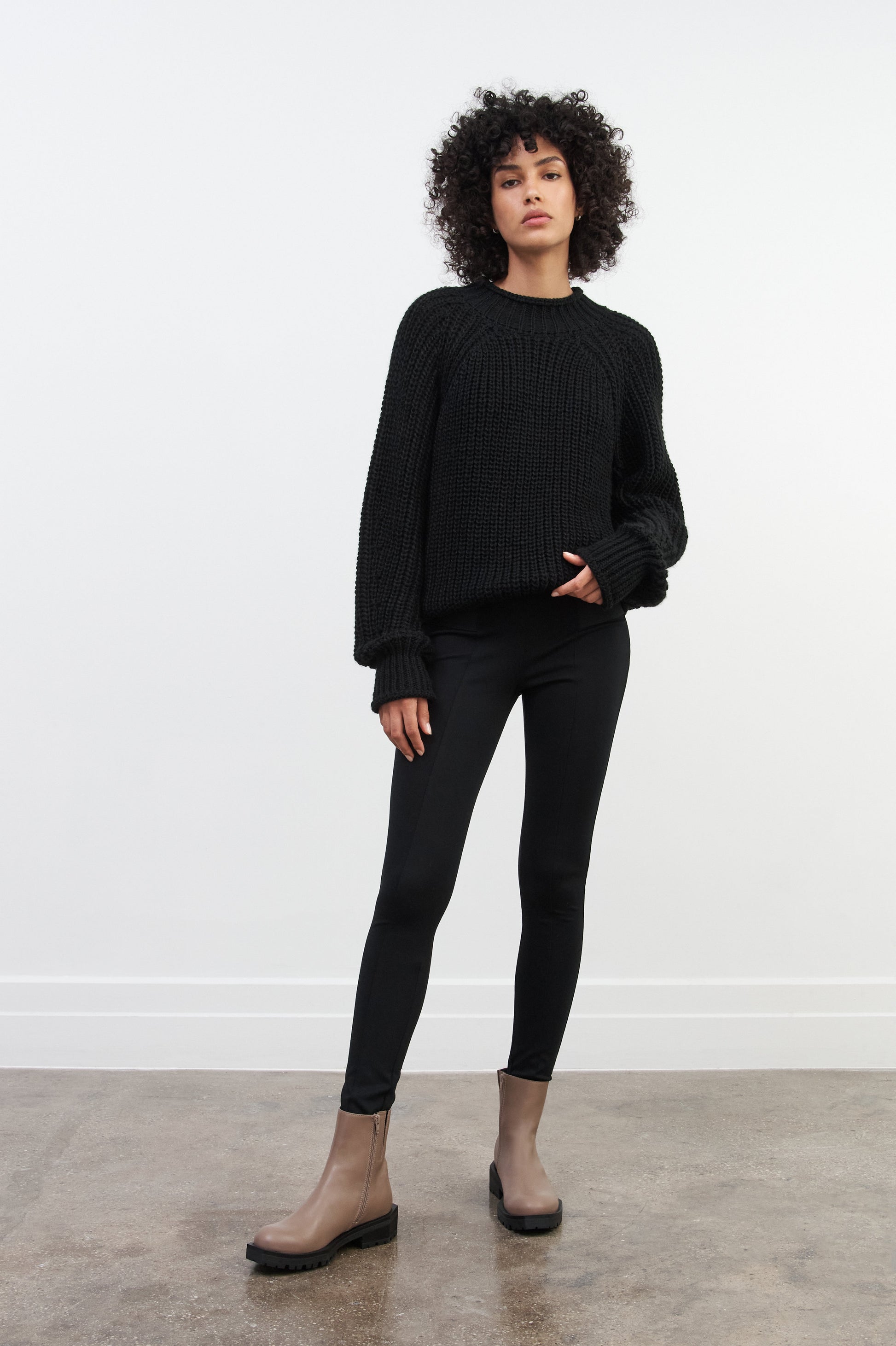 - Astrid is shown wearing Carnegie in taupe. black. and olive.