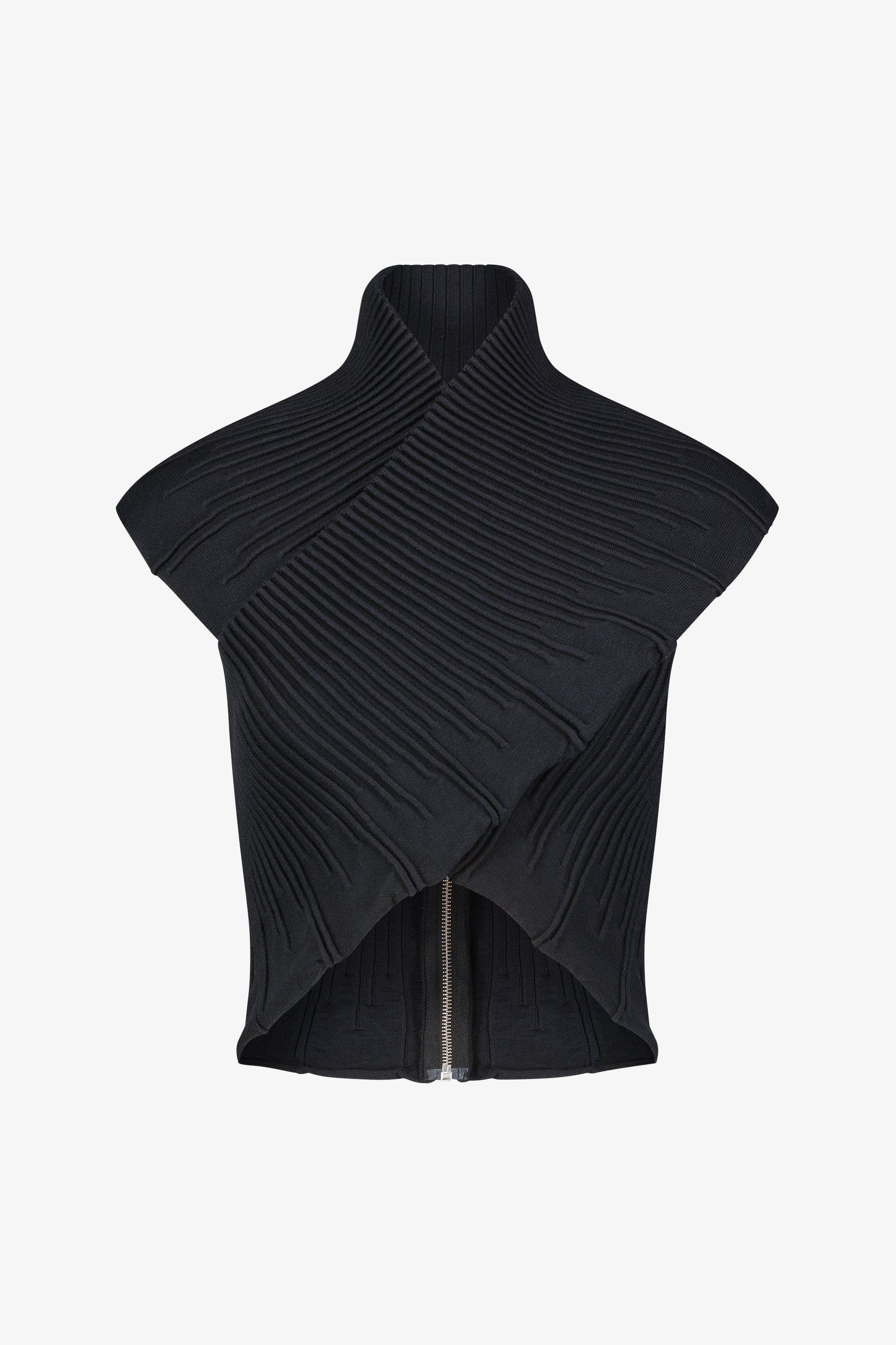 Do you believe in magic? Our Colette Bolero can instantly transform your look for day or night. This sleeveless vest has a high neck. ribbed detailing. and a contrast zipper at the back for a standout look. Crafted from luxe French organic cotton. she's designed to wrap around the torso in an elegant crisscross. elevating your go-to layering basic to something extraordinary.