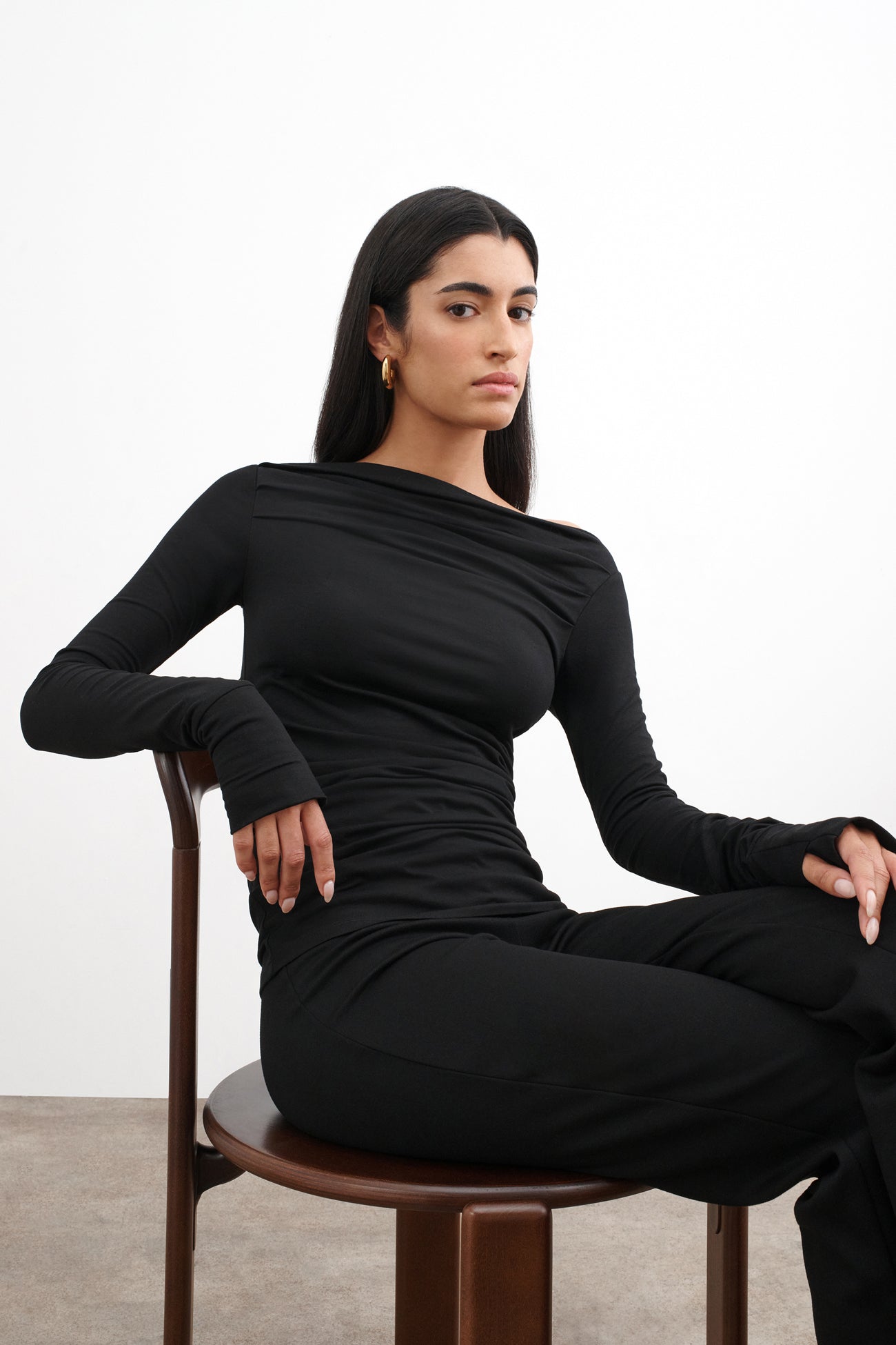 When you need a top that can seamlessly dress up or down. reach for our Cooper Top. In soft. high-stretch and eco-friendly European jersey. she offers soft folds and gathered sides that create a unique draped look on both front and back. Her wide boat neckline can be worn on- or off-shoulder. allowing you to switch her up for day or night. Cuffs and thumbholes provide additional visual interest.SPLIT