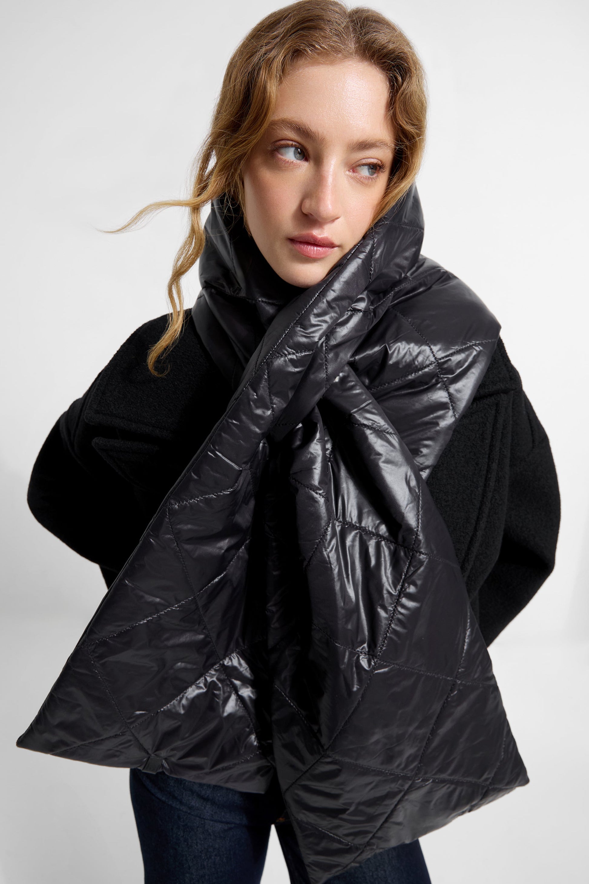 From padded European puffer fabric. our Desmond Scarf is a sleek and sculptural statement for you to brave the elements in. Oversized with a pillow-soft feel and glossy geometric quilting. this essential accessory loops around the neck with lightweight ease. Finished with plush padding. Desmond delivers warmth. water resistance and wind protection in one polished layer.SPLIT