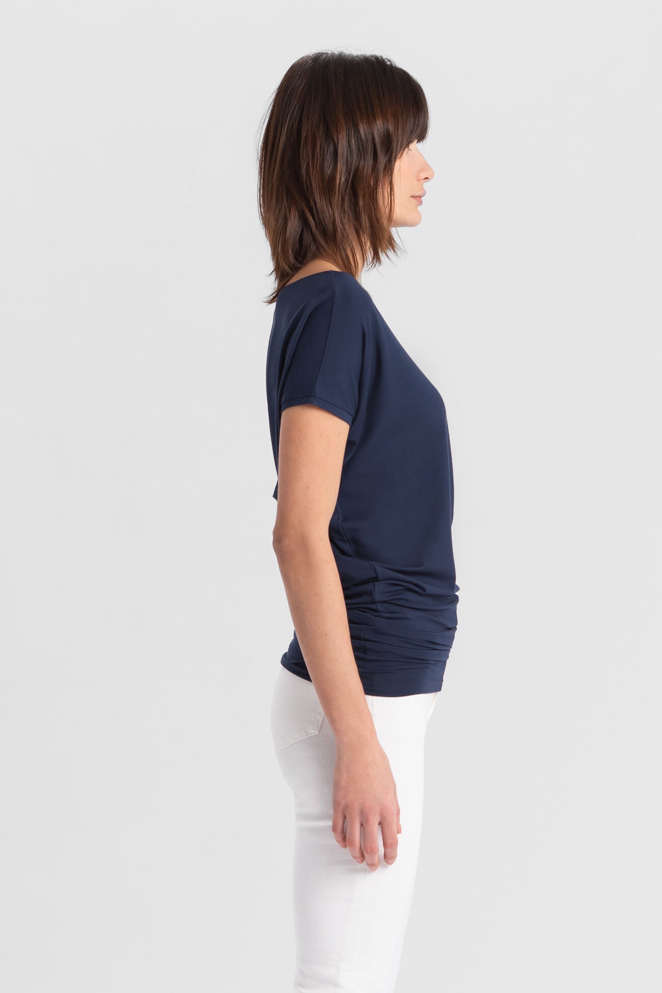 If you're in the mood to lounge luxuriously. Elena is the move. Fashioned from silky soft. eco-friendly European jersey. our all-day/all-night top features a loose scoop neck and asymmetric sleeves with a batwing on one side. Her oversized silhouette tapers below the waist for a flattering fit. Elena's versatile enough for professional or casual looks.SPLIT