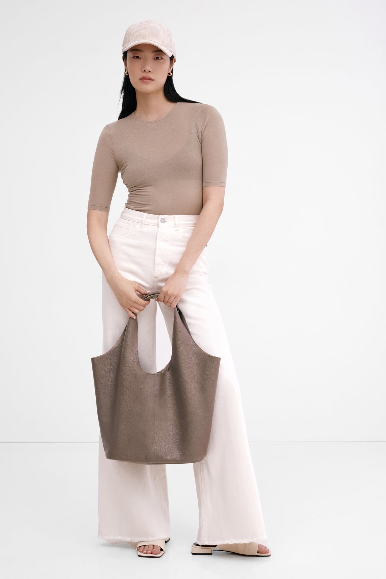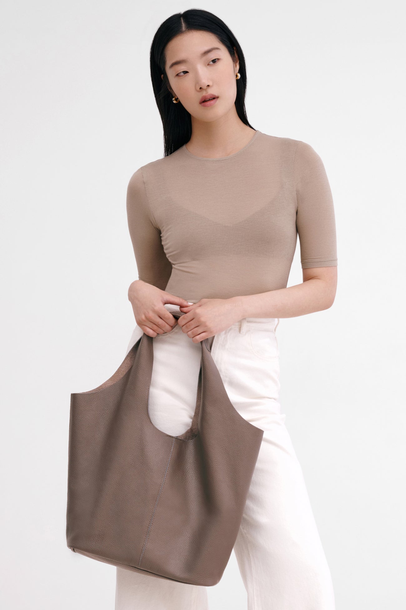 A flawless blend of functionality and elegance. our Elmhurst is your next everyday tote bag. This oversized silhouette is handcrafted from pebbled Italian leather. with extra padding at the handles to rest comfortably on your shoulder. Designed with a structured bottom. a spacious unlined interior. and secure magnetic closure. she's stylishly prepared for anything. any day or night. all the time. SPLIT