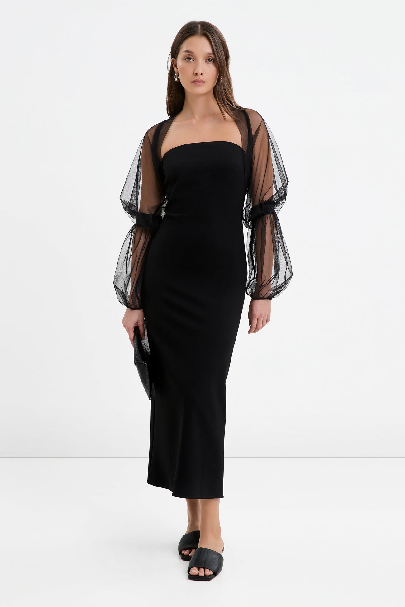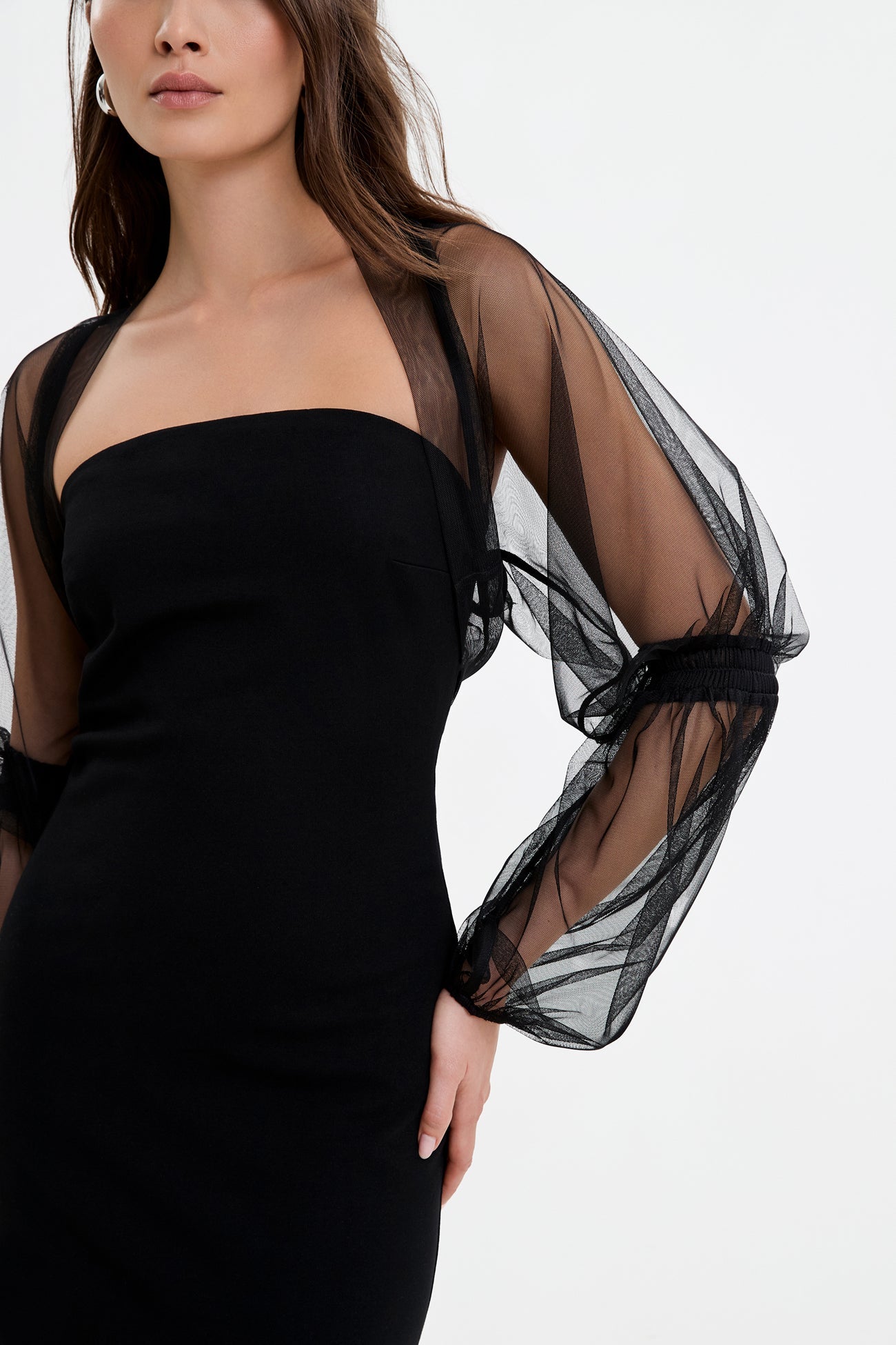 Hello sheer romance. Handcrafted from our soft. airy and luxe mesh. the Elodie Bolero features statement Marie-style puff sleeves that float down to the wrist. She's structured by curved seams at the back. slipping easily over any cocktail look to transform it into something both bold and beautiful. This mesh bolero shrug's the perfect alluring companion to your sleeveless night-out outfit.SPLIT