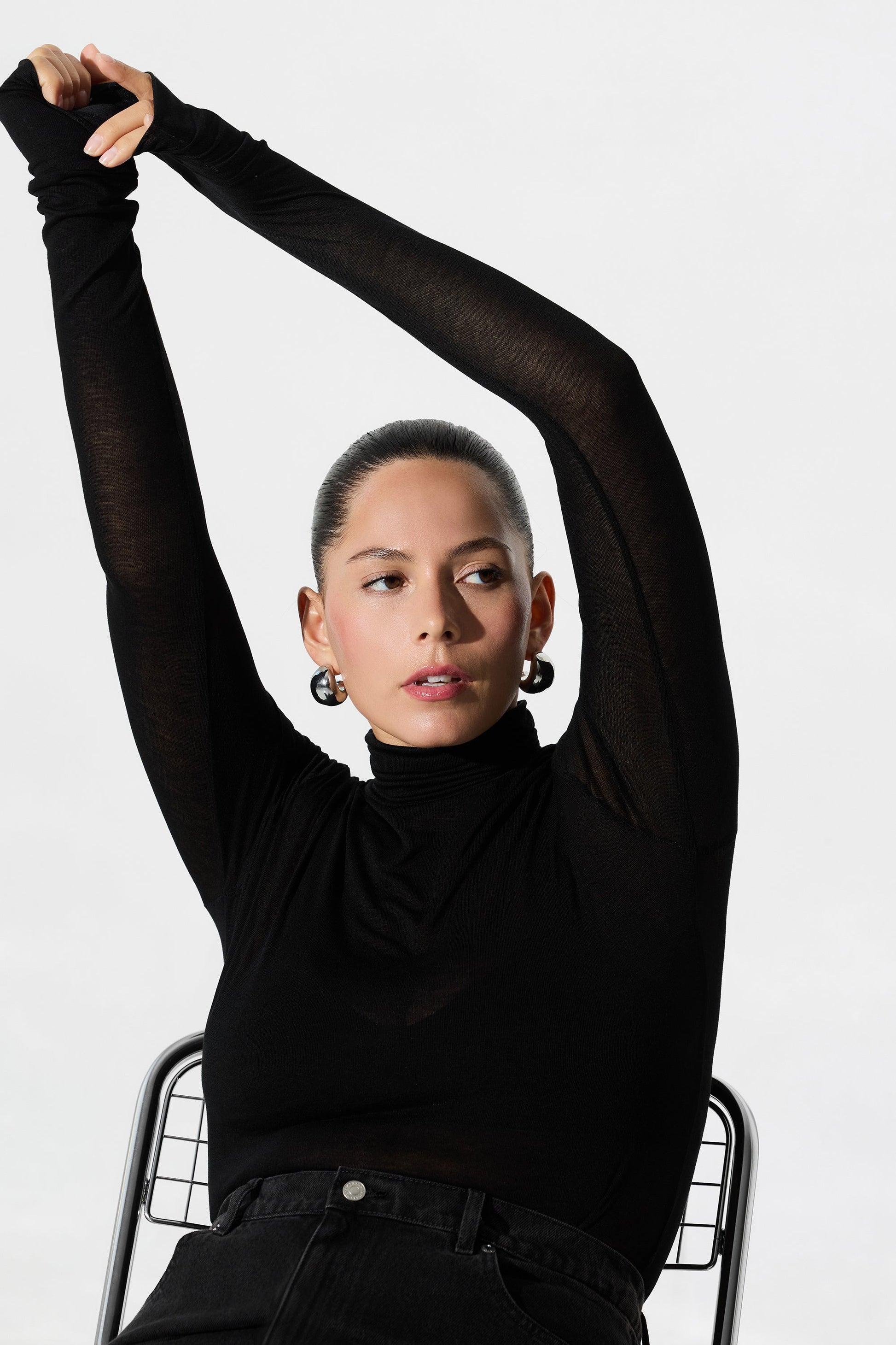 Meet our favorite multi-tasking silhouette. the Eloise Sheer Turtleneck. She features several signature Marcella details—including thumbhole sleeves and extra length around the torso. Crafted from our European sheer jersey for an ultra-light feel and body-loving fit. Eloise is casual yet easy to dress up—a true staple.