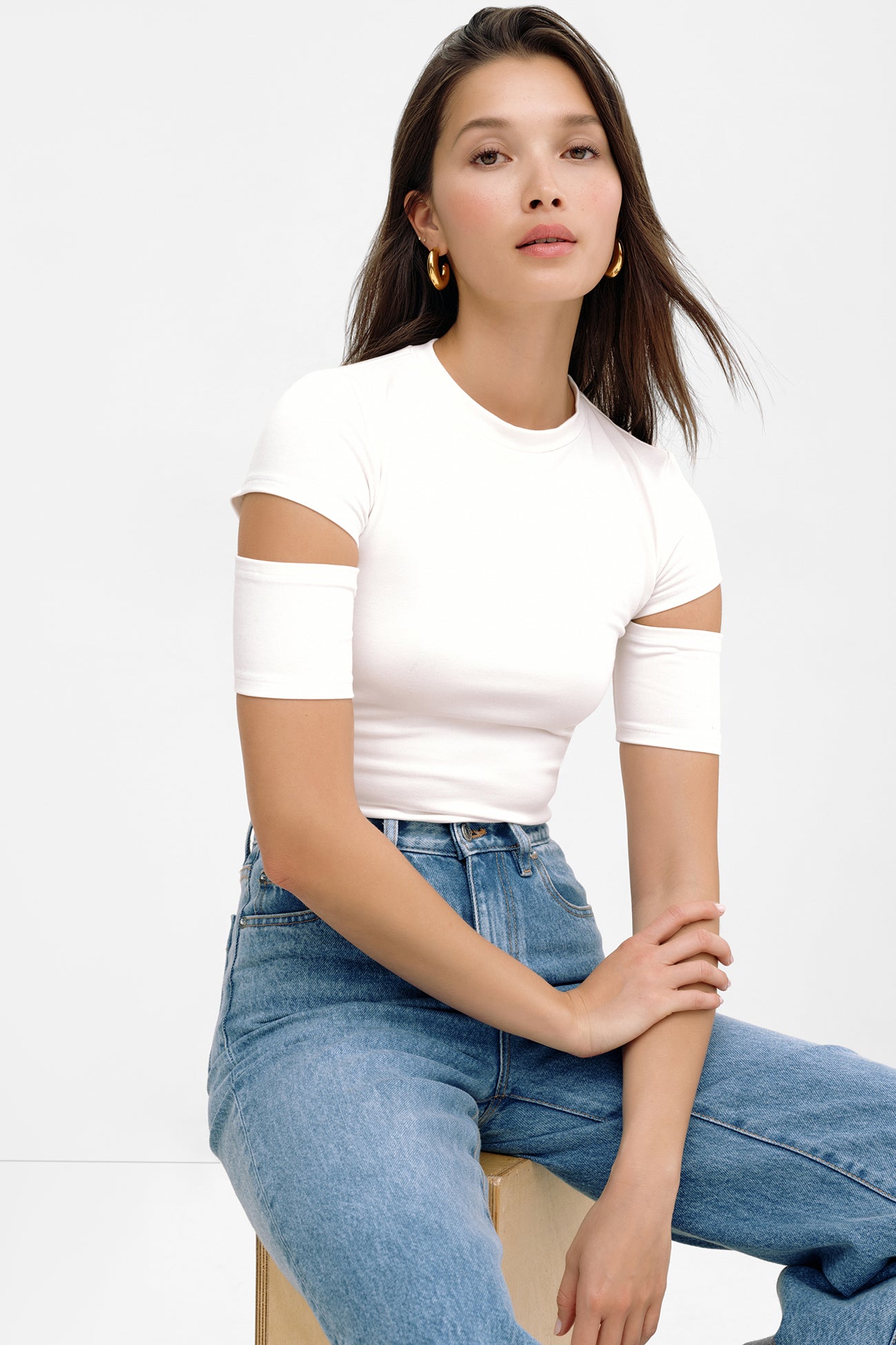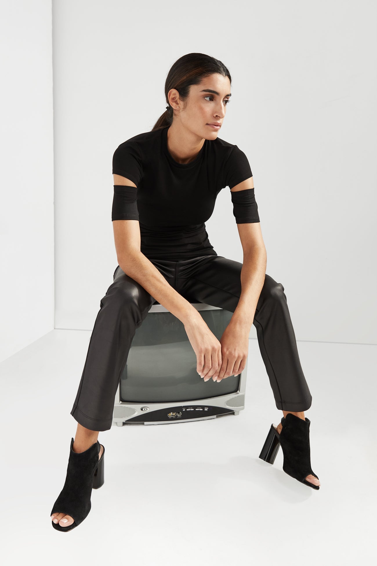 Meet Esme. our essential. oh-so-versatile top with a twist. She features a round neck and dual cutouts at the sleeves that give her the edge you crave. Fashioned from our silky soft. high-stretch and sustainable European Jersey. she's perfect for dressing up or down for that uncomplicated yet hypnotic look.SPLIT