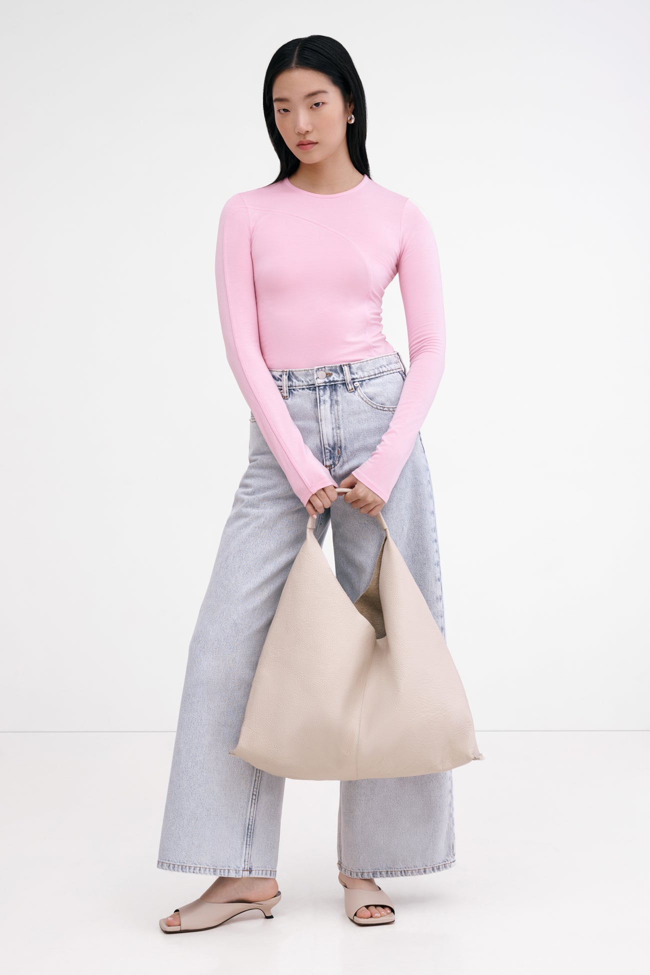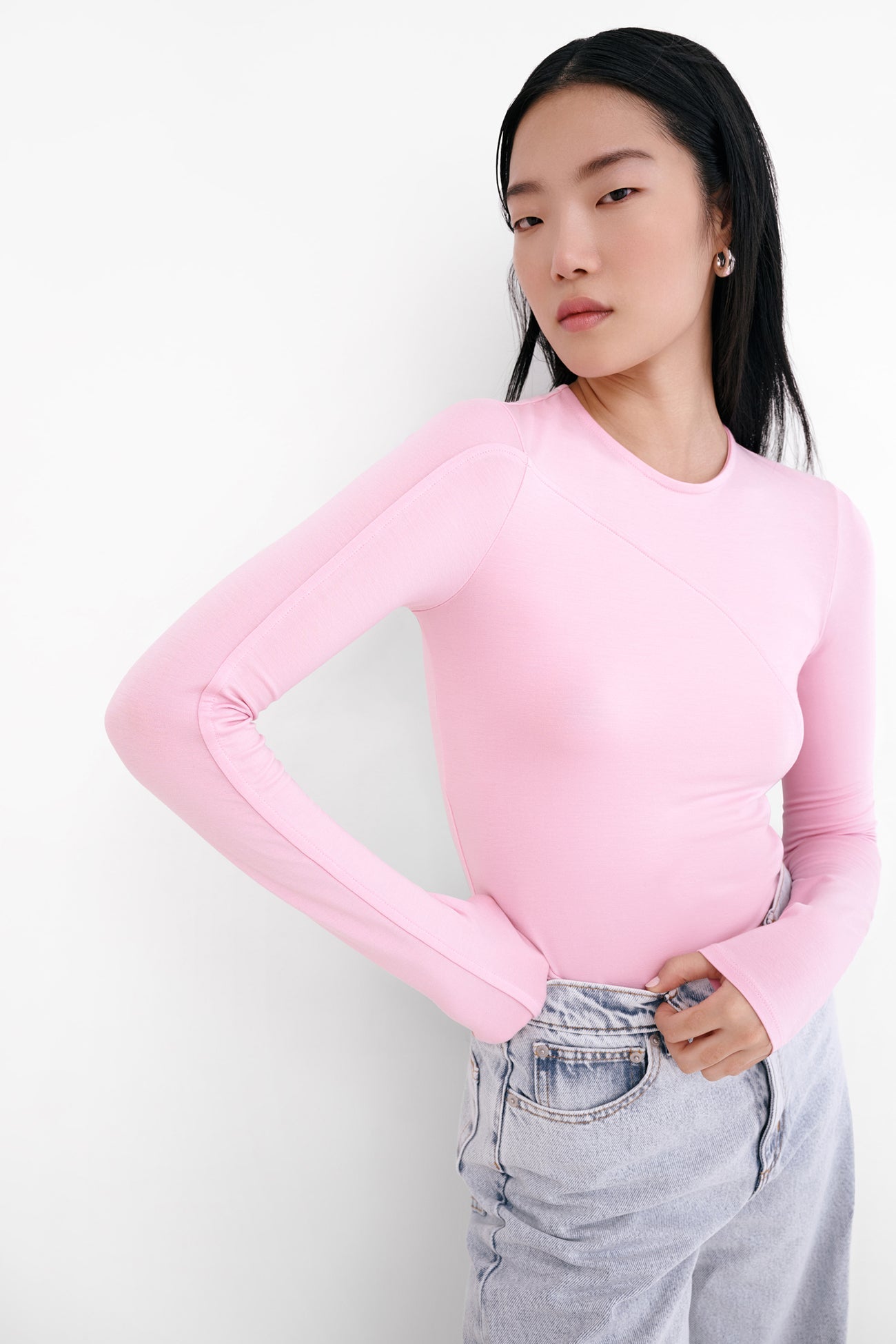 Style in motion. Este features an asymmetric seam that arcs from chest to hem. adding intrigue to a pared-back silhouette that moves seamlessly from day to night. From silky soft. sustainable European jersey. this long-sleeve crew neck offers a hugging fit. balancing artful ease and everyday versatility.SPLIT