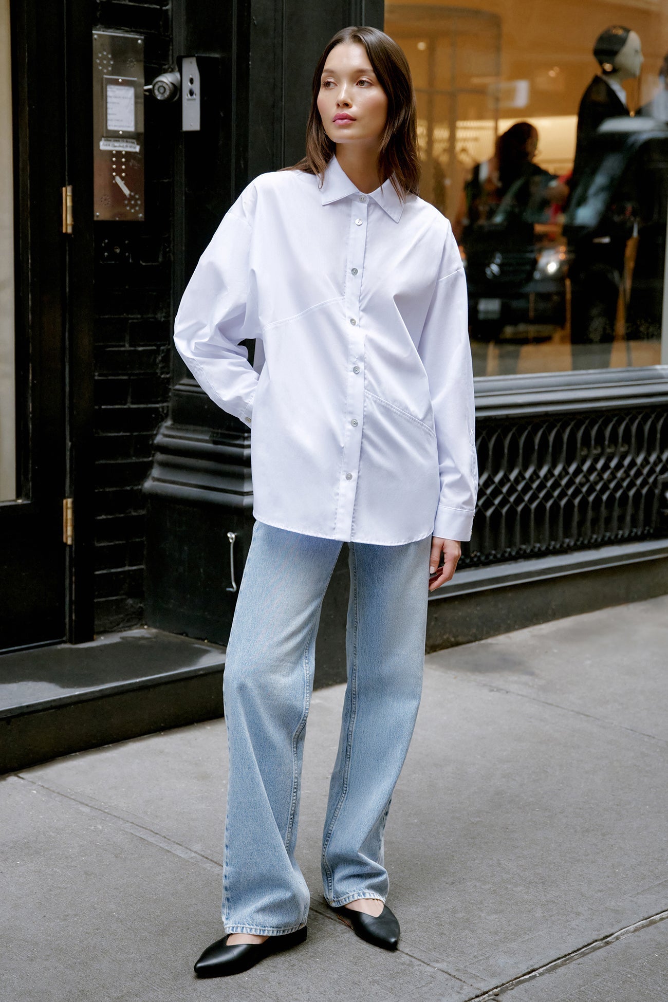 Our Ezra Shirt is a capsule wardrobe dream for your closet. Crafted from 100% crisp European poplin cotton. she offers a classic button-up silhouette in front. but with a cropped back for modern edge. Say hello. as well. to her diagonal seams at the front. sleek collar and long dolman sleeves finished with mother-of-pearl button cuffs. Wear Ezra tucked. tied or open and free—she never fails to inspire new looks.SPLIT