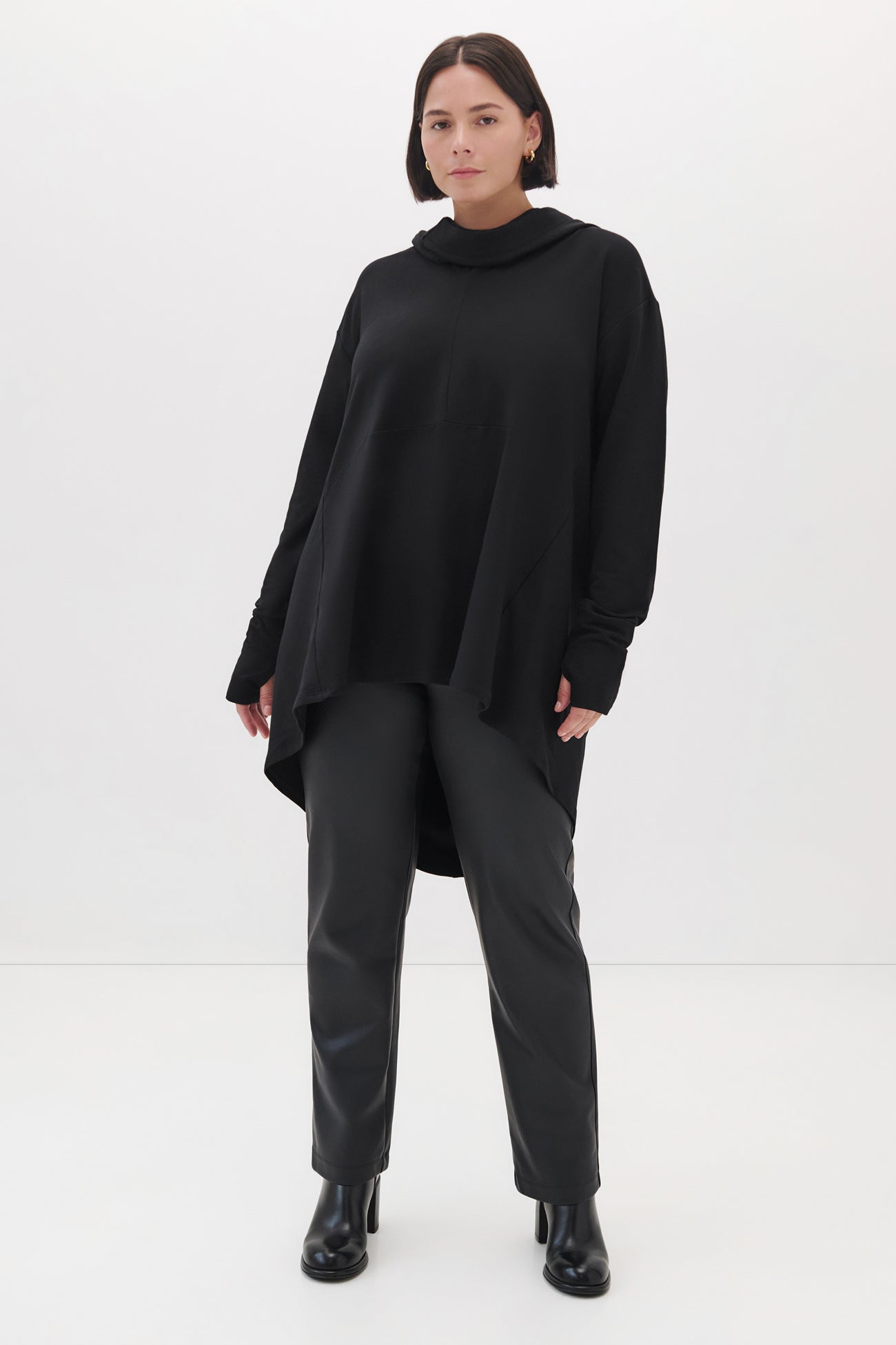 A masterwork in minimalist edge. our Firenze Hoodie is distinguished by a veil-like hood that brings the drama whether worn up or down. Crafted from light European sweatshirt fabric. she features an ultra-relaxed fit perfected by dropped shoulders and an elevated back that dips. Thumbholes keep the sleeves pinned to your wrist for a cozy. finishing touch. Firenze is as easy to maintain as to wear: effortless to clean. structured to last. doesn't pill.