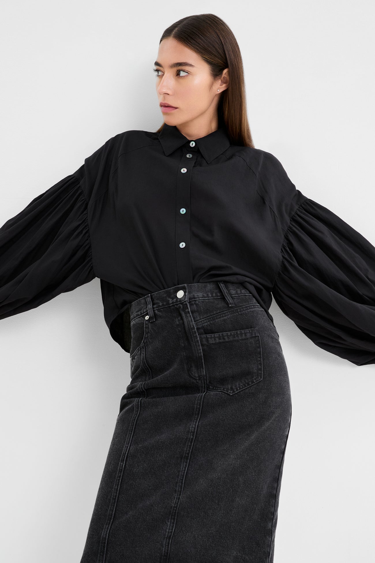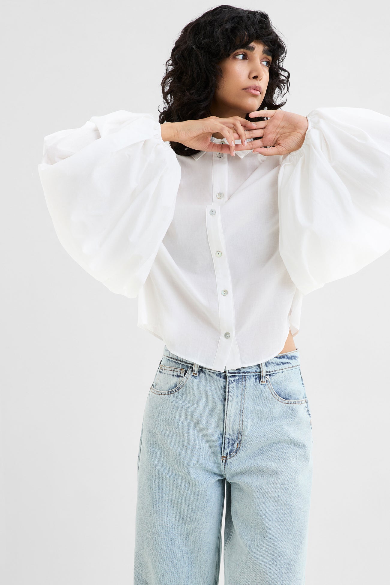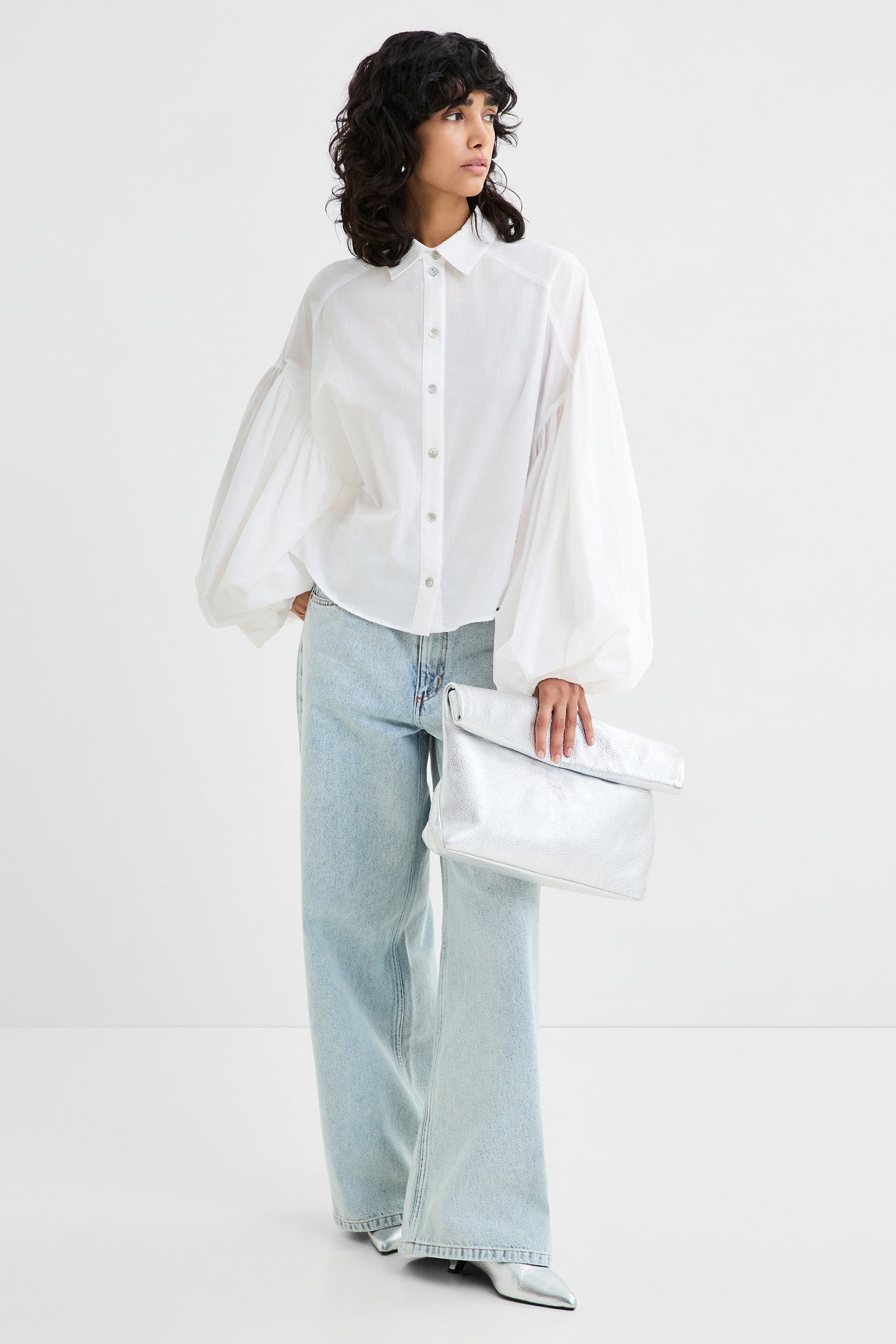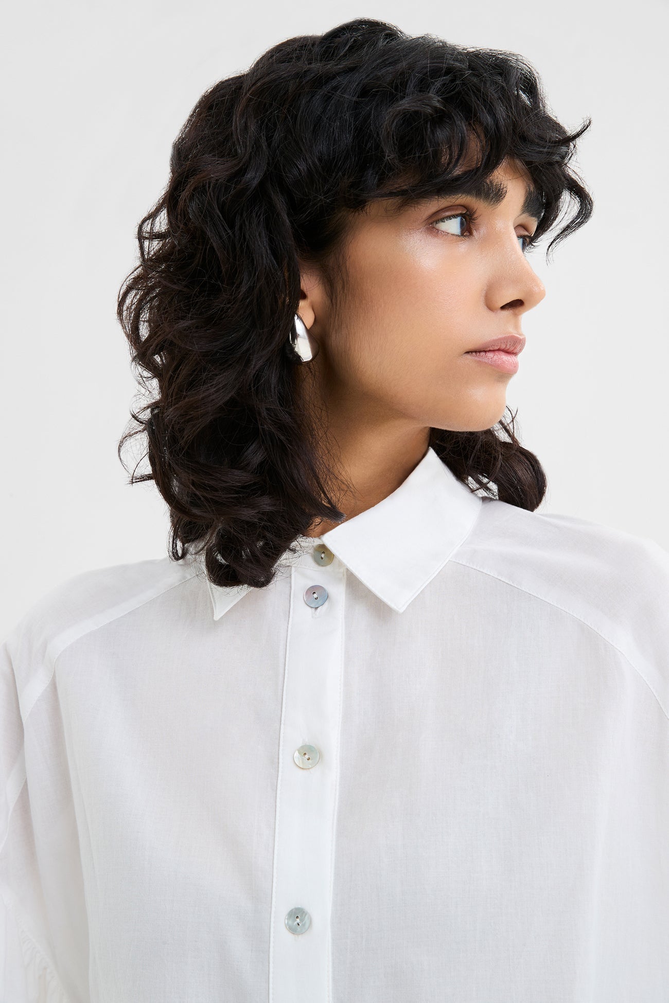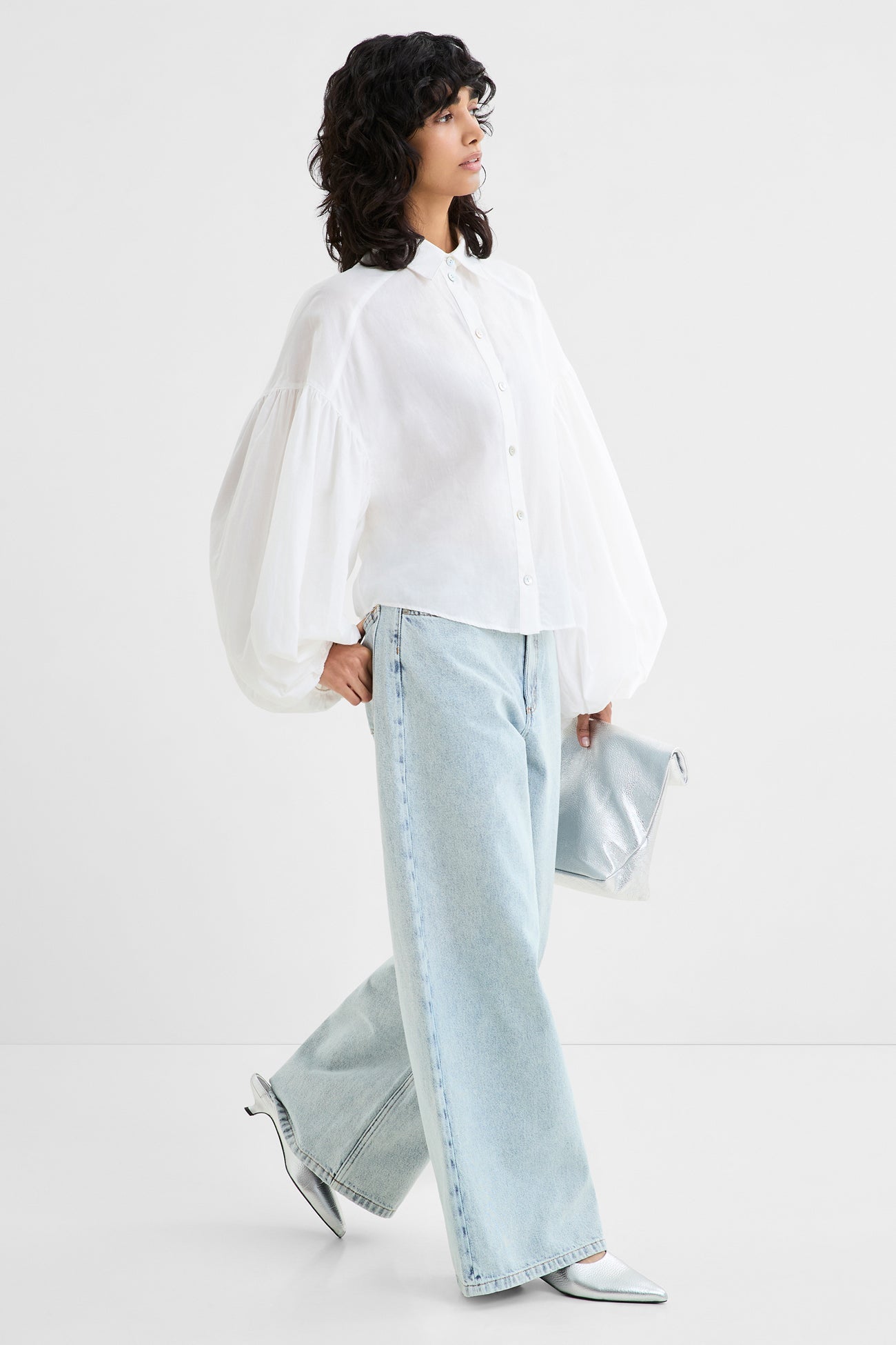 From her volume to her classic shirting details. Fulton delivers polished drama. Our contemporary button-down in lightweight. semi-sheer European cotton voile features a relaxed yet structured silhouette. pairing statement bishop sleeves with a sharp collar and pearl-effect buttons. She's crisp and comfy from desk to drinks.SPLIT