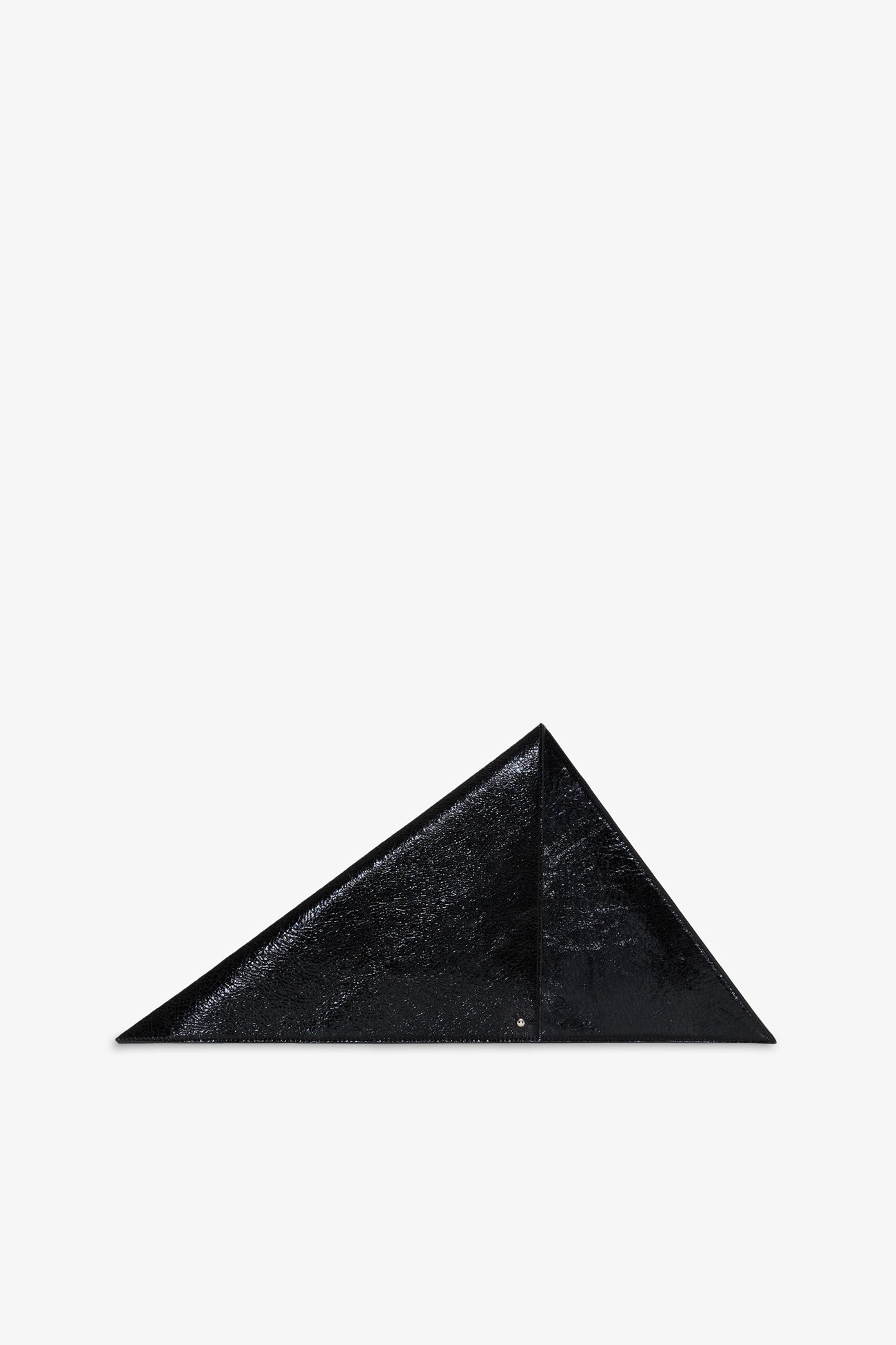 Geometry meets glamour in our Garten Clutch. Handcrafted from shiny distressed European leather. this triangular silhouette is an edgy yet functional piece of art. Featuring one main compartment to easily accommodate all your valuables. a secure metal stud closure. and a small side pocket for easy access to your cards. SPLIT