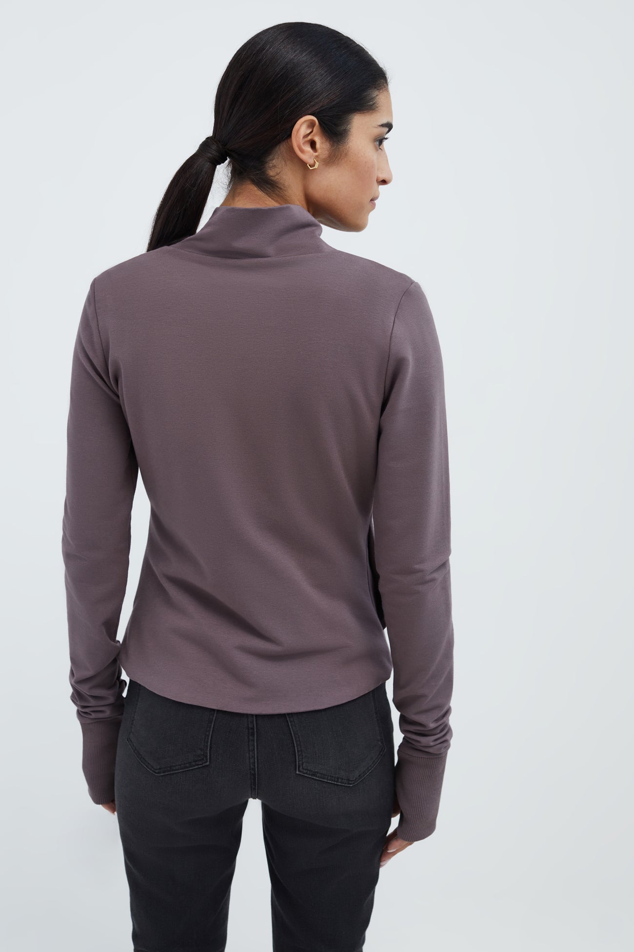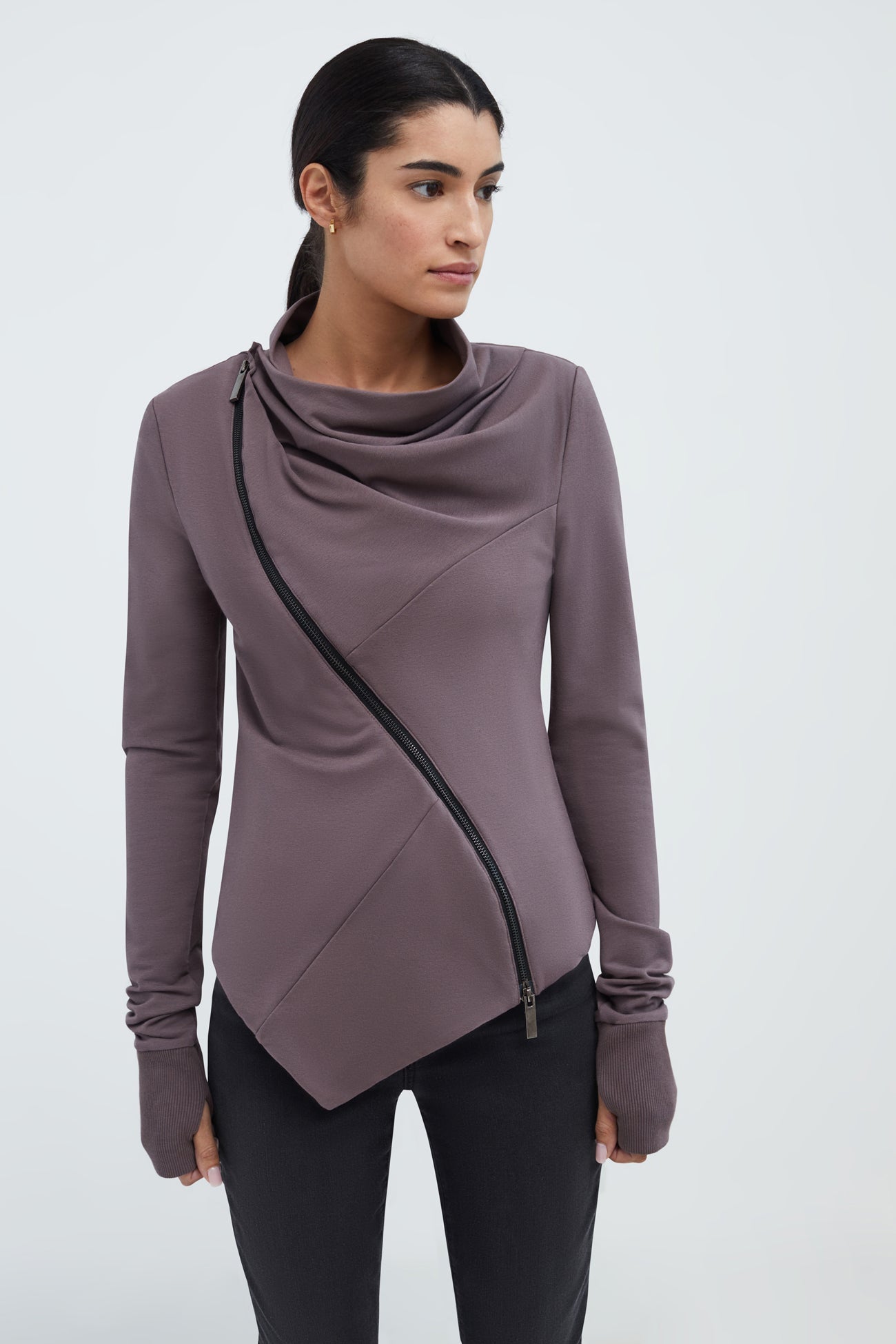 Add edge to your everyday with our Hoyt Jacket. Ideal for transitional weather. this lightweight European sweatshirt piece is tailored with a cowl collar and a uniquely curved. two-way zipper. offering a waterfall drape when unzipped and a bold v-cut hem when closed. Hoyt offers a sleek fit. side pockets and extra long sleeves with thumbholes for a cozy. finishing touch. SPLIT
