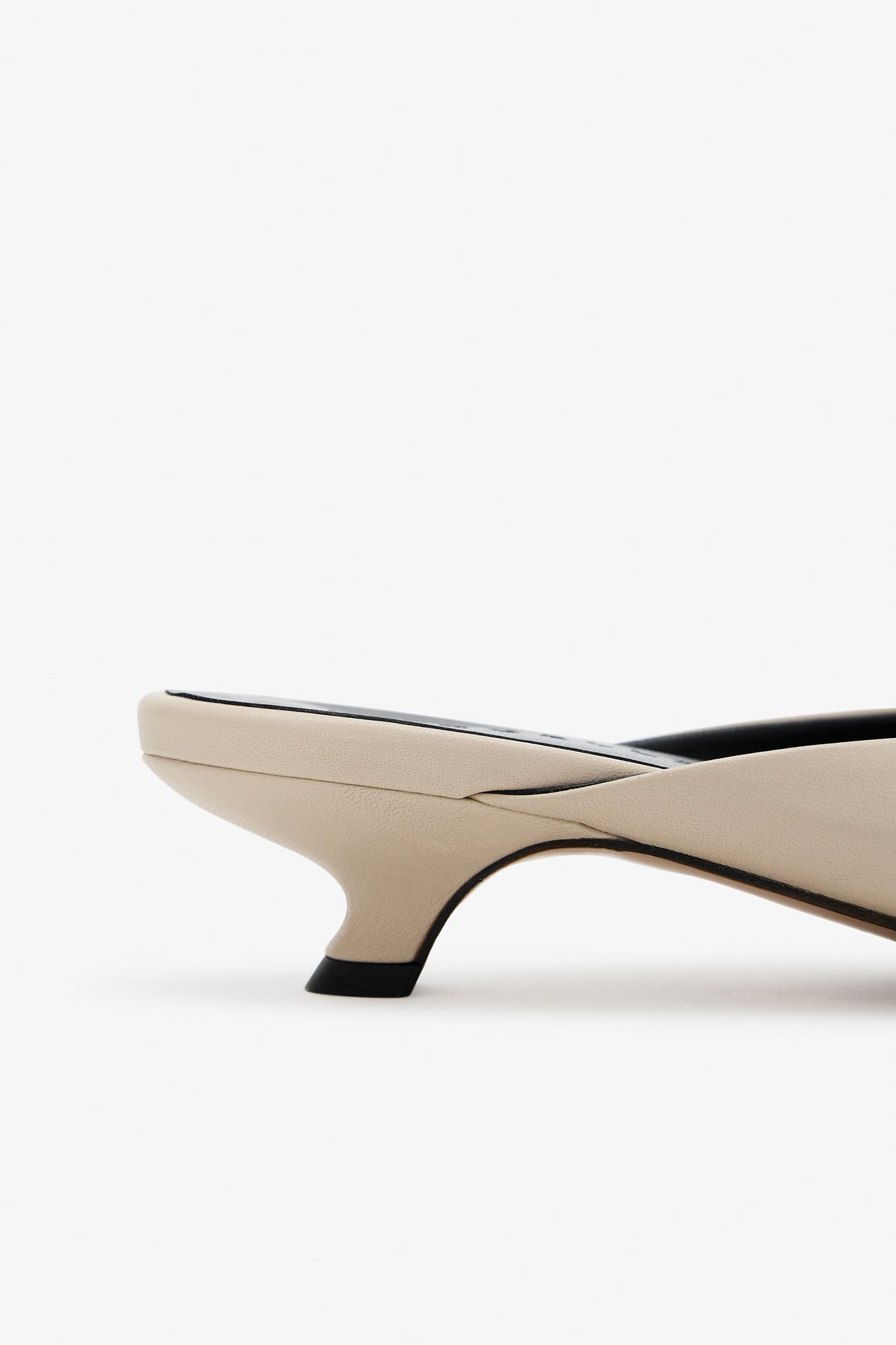Hyra charges every step with confidence. These slip-on mules cradle the foot with built-in arch support. an ultra-soft interior. and an effortless kitten heel. Her square toe contrasts with a curved strap. while supple nappa leather (in stone) or glossy spazzolato leather (in black) keep your stride sleek and smooth—however far you're going.SPLIT