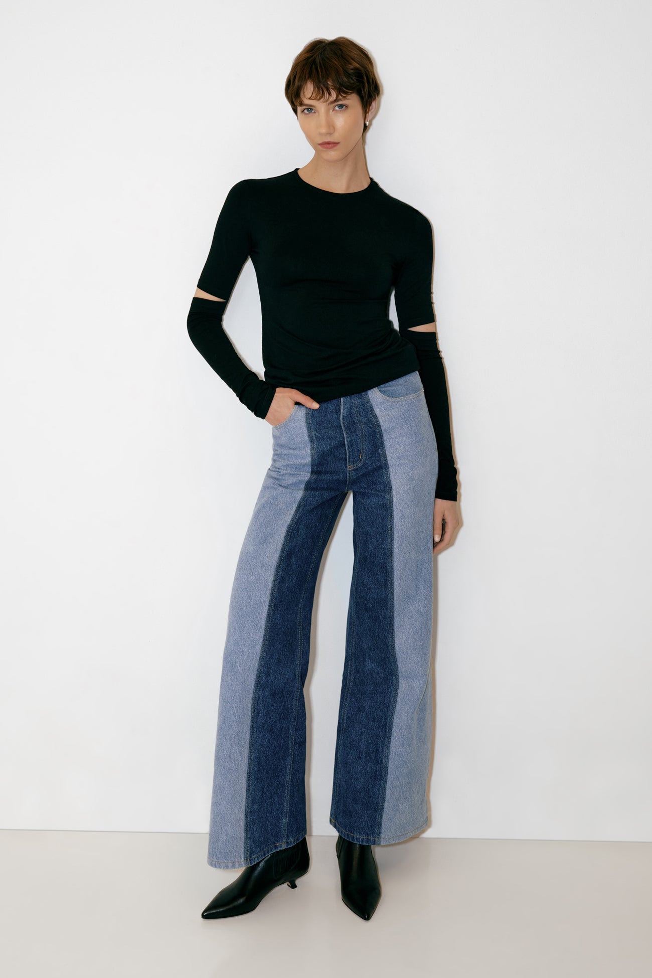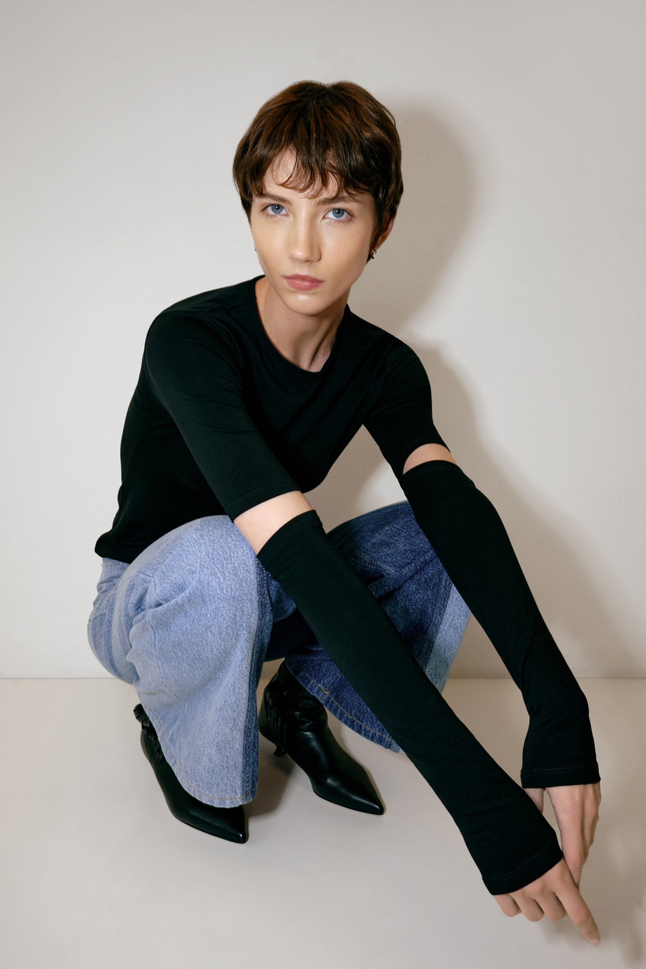 Yes. long sleeves can still be unique! Cue our Indra Top. featuring a new take on the traditional sleeve with comfy slits above each elbow. Edgy and casual at once. she's your choice for memorable everyday wear in soft. high-stretch and sustainable European jersey.SPLIT