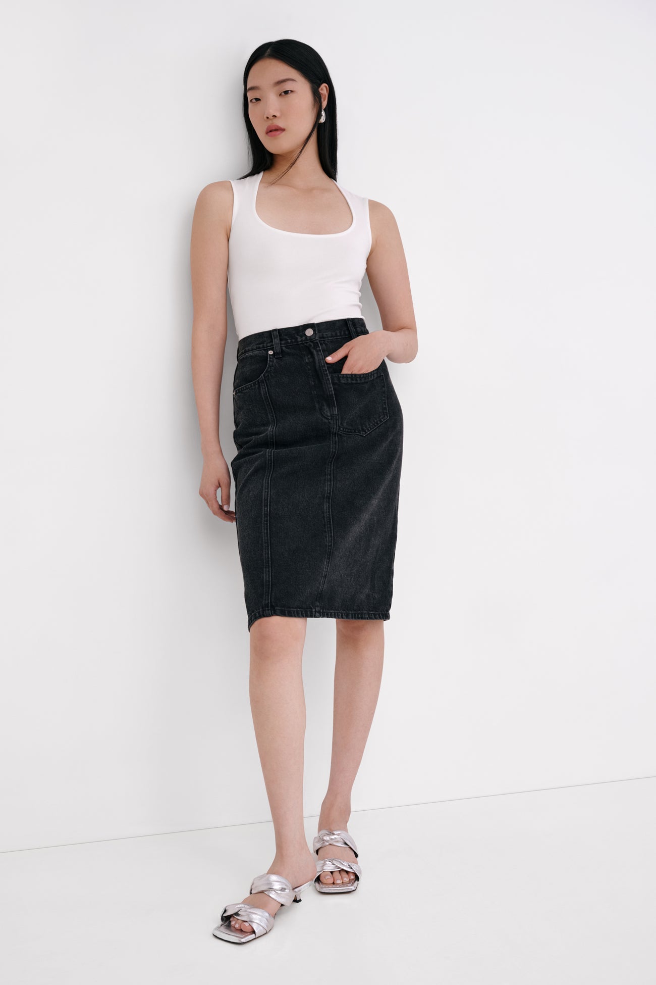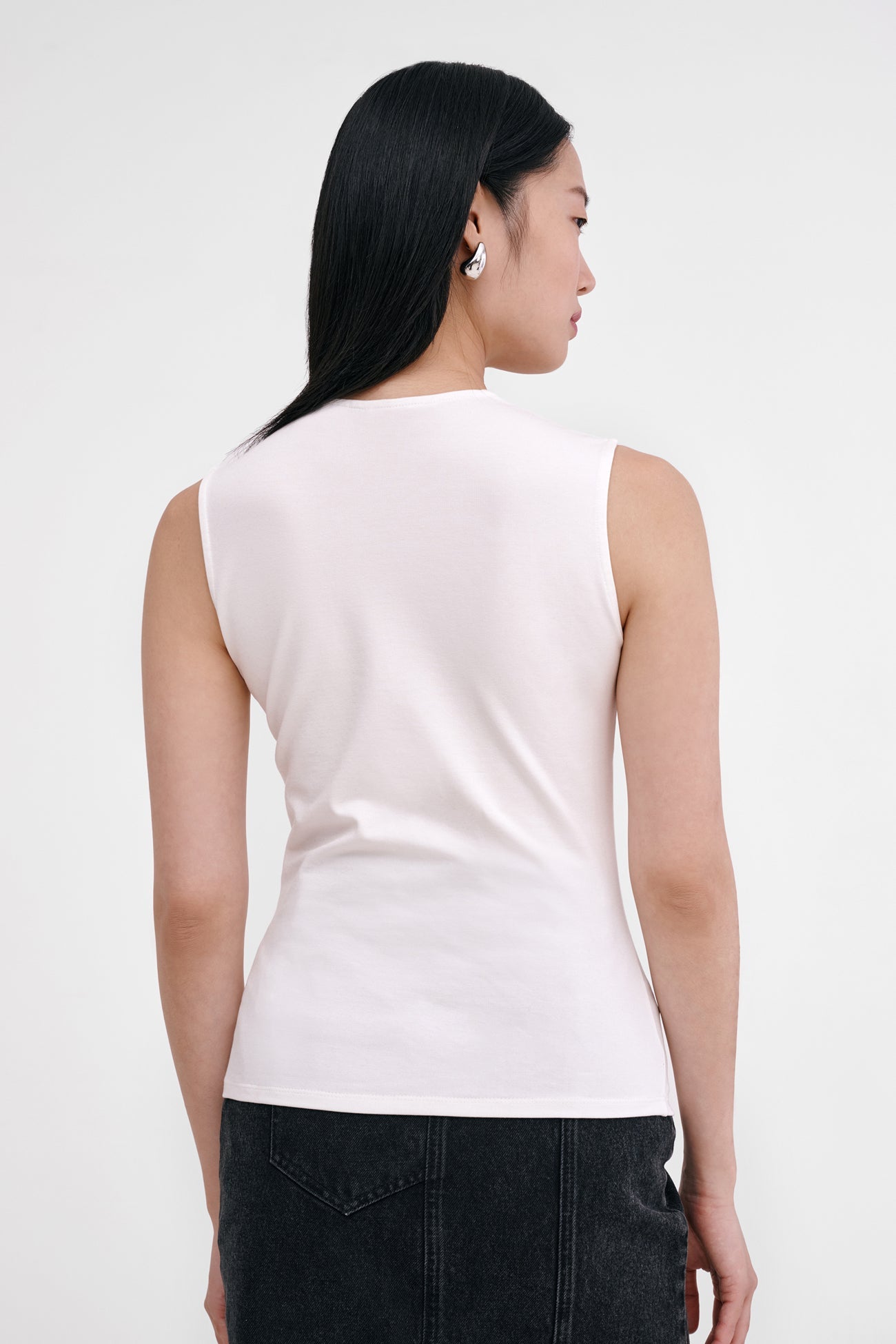 Flattering and feminine. our Jennie Top is a study in curves. featuring a delicate scoop neckline with elegant. rounded straps. Fashioned from soft. high-stretch and sustainable European jersey for a hugging fit. Jennie's as comfortable as she is versatile—wear her with jeans for a classic day look or with faux leather for elevated edge during the evening. SPLIT