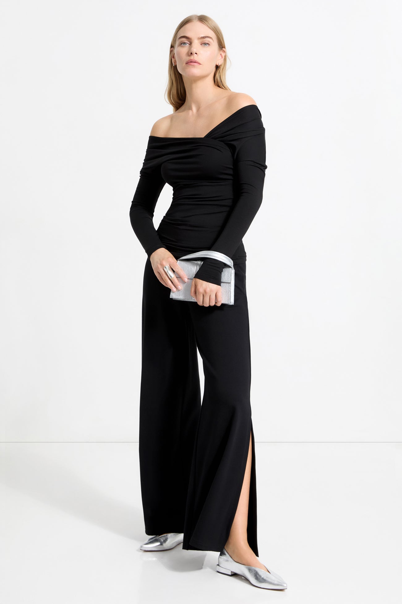 Understated with a pinch of attitude. our Jisoo Top is handcrafted from high-stretch. sustainable European jersey that's soft. lightweight and perfect for layering. Ruching along the sides adds a flattering gathered-effect. while her faux-wrap silhouette forms an asymmetric v-neck that's chic for day or night—and wearable on or off the shoulder. SPLIT