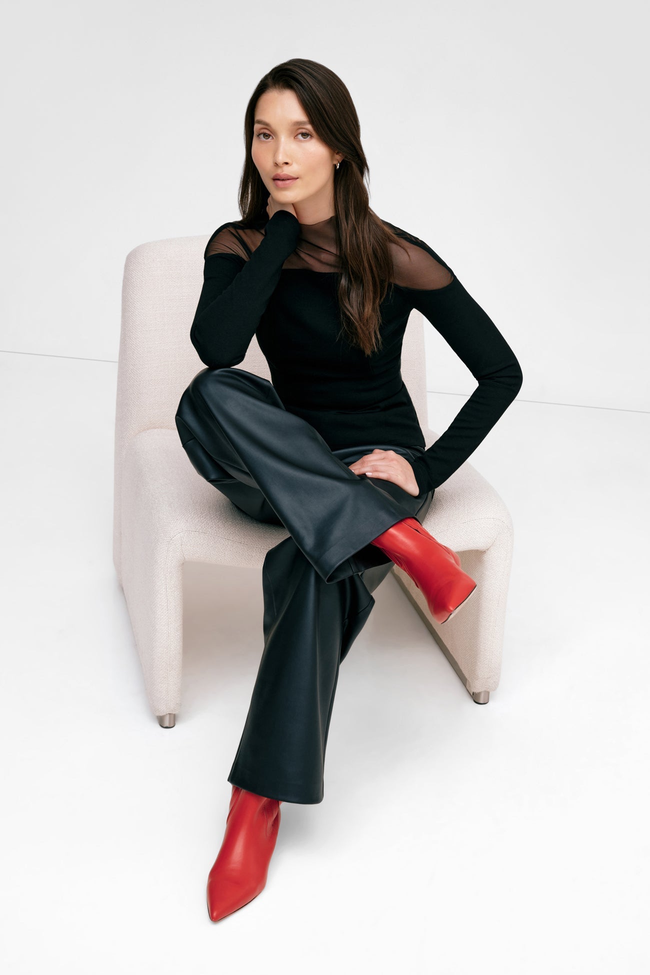 Introducing Joanna. a mesmerizing dance of texture. She begins with a structured. mid-stretch European ponte bodice with princess seams to lengthen your torso and provide a hugging fit. Soft & high-stretch luxe mesh then rises up to a high. raw-edged neckline. creating a stunning off-shoulder illusion that extends into opaque sleeves. Joanna is grab-and-go for any setting - casual to cocktail.SPLIT
