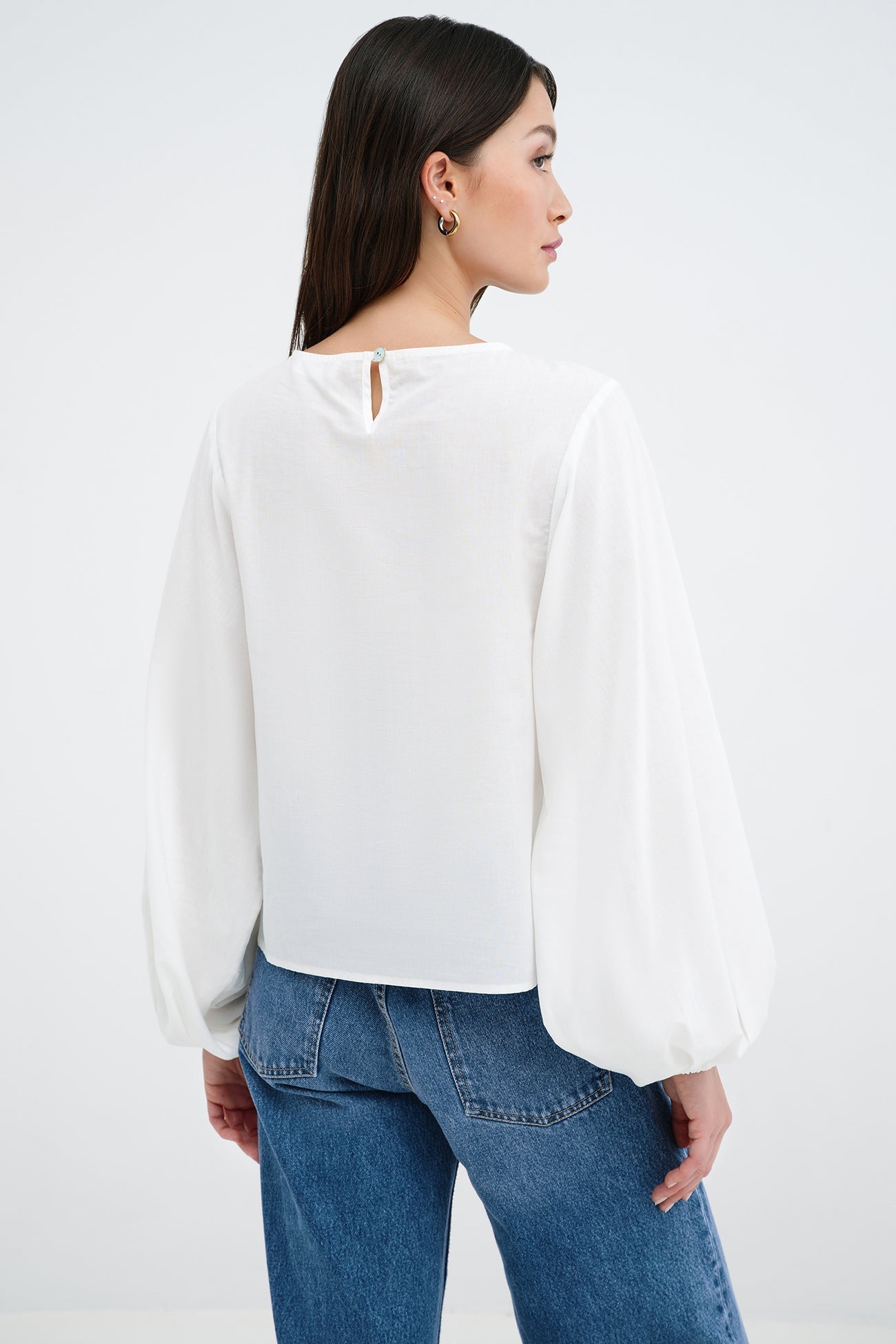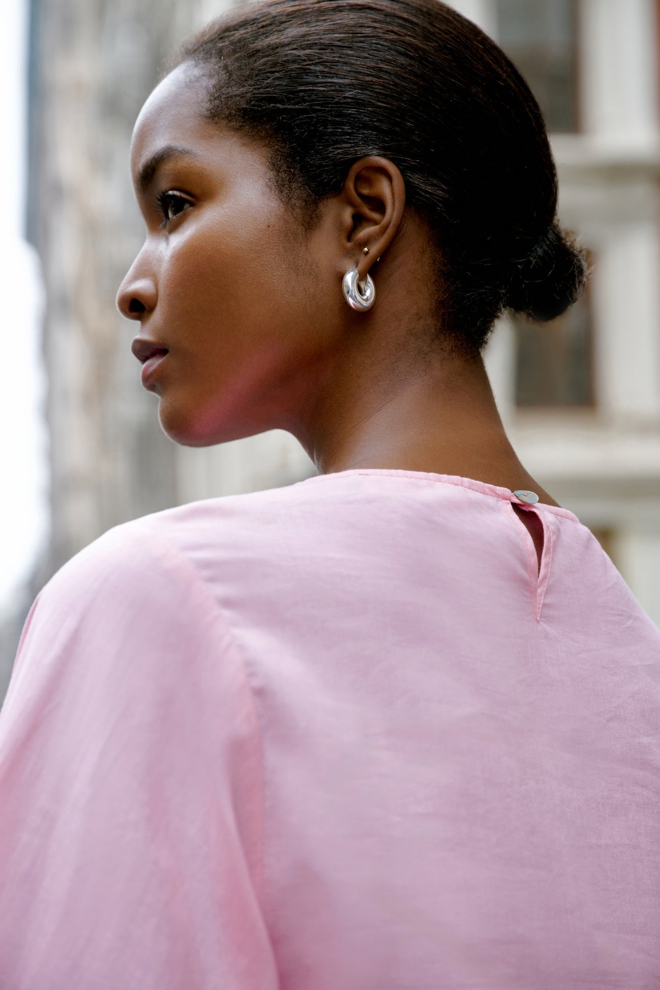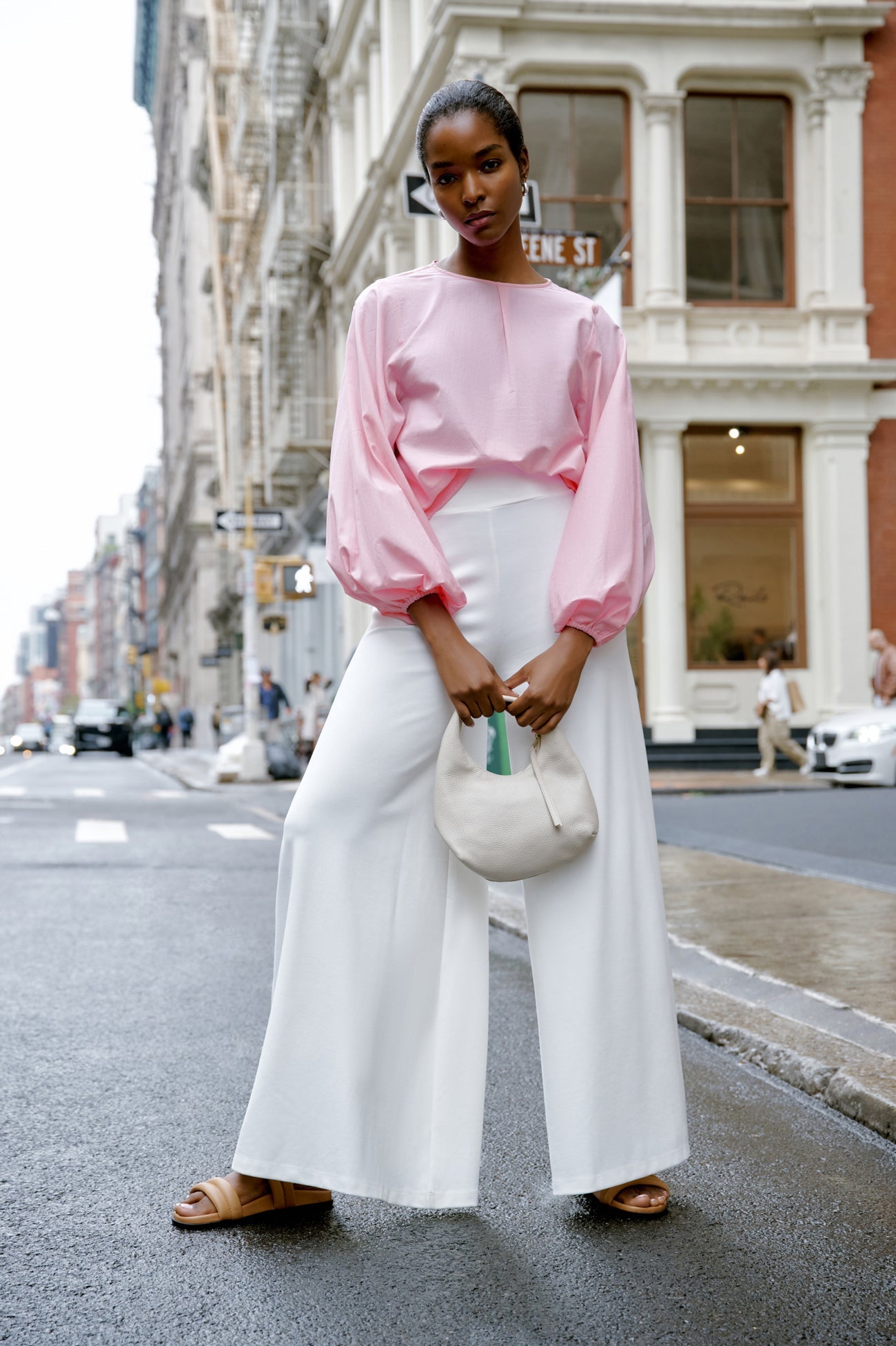 Our Joyce Top takes your style straight to cloud nine. Crafted from lightweight 100% European cotton voile. she presents a blissful silhouette finessed with crisp drapes and billowy sleeves. plus a classic round neck and a decisive pleat at the center front. Breathable and smooth against the skin. Joyce transitions between all scenes. styles. and seasons with grace.SPLIT