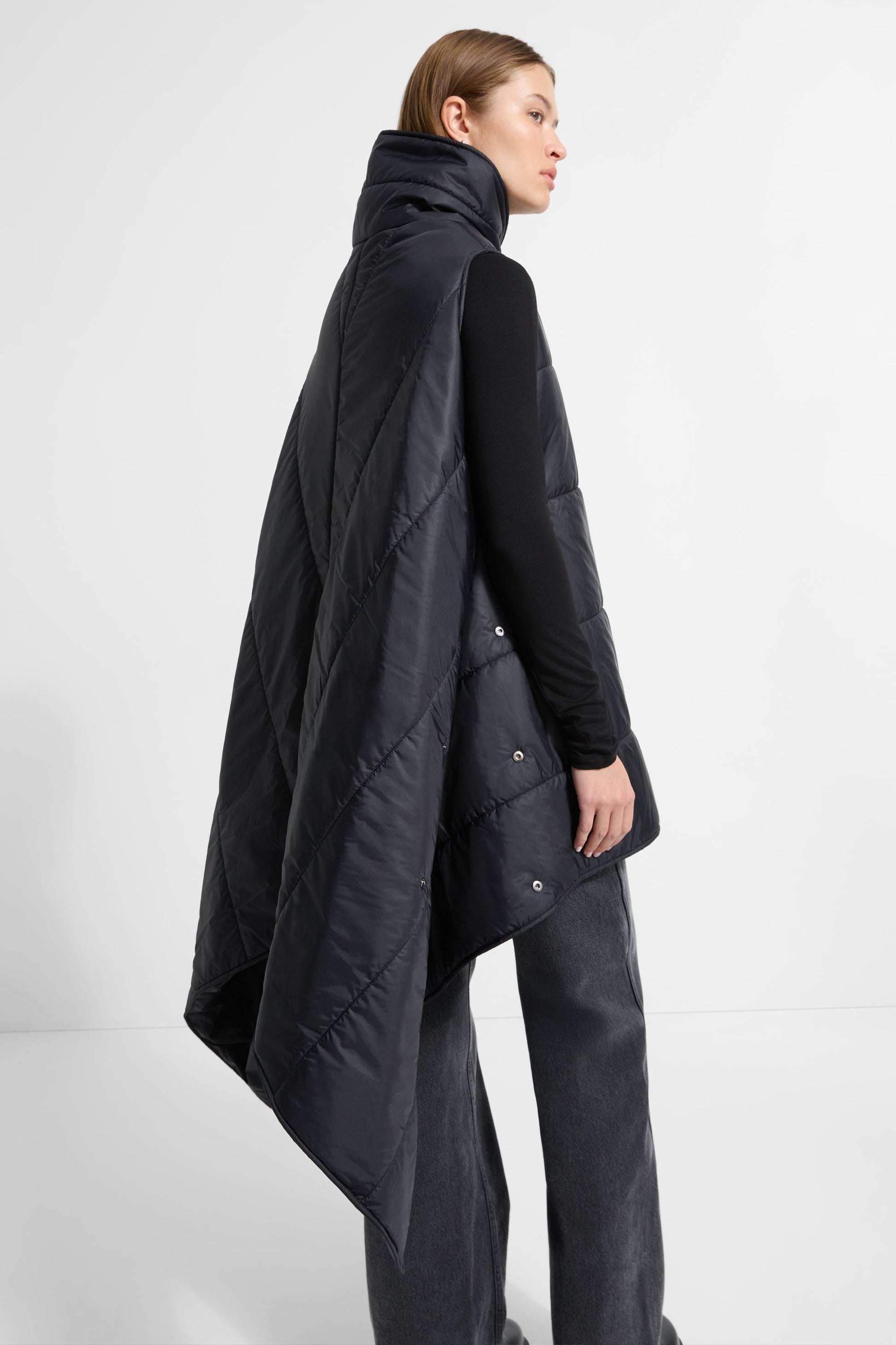 Kaja gives your classic cold-weather layer a modern makeover. Cut oversized with a statement asymmetric hem. Kaja's standout feature is her use of shapeshifting side snaps: fastened. they form pleats for a more tapered look; undone. they release into dramatic volume. Crafted from padded European puffer fabric. she's finished with an off-center metal zip and a high-back neckline.SPLIT