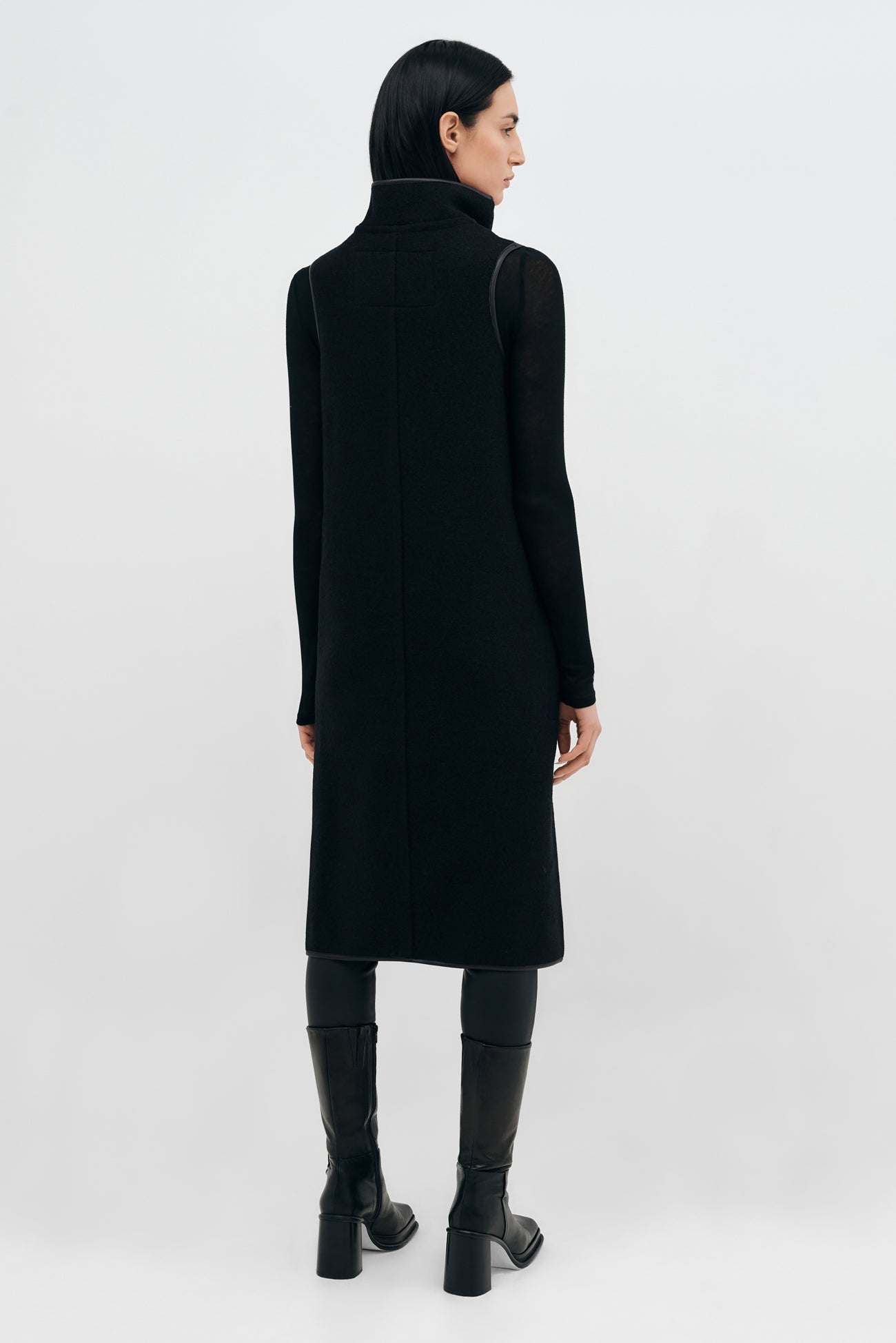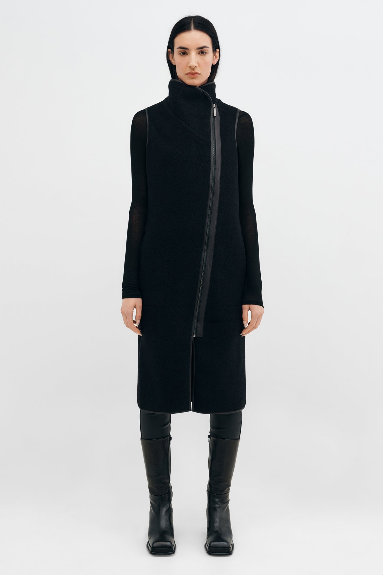Wool meets effortless cool with our Kendra Vest. Crafted in 100% soft Italian virgin wool with vegan leather trims. this knee-length vest brings polished drama with its high collar and asymmetric zip. A sharp front slit and sleek welt pockets seal the deal. Wear her once. and you'll never want to go without.SPLIT