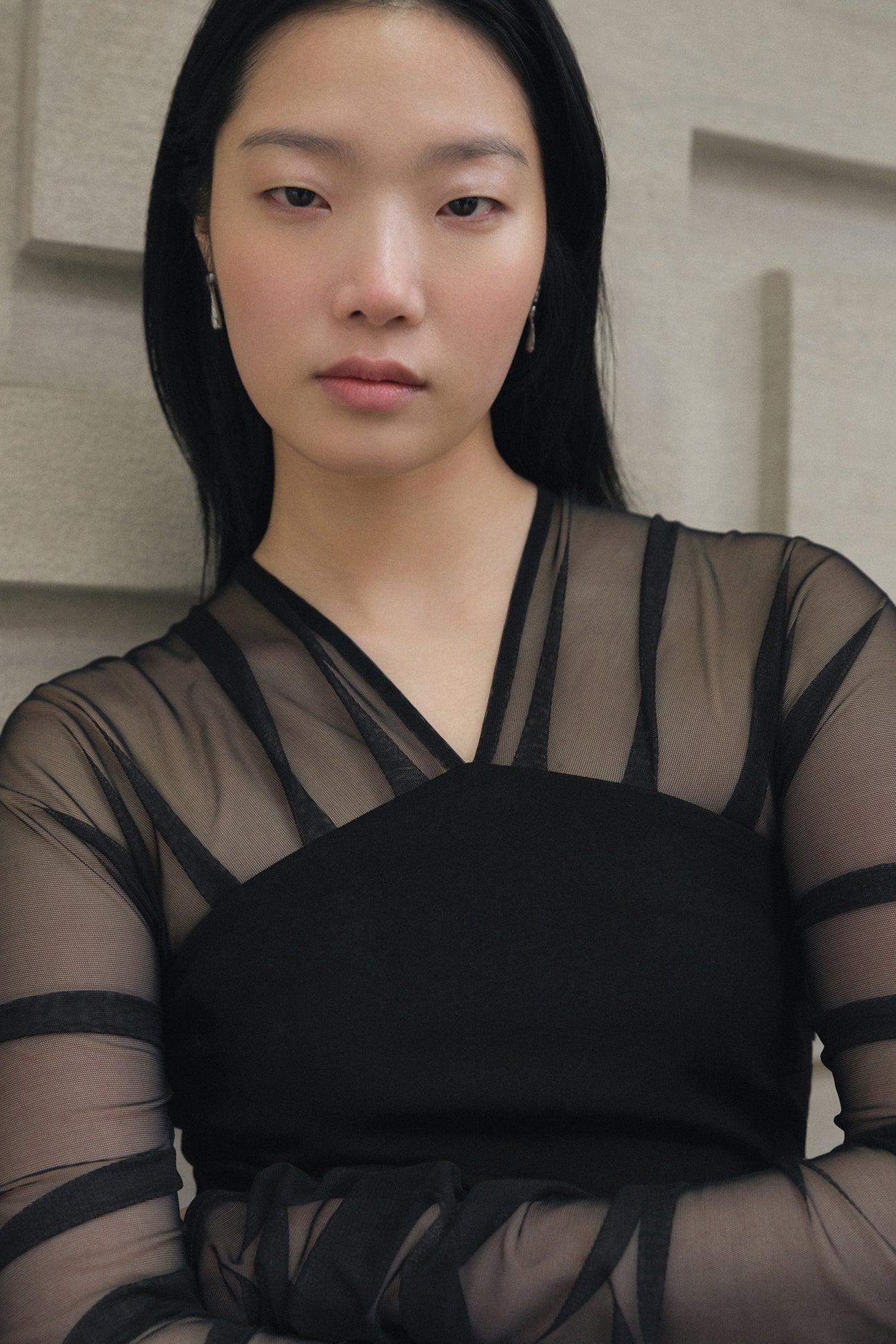 Sheer glamour in every stitch. Our Lita Top's bodice is crafted from structured European ponte. featuring tailored details and a hidden side zip for a sleek. figure-enhancing fit. Her focal point? Gathered. soft. sheer mesh sleeves that shape a V-neck front and back. adding effortless femininity and sculptural flair to your cocktail look.SPLIT