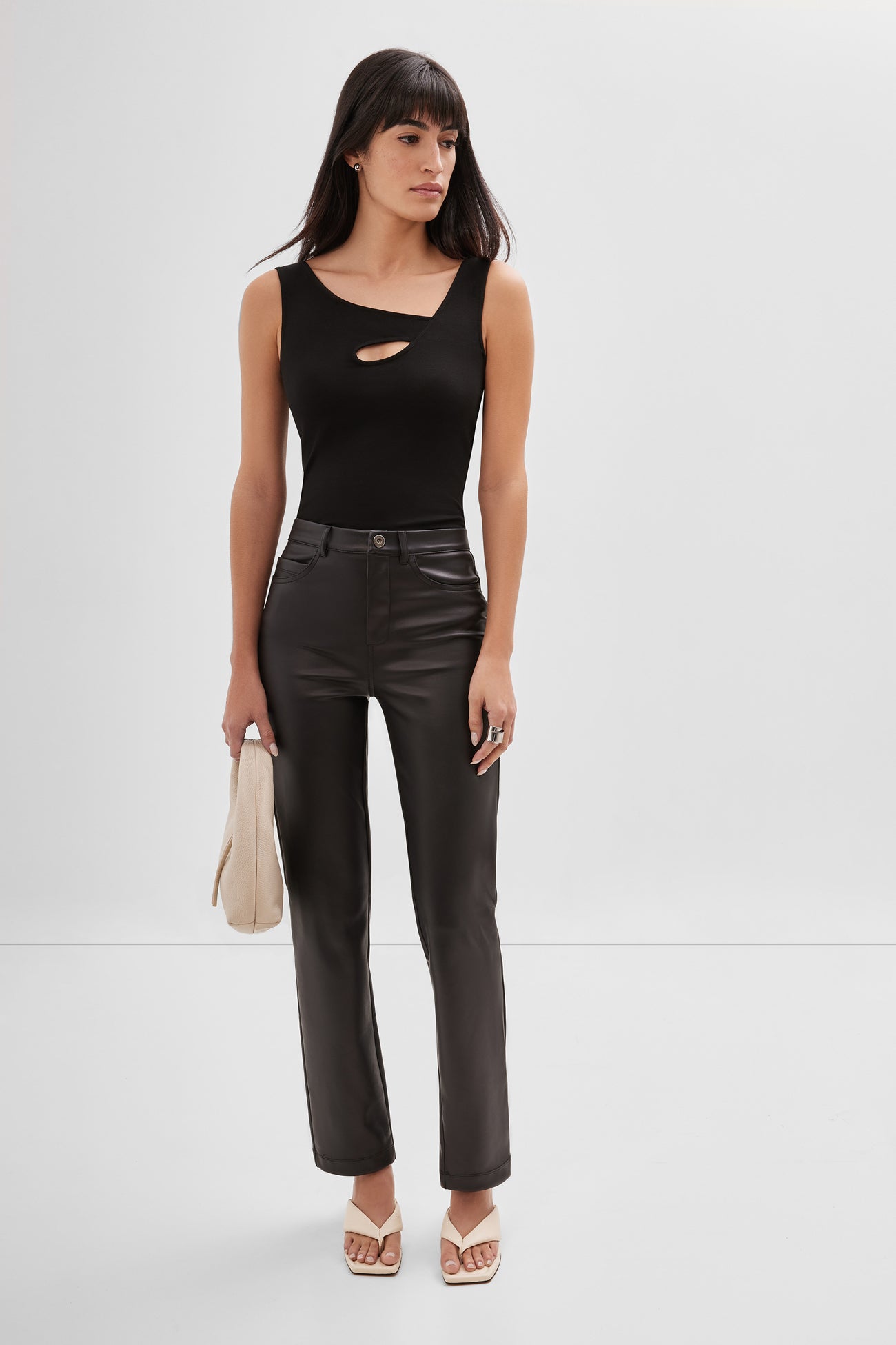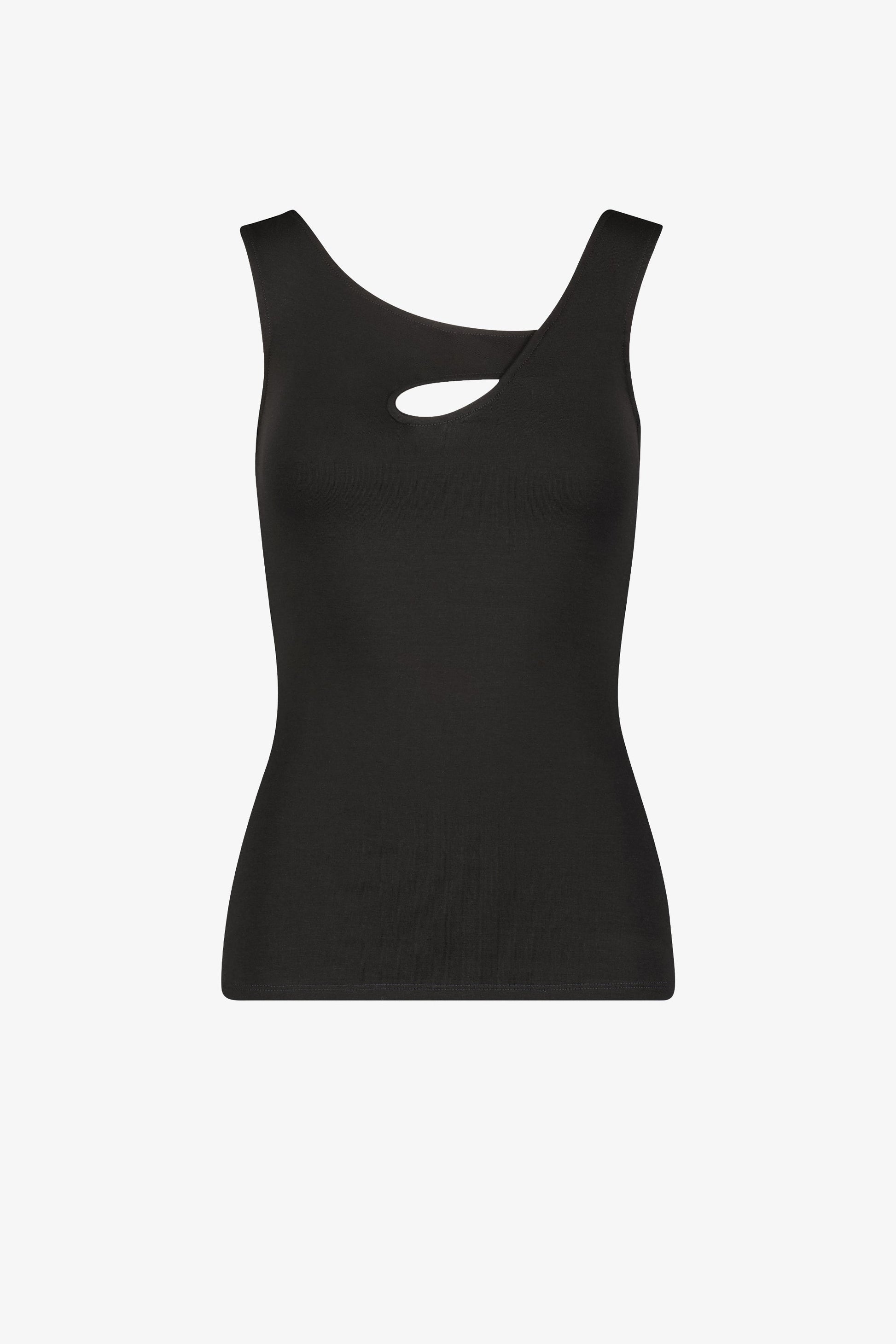 Inspired by our Noelle Top. Lotte uses similar detailing to create a unique front cutout design but with a sleeveless silhouette. Showing just the right amount of skin. this black cutout tank top is fashioned from soft. high-stretch. and sustainable European jersey. Style this asymmetric cutout top for day or night—Lotte's a dream to wear.SPLIT
