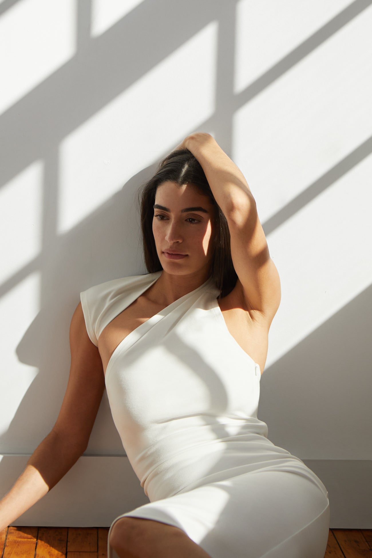 Sleeveless in the City...meet our Manhattan Sleeveless Midi. She's THE dress for both fancy invites or when you just want to look everyday sleek and unique. Fashioned from our soft. mid-stretch European ponte fabric. she features an unforgettable silhouette thanks to her one-shoulder wrap-around neckline and cap sleeve. We hope you're ready for the compliments. SPLIT