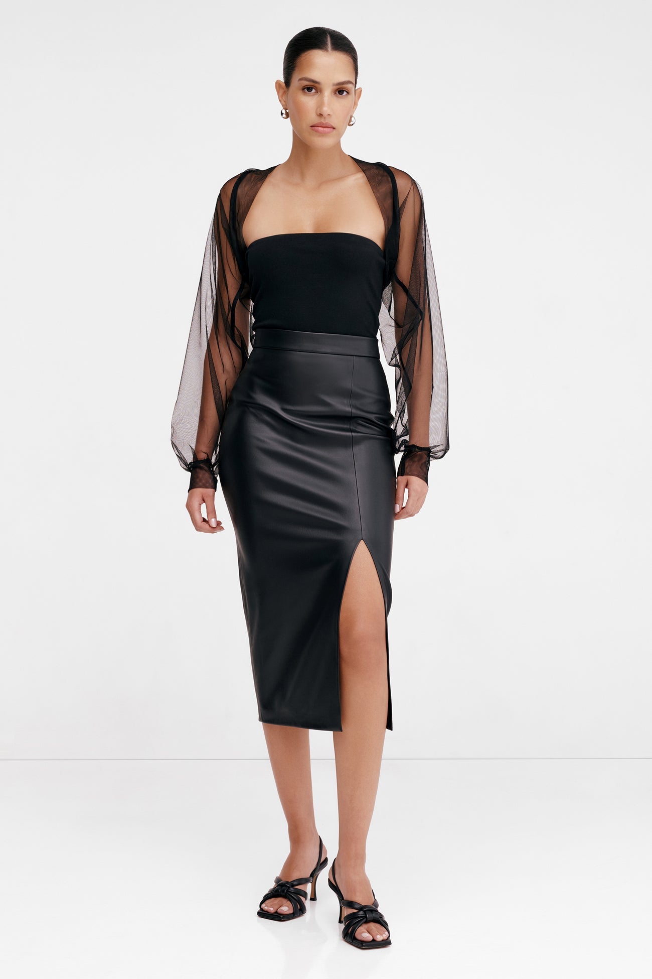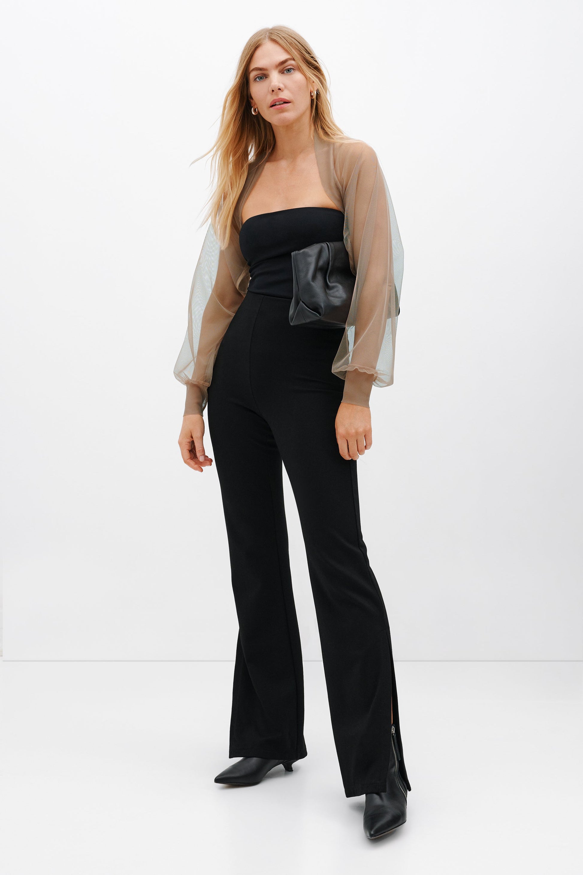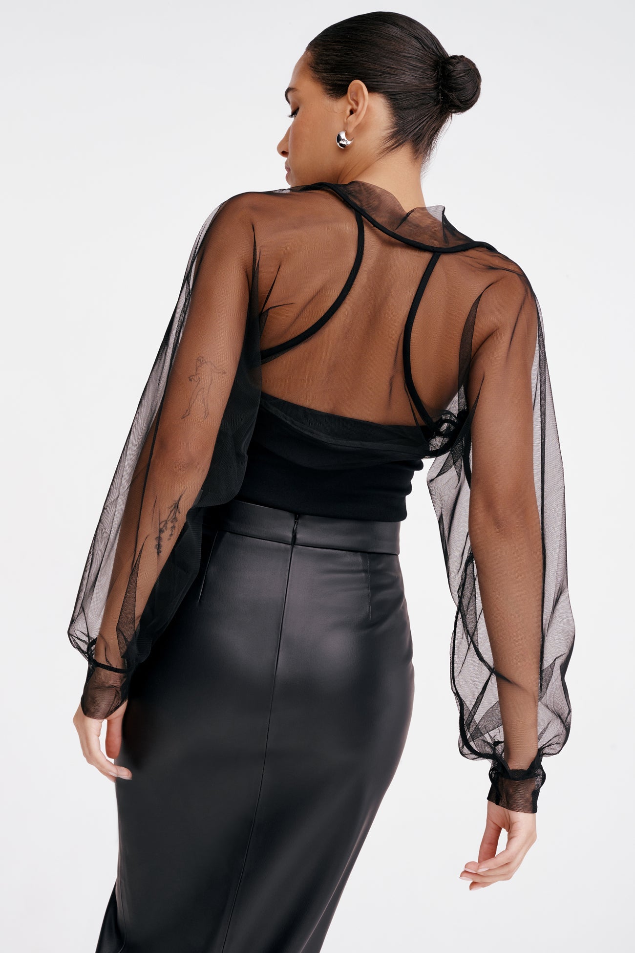 Light and airy. soft against the skin. our Olympia Bolero is a sheer bolero of pure glamour. Fashioned from premium mesh. her Juliette sleeves gather to a fitted cuff for a truly romantic silhouette. while accent seams in the back add an edgy elegance to officially go with everything in your closet. This mesh bolero shrug's THE piece to take your night-out outfit to the next level. SPLIT