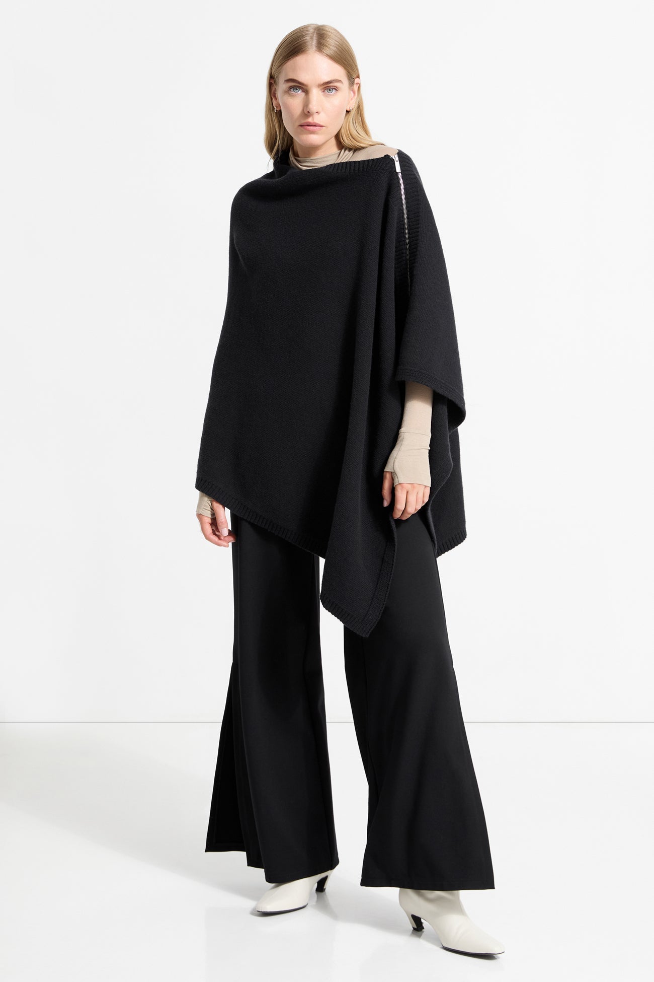 Anything's possible with our Mika Knit Cape. Spun from 100% extra-fine Italian merino wool. Mika drapes over any look with a flair for the dramatic. She's designed to be styled myriad ways depending on your mood—position her as a boatneck with the zip at the shoulder. as a v-neck with the zip centered. off the shoulder or even as a luxe blanket scarf. Mika's asymmetric hem and metal zip front give her contemporary polish. making her an instant upgrade to anything you layer her over.SPLIT