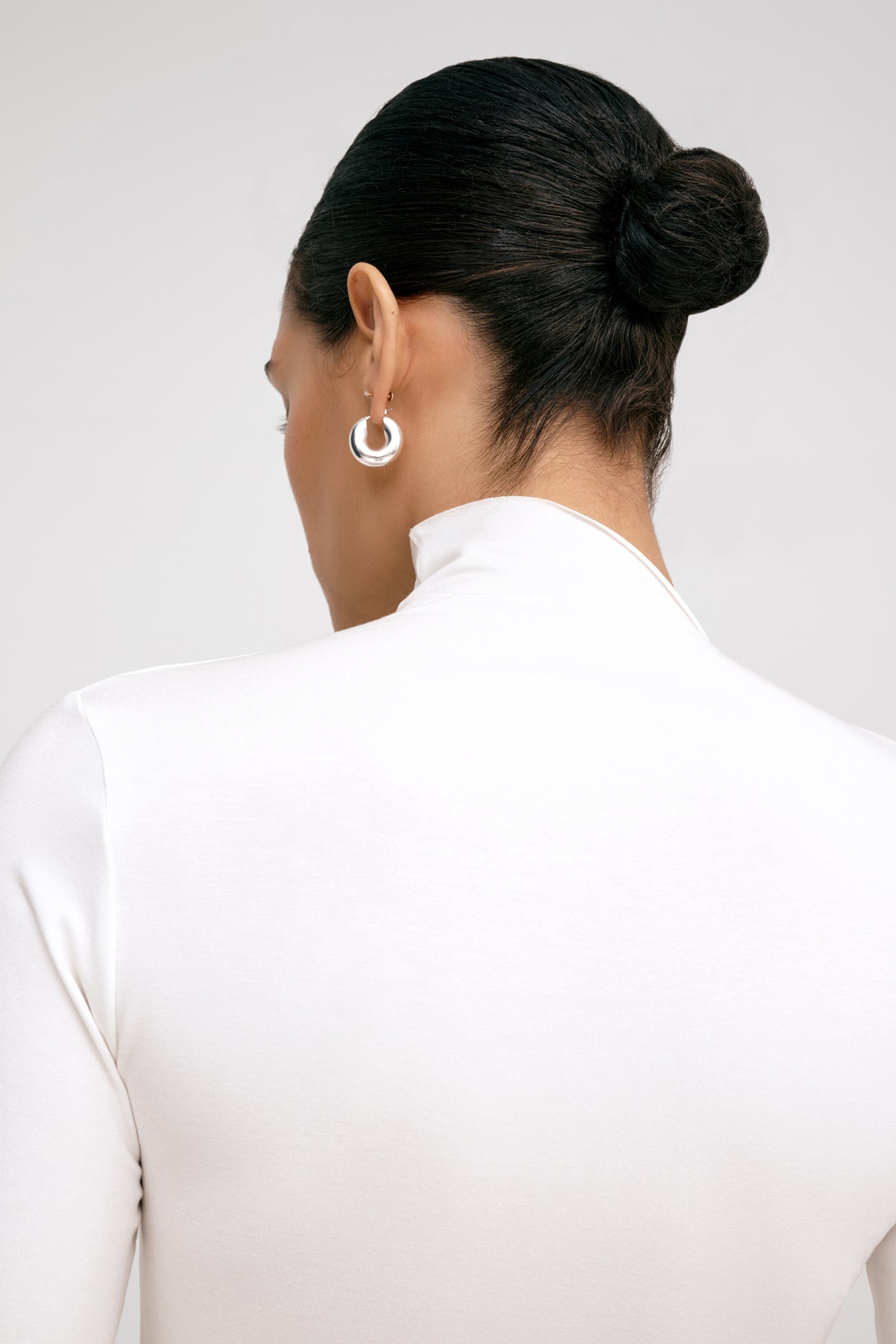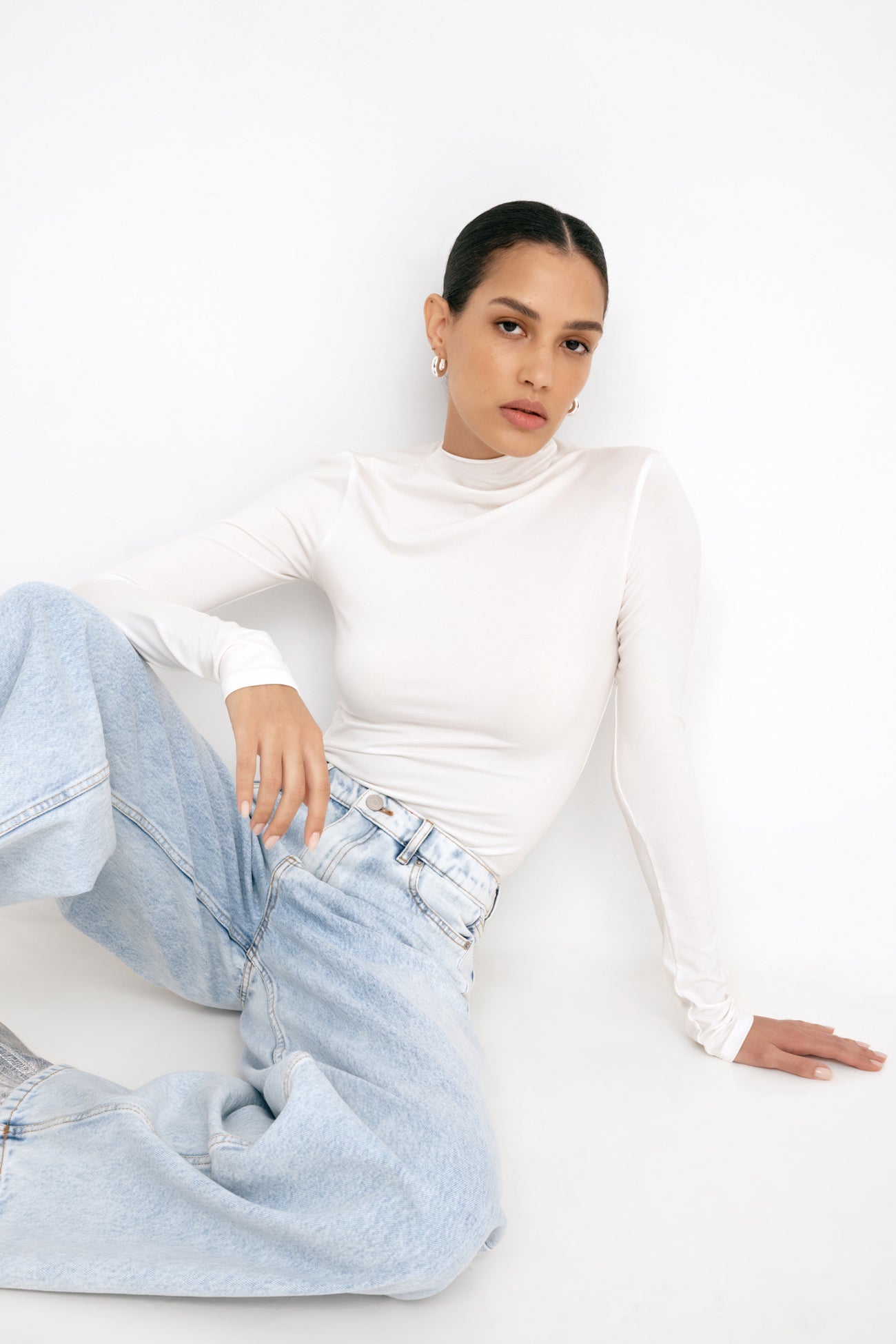 It's our Ilana Top's contemporary subtlety that makes her so outfit-changing. This long-sleeve top is crafted from soft. high-stretch and sustainable European jersey to mold perfectly and comfortably to your form. Her showpiece? The diagonal. raw-edged neckline. elevating a classic mock-neck design to a unique day-to-night essential.SPLIT