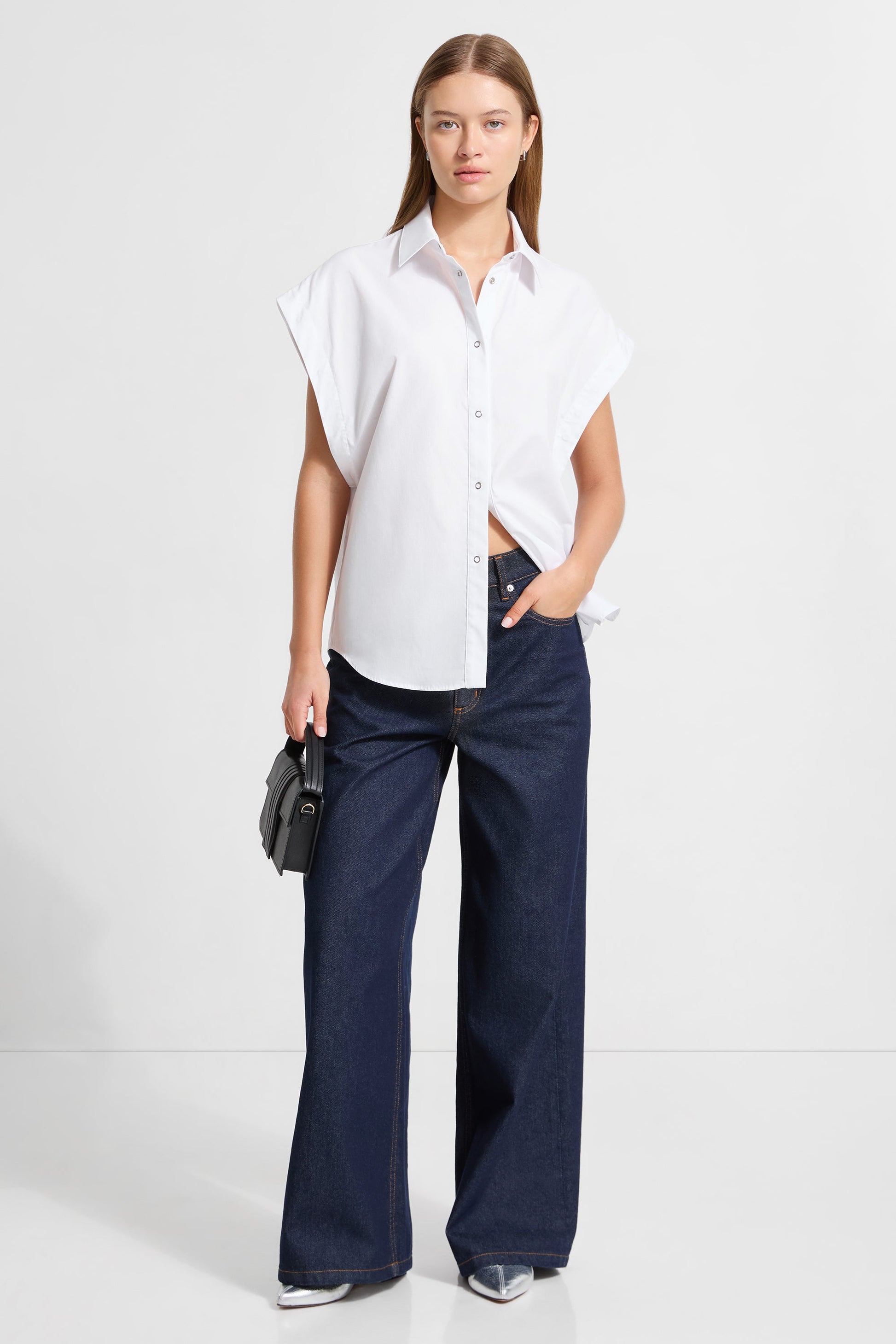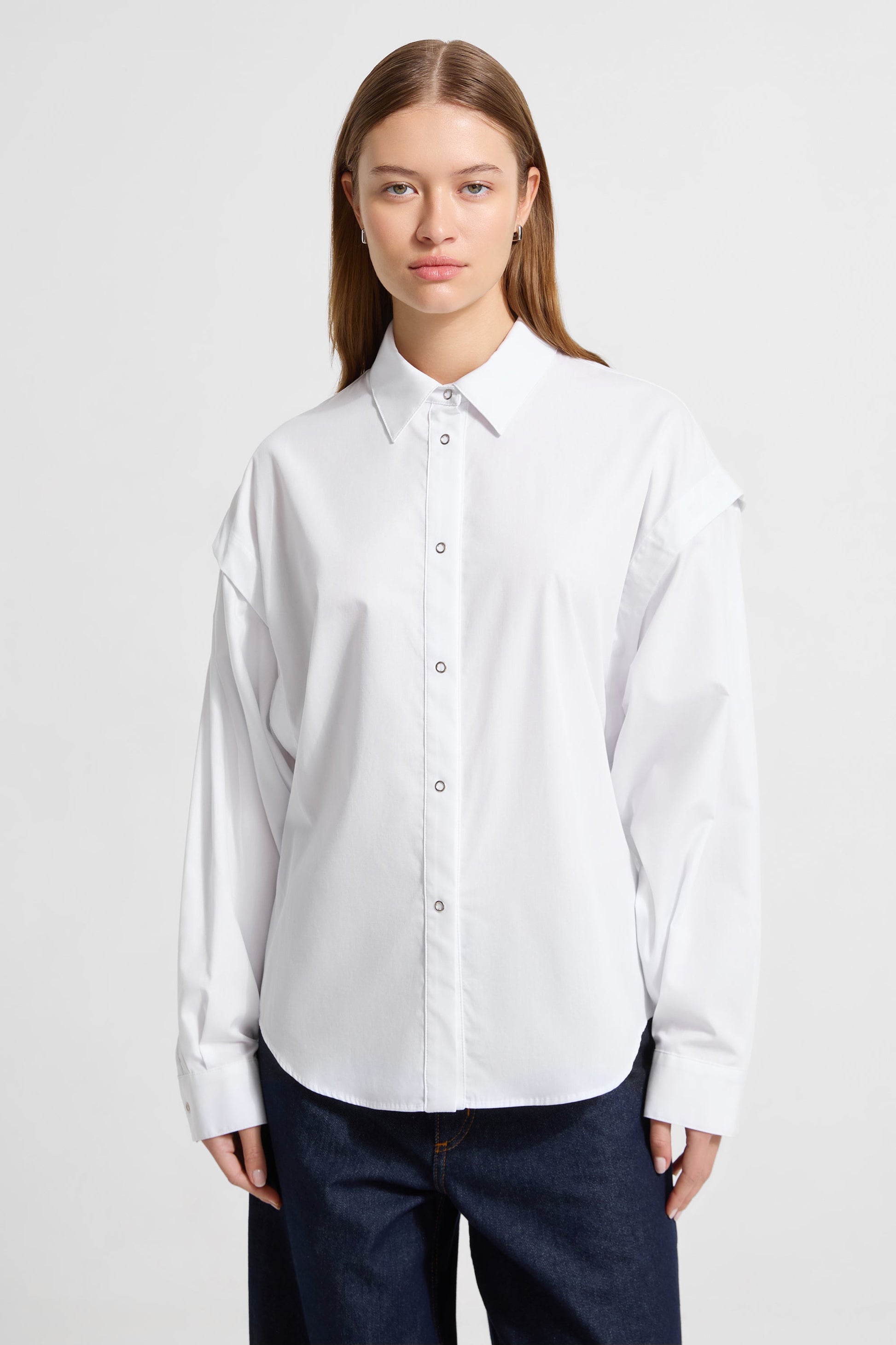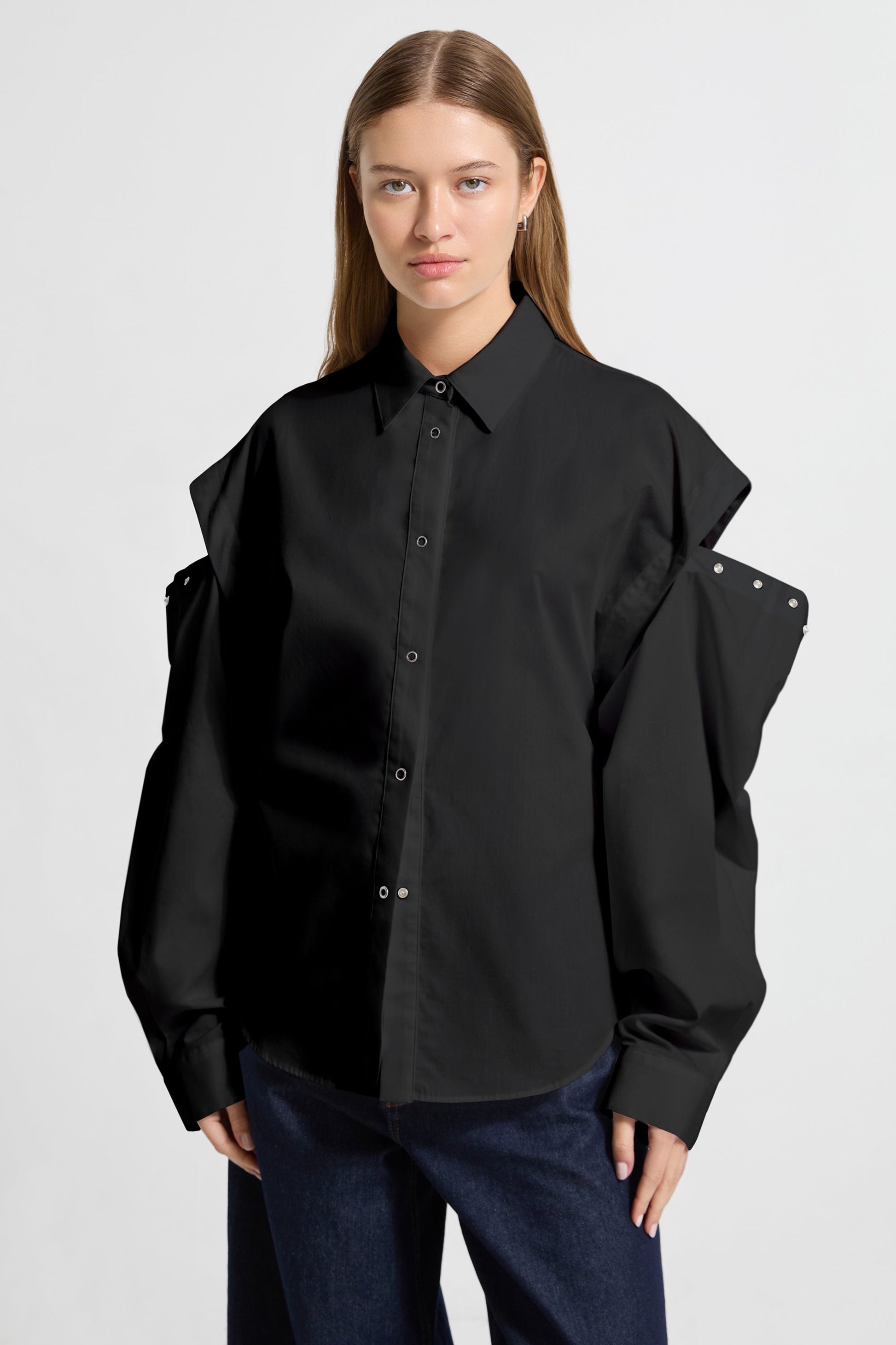 To sleeve or not to sleeve? Wick leaves it up to you. with hidden underarm snaps that allow you to switch her from long to short sleeves in seconds. Handcrafted from comfy. crisp European poplin cotton. this convertible snap button-up has a relaxed fit with traditional touches—a structured collar. finished cuffs. and front placket—for wearing everywhere and anywhere.SPLIT
