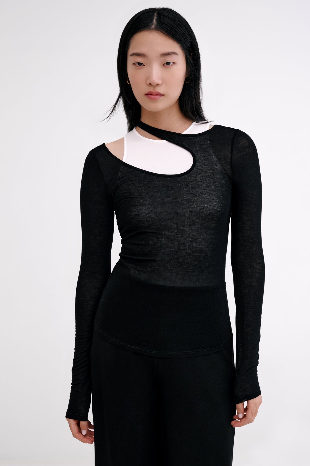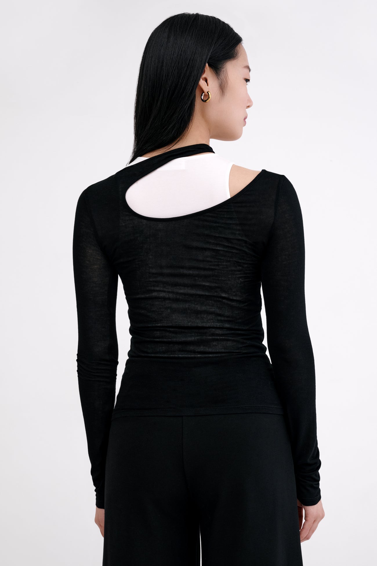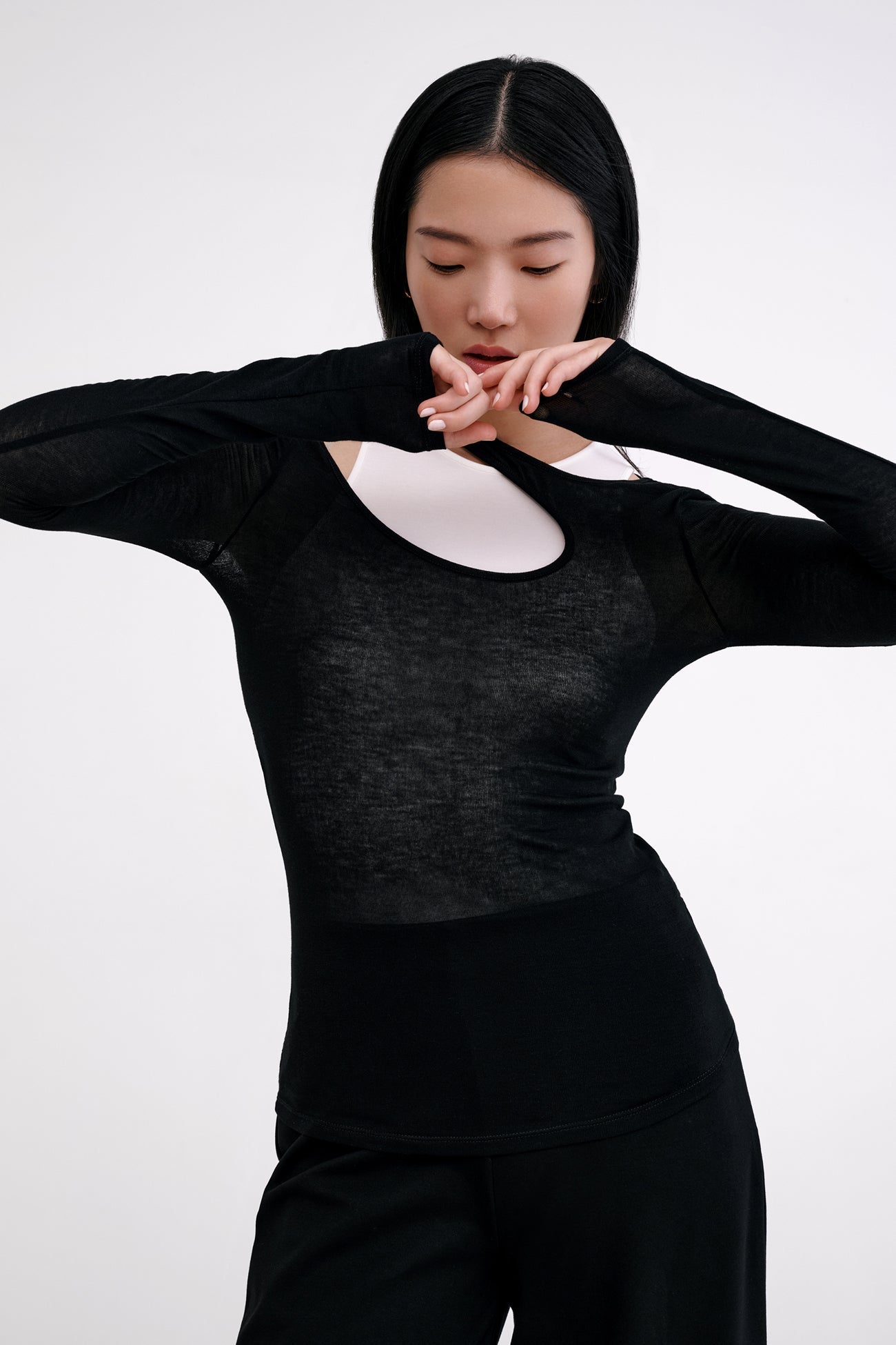 Introducing your closet's next dynamic duo. A two-piece layering set. Nya features a fitted racer tank in sustainable European jersey and a long-sleeve top in sheer European jersey. with the two silhouettes overlapping artfully due to a unique shoulder cutout. Wear them together or mix and match—Nya gives you multiple ways to dress up or down.SPLIT