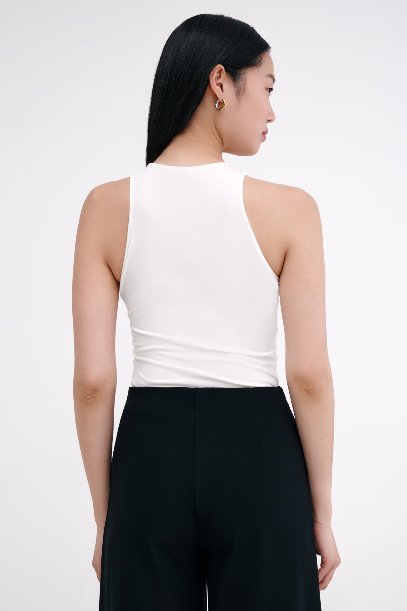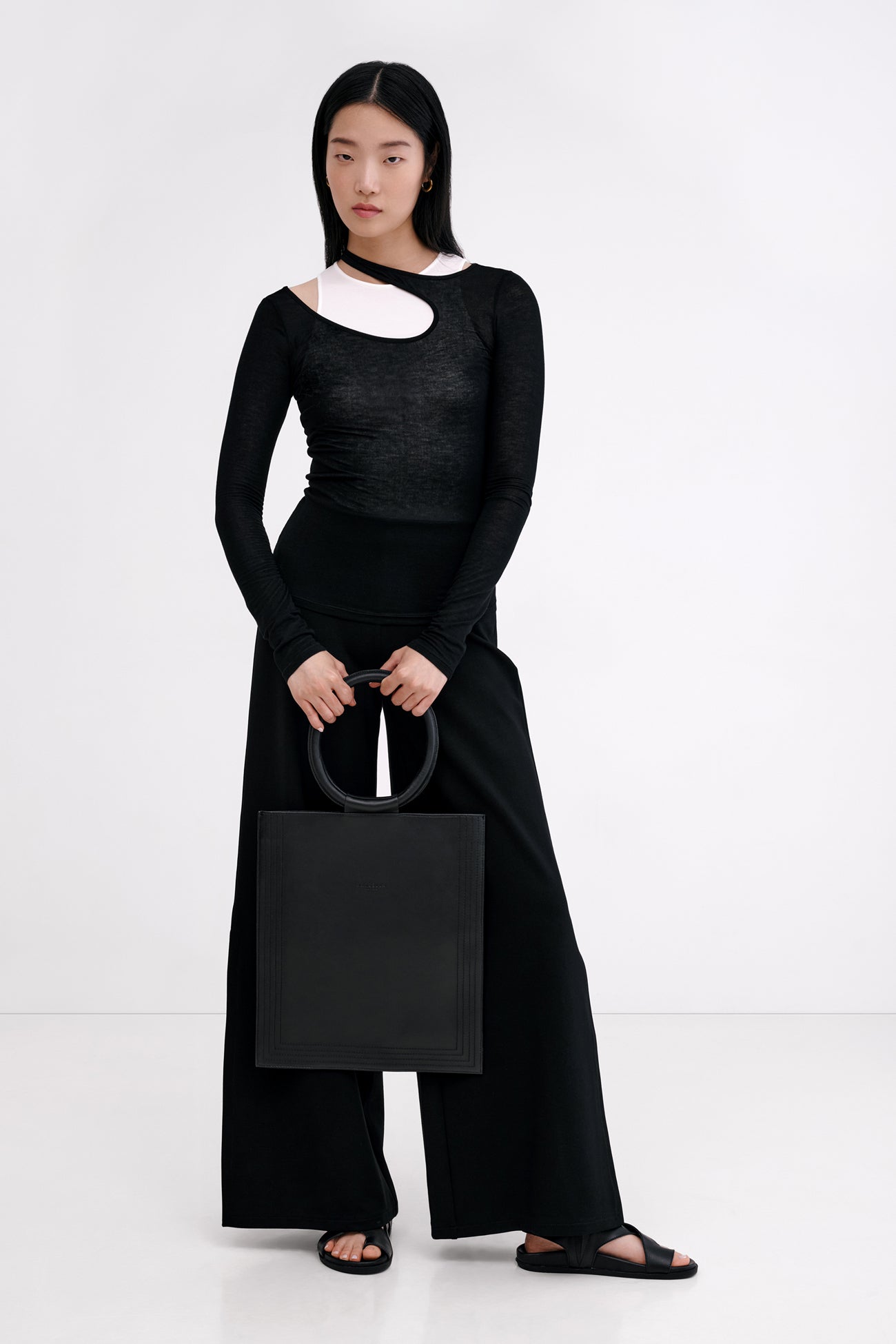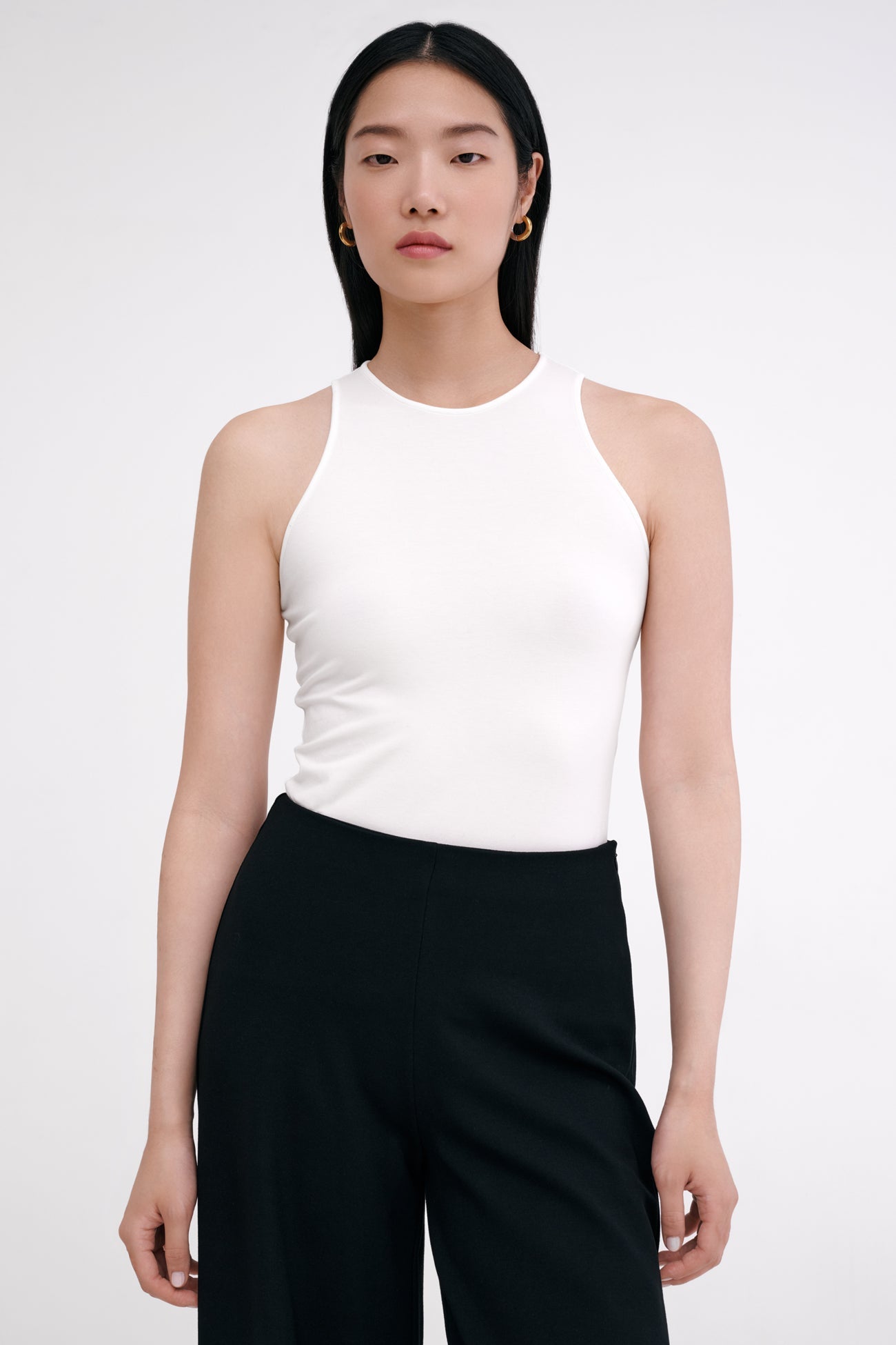 Introducing your closet's next dynamic duo. A two-piece layering set. Nya features a fitted racer tank in sustainable European jersey and a long-sleeve top in sheer European jersey. with the two silhouettes overlapping artfully due to a unique shoulder cutout. Wear them together or mix and match—Nya gives you multiple ways to dress up or down.SPLIT