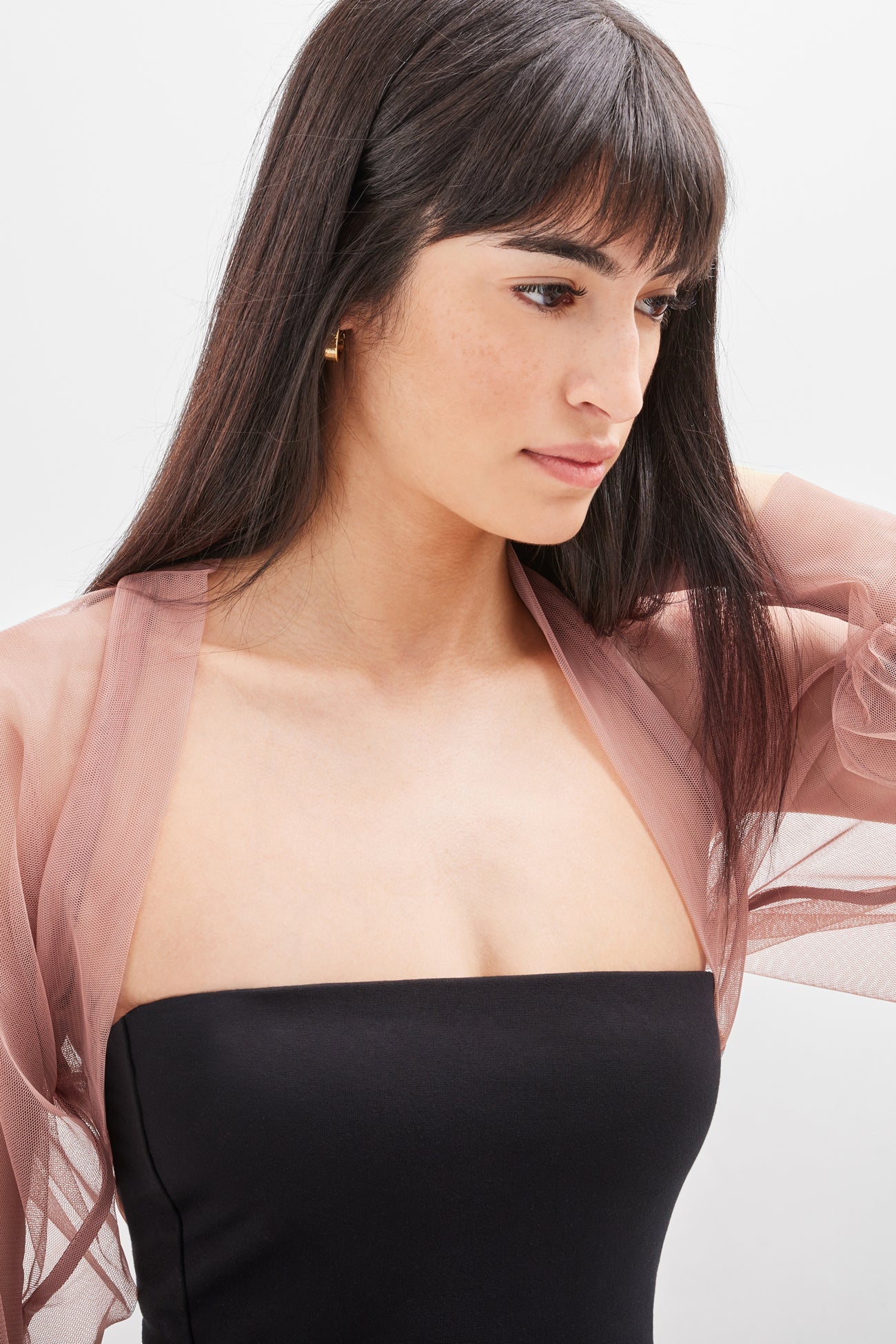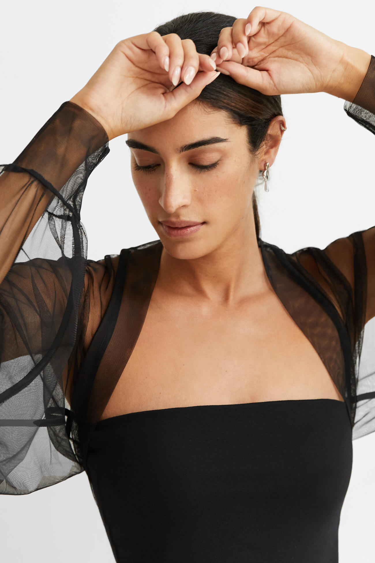 Light and airy. soft against the skin. our Olympia Bolero is a sheer bolero of pure glamour. Fashioned from premium mesh. her Juliette sleeves gather to a fitted cuff for a truly romantic silhouette. while accent seams in the back add an edgy elegance to officially go with everything in your closet. This mesh bolero shrug's THE piece to take your night-out outfit to the next level. SPLIT