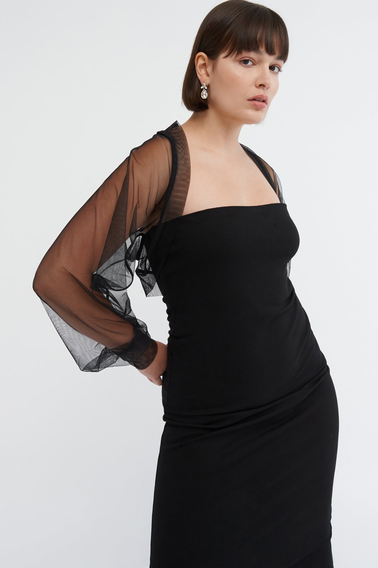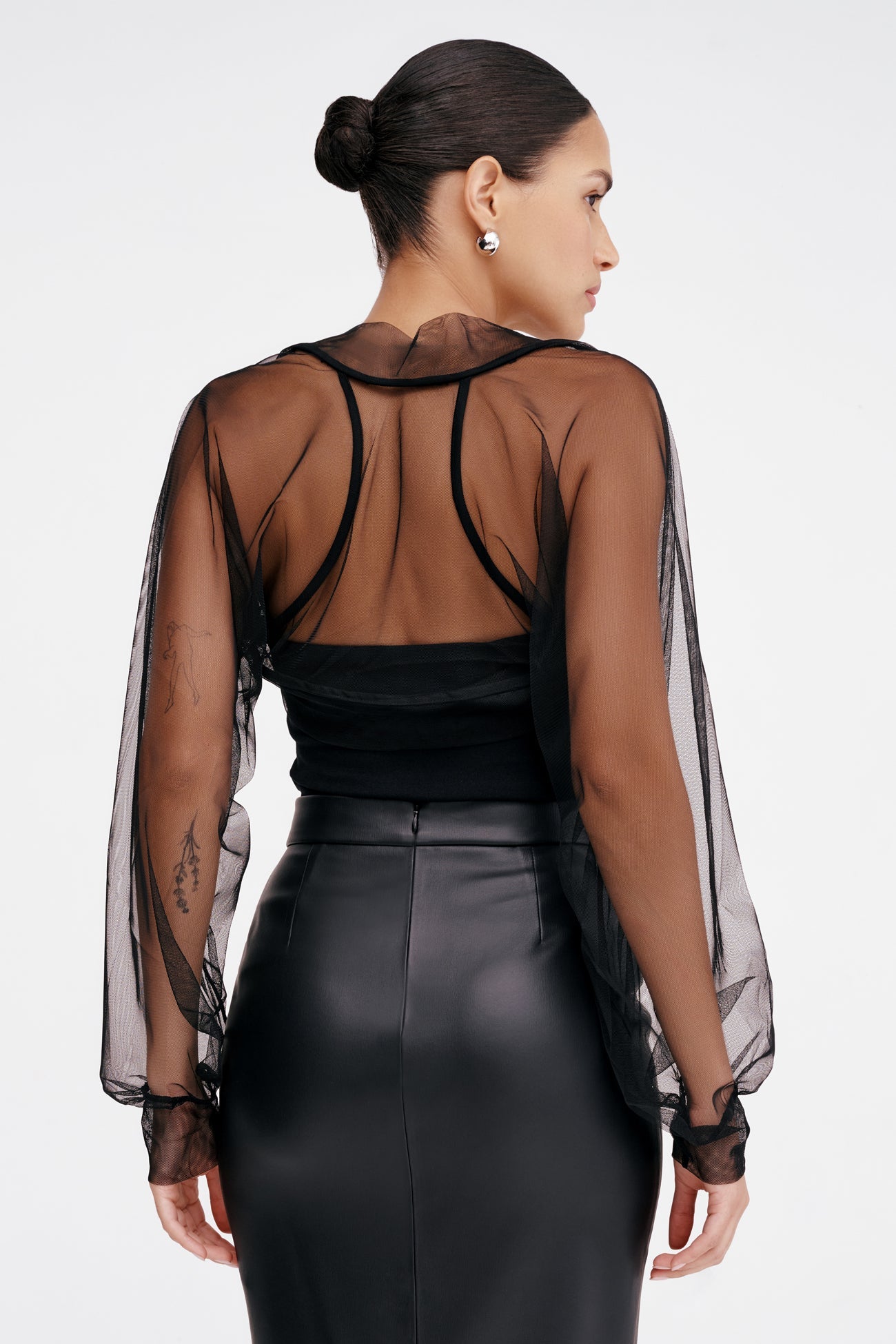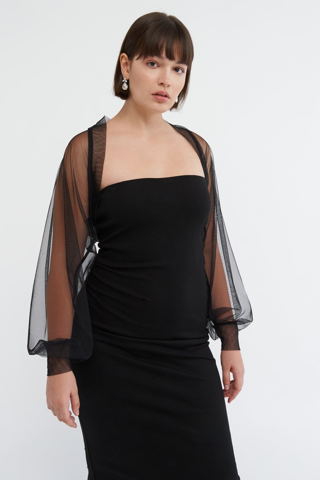 Light and airy. soft against the skin. our Olympia Bolero is a sheer bolero of pure glamour. Fashioned from premium mesh. her Juliette sleeves gather to a fitted cuff for a truly romantic silhouette. while accent seams in the back add an edgy elegance to officially go with everything in your closet. This mesh bolero shrug's THE piece to take your night-out outfit to the next level.SPLIT