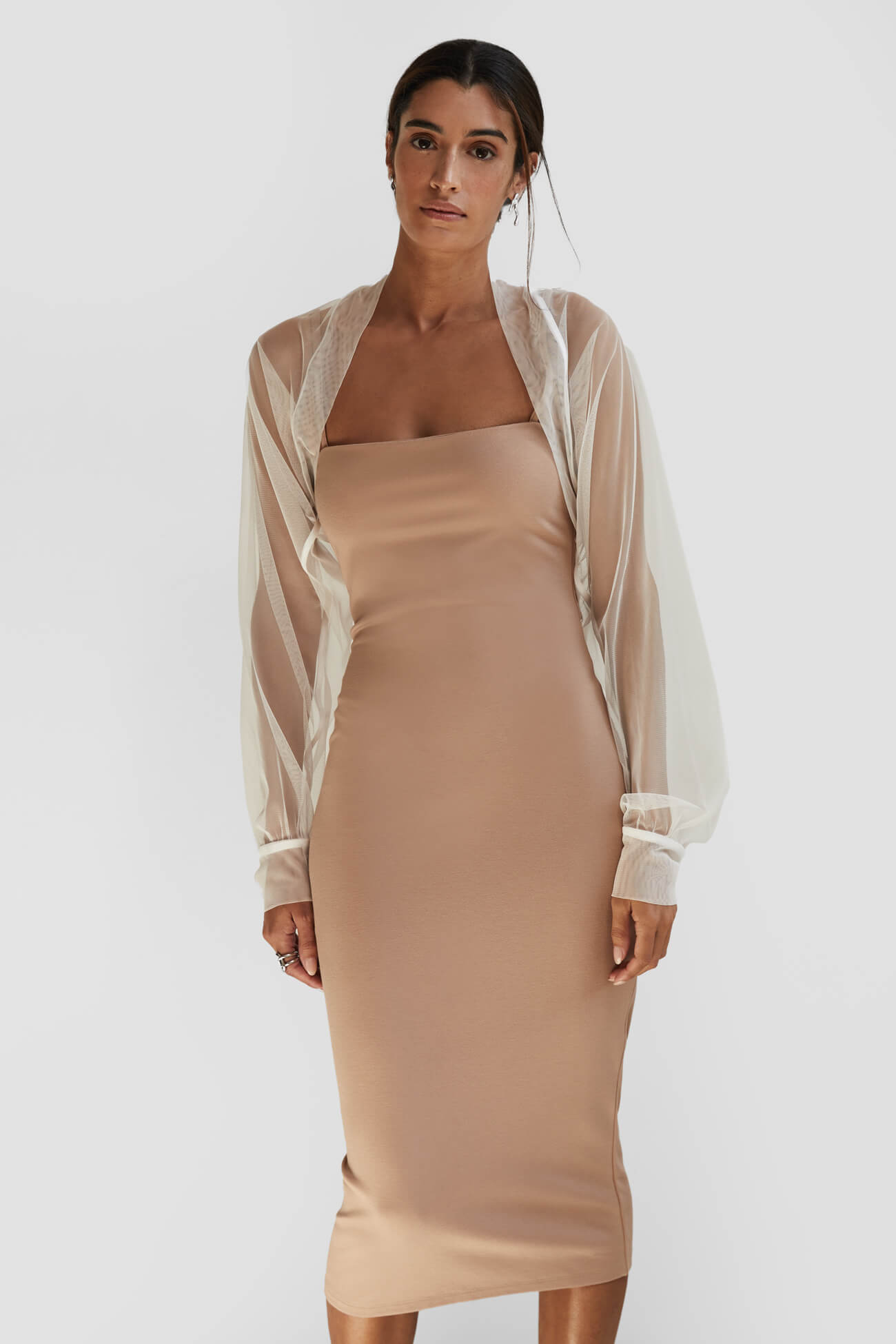 Light and airy. soft against the skin. our Olympia Bolero is a sheer bolero of pure glamour. Fashioned from premium mesh. her Juliette sleeves gather to a fitted cuff for a truly romantic silhouette. while accent seams in the back add an edgy elegance to officially go with everything in your closet. This mesh bolero shrug's THE piece to take your night-out outfit to the next level.SPLIT