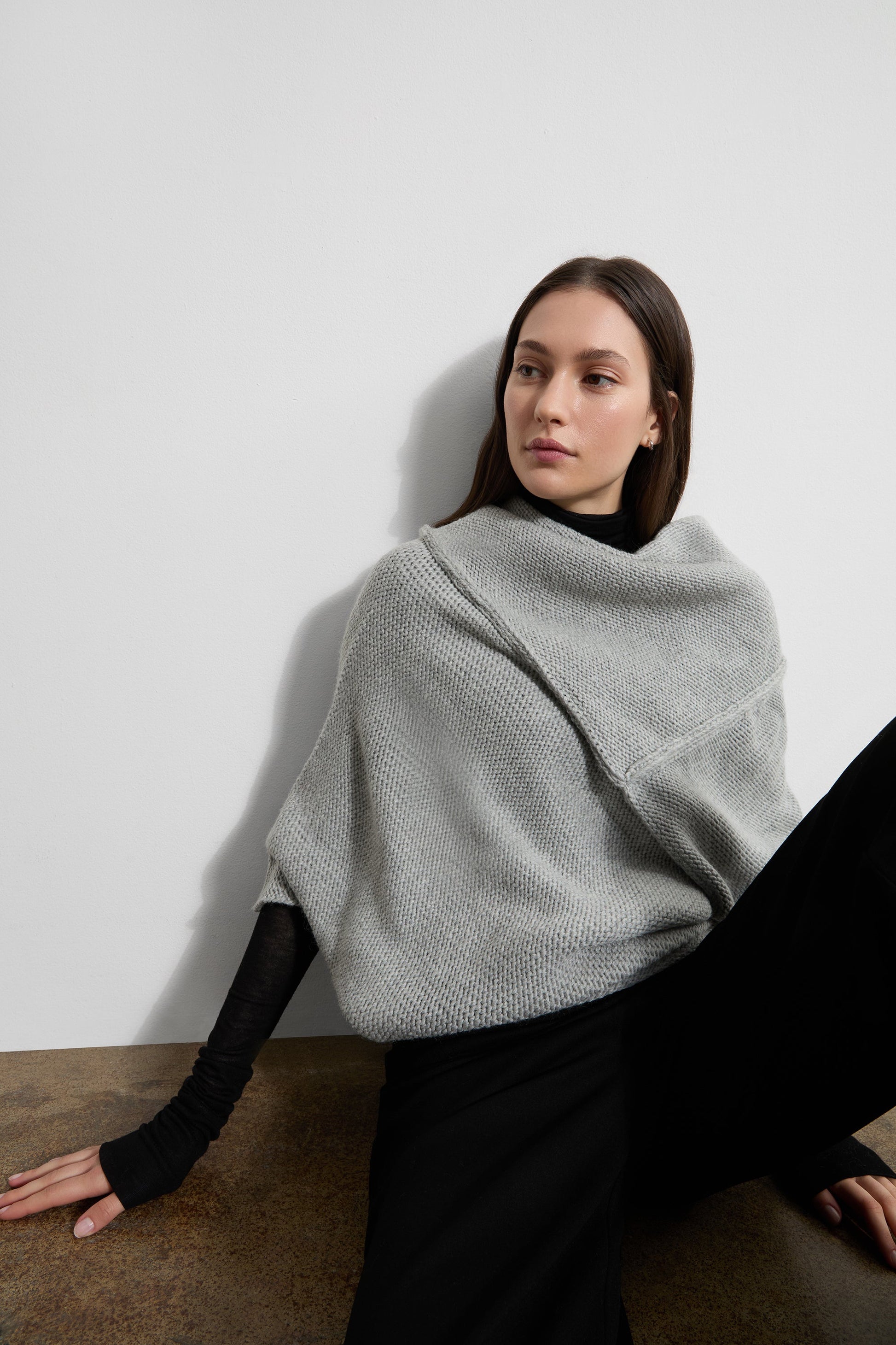A cozy French wool-blend cover-up. our Palmer Knit Top features an asymmetric design with a high neckline at the front. and a v-neck at the back. Raised seam detailing creates geometric lines and adds visual interest to her divine knit texture. With a cropped length and half-length batwing sleeves. Palmer is designed to be layered over your go-to tops (we love it with the Sheer Addy). Perfect for shifting seasons. SPLIT