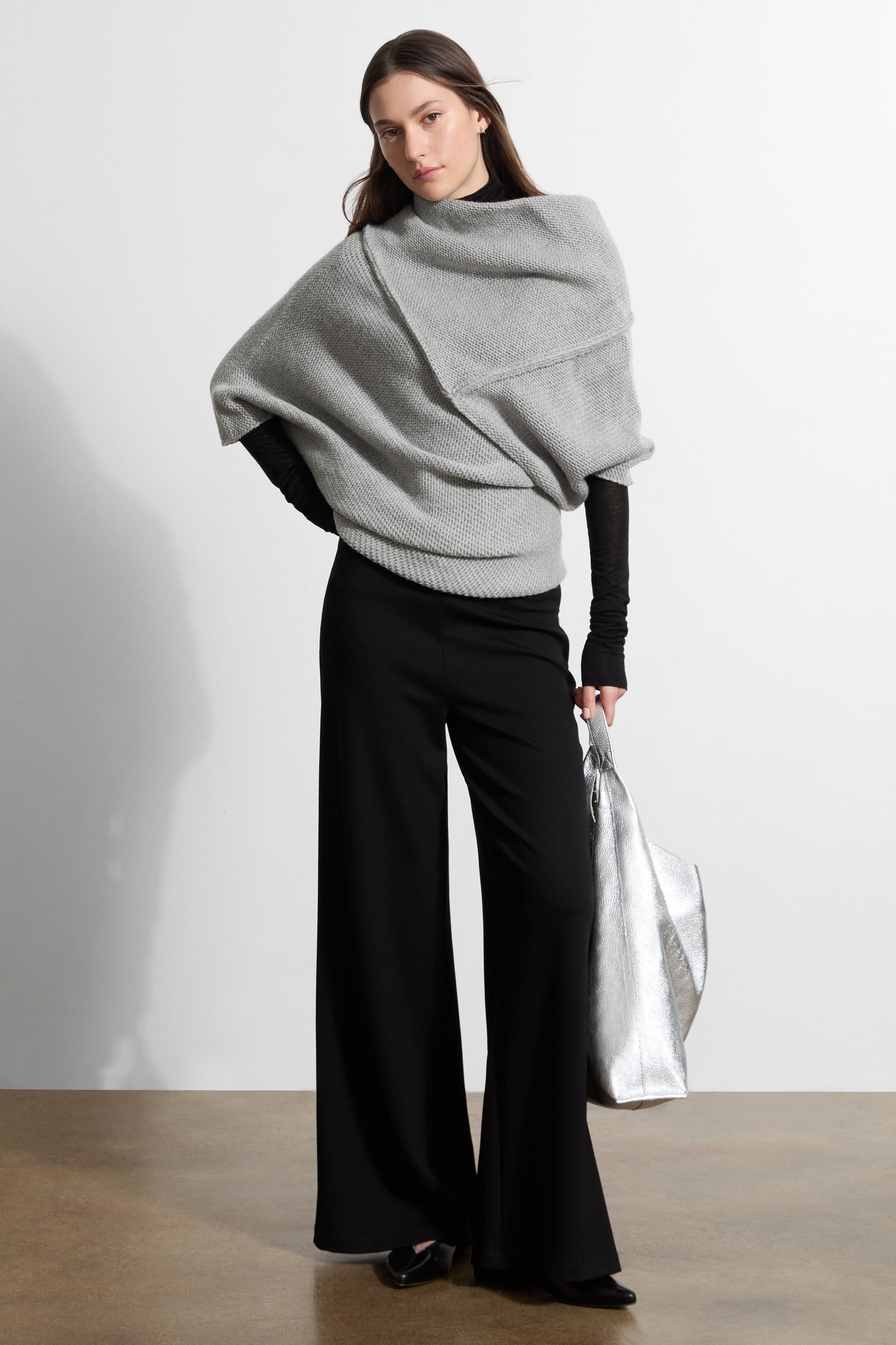 A cozy French wool-blend cover-up. our Palmer Knit Top features an asymmetric design with a high neckline at the front. and a v-neck at the back. Raised seam detailing creates geometric lines and adds visual interest to her divine knit texture. With a cropped length and half-length batwing sleeves. Palmer is designed to be layered over your go-to tops (we love it with the Sheer Addy). Perfect for shifting seasons. SPLIT